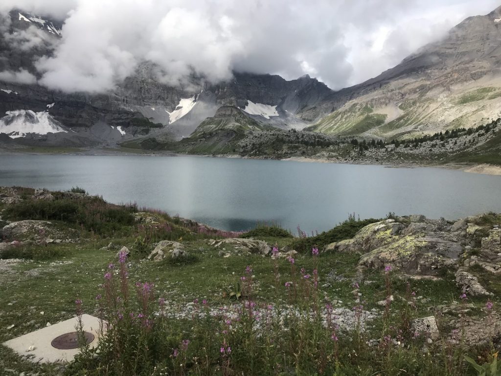 J’hésite à boire quelque chose à l’Auberge de Salanfe, mais je suis en forme et les muscles chauds alors je préfère ne pas m’arrêter. Le chemin continue en longeant le lac à plat, avant de bifurquer vers le col du Susanfe tout là-haut un peu caché dans les nuages, la météo annonce que le ciel va se dégager vers midi, mais pour l’instant tous les sommets environnants sont cachés.