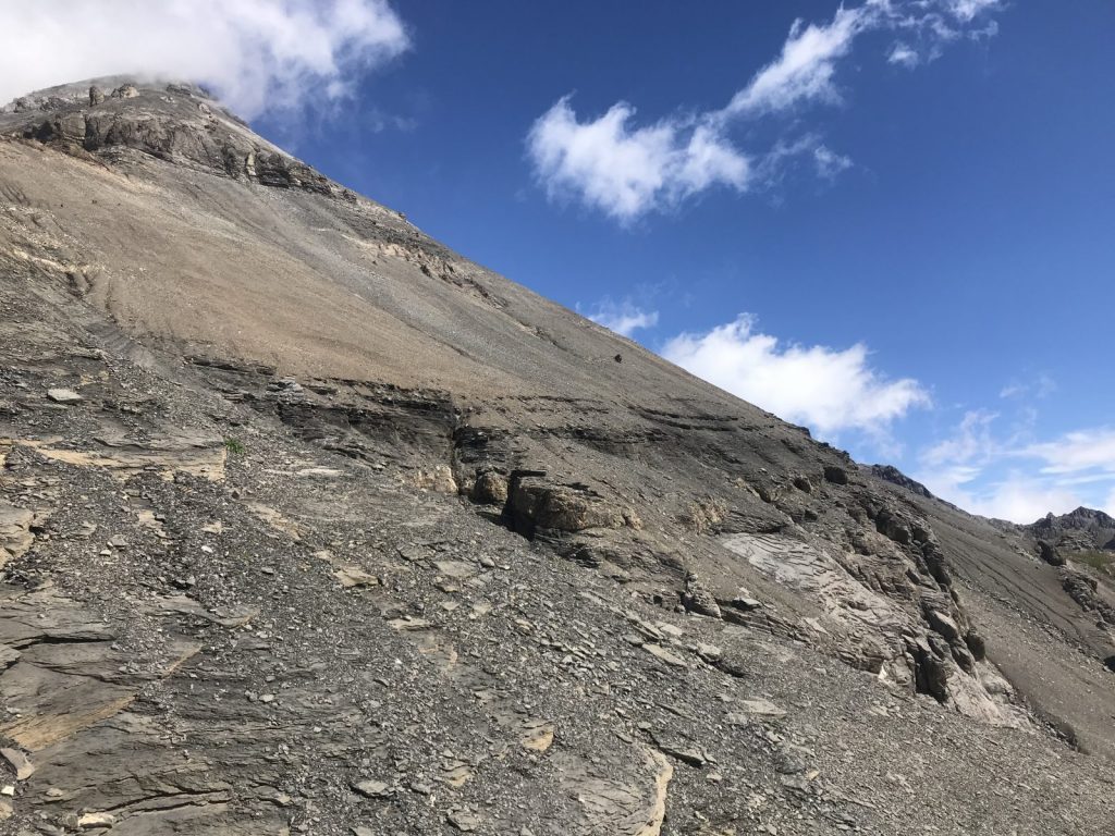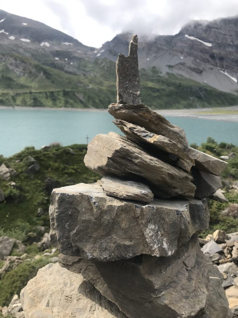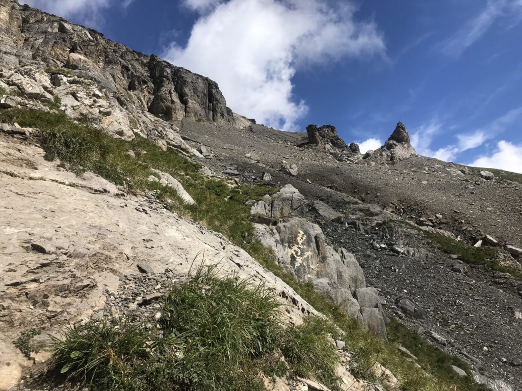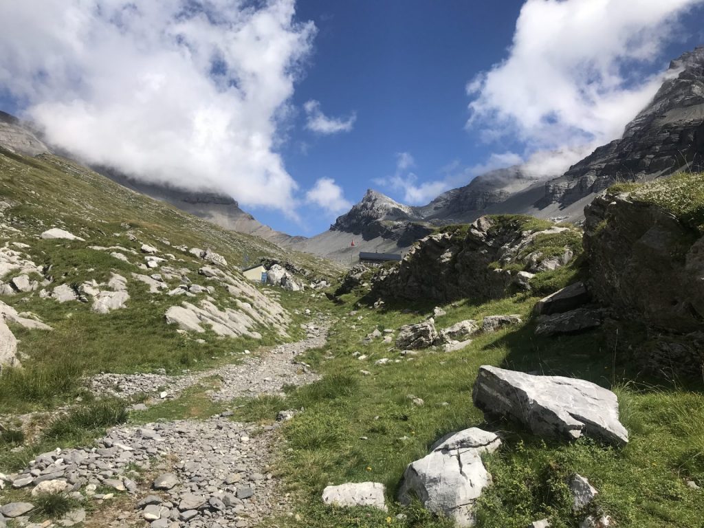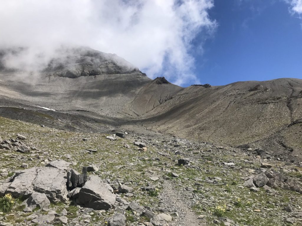 Longue montée, d’abord à travers des alpages, puis le paysage change, devient rocailleux et les premières difficultés, un couloir avec chaines qui me met mal à l’aise. Je n’ai vu ni croisé personne depuis le départ du lac, je continue en gardant à l’esprit que je peux toujours faire demi-tour si jamais. Le sentier continue de monter raide et le paysage devient lunaire plus je me rapproche du col. Je passe un bivouac genre capsule lunaire qui semble permanent, blotti derrière un rocher et atteint le col (2493) avec une impression mais qu’est-ce que je fais là. Depuis là, je vois le chemin qui conduit à la Haute Cime, plutôt bien fréquenté. Bon ce ne sera pas pour moi aujourd’hui. Le vent souffle fort, les nuages bas cachent le soleil, autant dire que je ne m’attarde pas. La descente mène rapidement du paysage lunaire aux prairies et bien abritée derrière un gros rocher, je retrouve le soleil et mes esprits. Je mange mon pique-nique avec plaisir, il faut dire que c’est la première pause depuis mon départ, hormis un arrêt barre de céréales au bout du lac avant la montée vers le col.