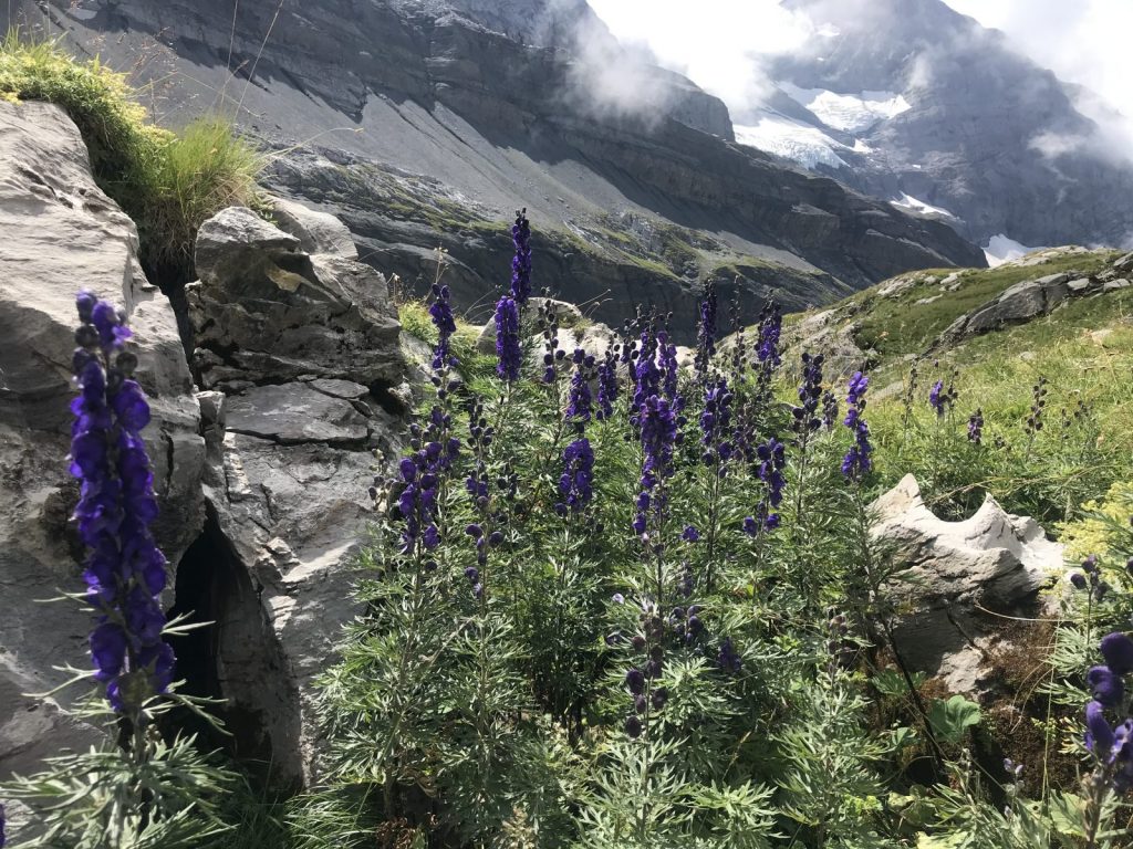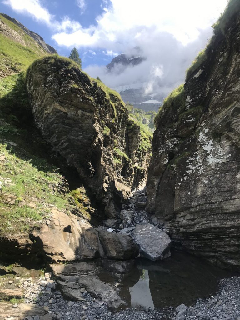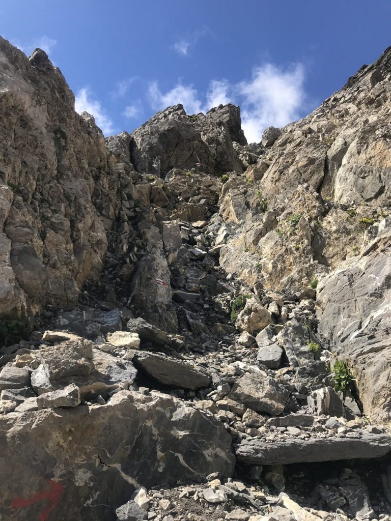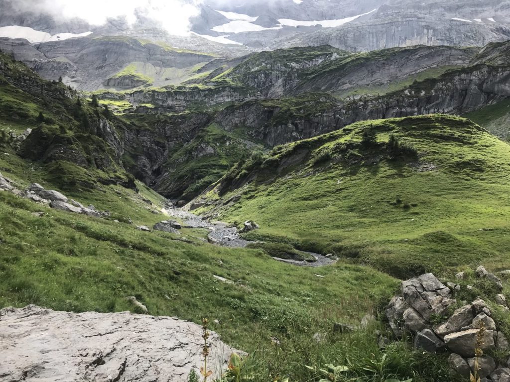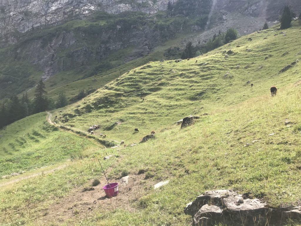 Longue montée, d’abord à travers des alpages, puis le paysage change, devient rocailleux et les premières difficultés, un couloir avec chaines qui me met mal à l’aise. Je n’ai vu ni croisé personne depuis le départ du lac, je continue en gardant à l’esprit que je peux toujours faire demi-tour si jamais. Le sentier continue de monter raide et le paysage devient lunaire plus je me rapproche du col. Je passe un bivouac genre capsule lunaire qui semble permanent, blotti derrière un rocher et atteint le col (2493) avec une impression mais qu’est-ce que je fais là. Depuis là, je vois le chemin qui conduit à la Haute Cime, plutôt bien fréquenté. Bon ce ne sera pas pour moi aujourd’hui. Le vent souffle fort, les nuages bas cachent le soleil, autant dire que je ne m’attarde pas. La descente mène rapidement du paysage lunaire aux prairies et bien abritée derrière un gros rocher, je retrouve le soleil et mes esprits. Je mange mon pique-nique avec plaisir, il faut dire que c’est la première pause depuis mon départ, hormis un arrêt barre de céréales au bout du lac avant la montée vers le col.