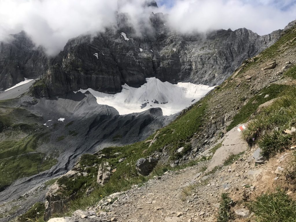 Je reprends ma route et le sentier serpente à travers prairies et je croise quelques personnes qui montent à la Cabane pour la nuit. Après le Pas d’Encel, le sentier est partiellement exposé, avec des chaînes et relativement glissant (versant nord). Ma concentration est au maximum et j’ai toutes mes sensations, je ne me laisse même pas distraire par les nombreux trailers qui me dépassent en courant ! Il y a vraiment un monde entre eux et moi, pas que je désapprouve leur démarche, au contraire, mais cela me parait tellement incroyable de descendre en courant sur ce genre de terrain.