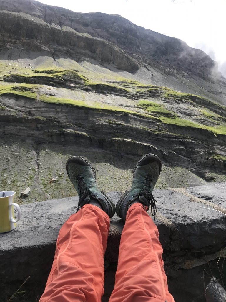 Quelques bruits de pierre et débouchent sur le sentier au-dessus de moi 3 trailers qui descendent en courant, ils reviennent certainement de la Haute Cime, de les voir survoler le terrain avec facilité et rapidité me redonne confiance et je reprends mon chemin jusqu’à la Cabane de Susanfe toute joyeuse. Le soleil brille, il fait chaud, je m’installe sur la terrasse, avec une tisane de verveine fraîche, quel luxe, une tarte aux myrtilles et je profite de la chaise longue et reprend des forces.