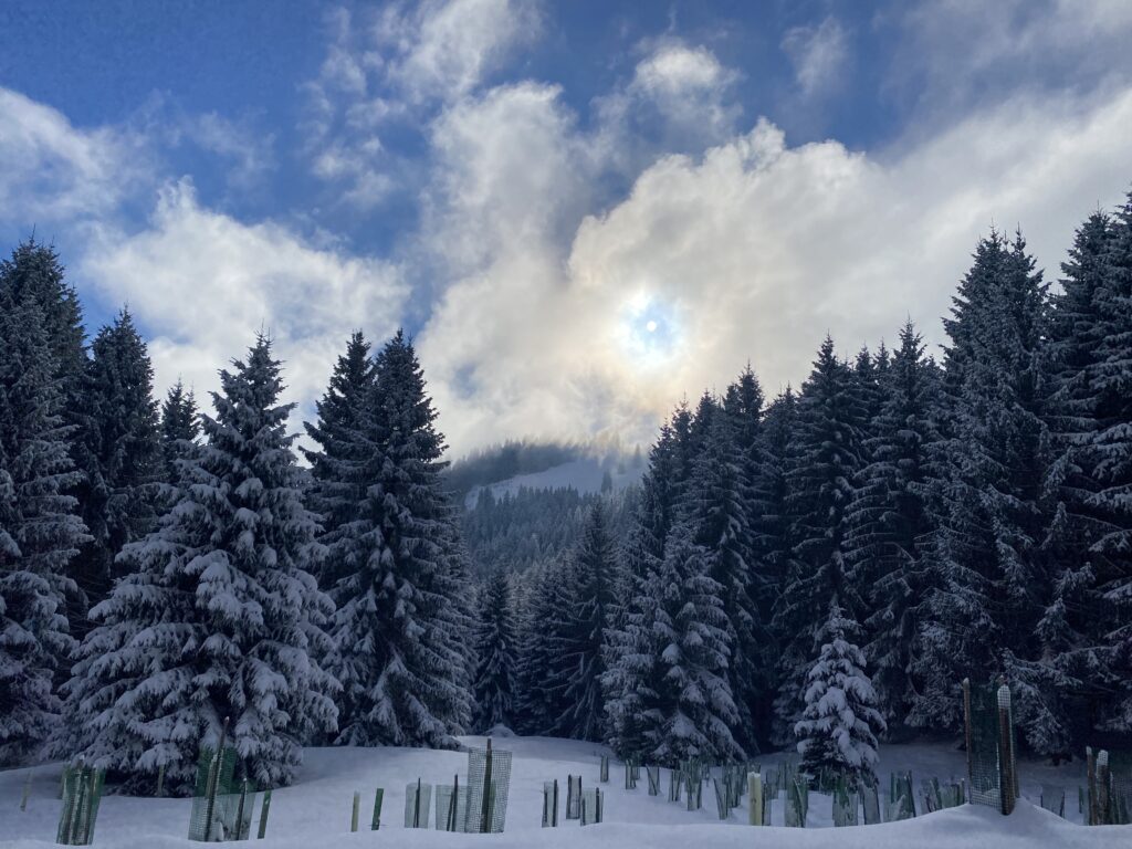 La neige est tombée toute fraîche. Je sors les raquettes pour une sortie vers la Valsainte. Comme j’ai envie de tranquillité, je renonce à la Berra trop fréquentée.