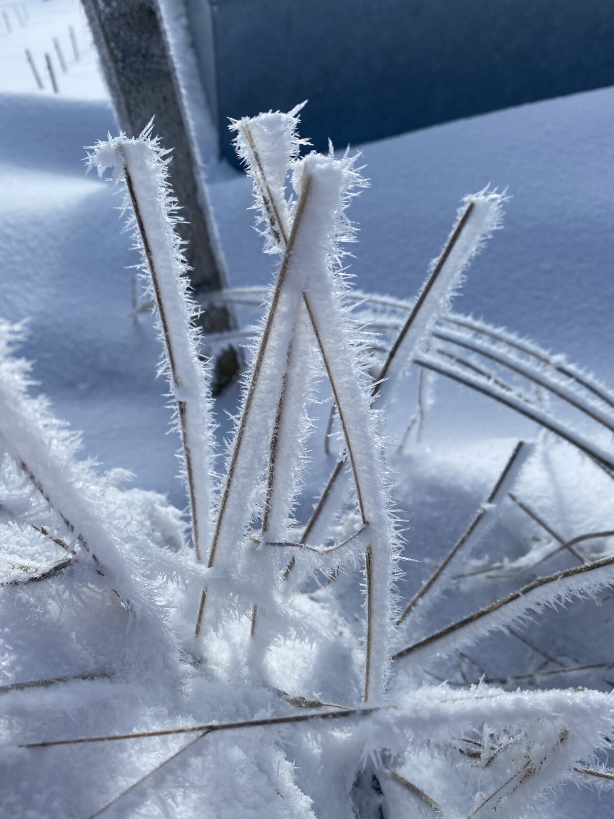 Le brouillard encore présent rend le paysage magique, avec des trouées par moments. Je rejoins des traces de ski de randonnée et les suit jusqu’à la Guille. Le ciel bleu prend l’avantage et les sommets se découvrent timidement. Une pause thé, quelques photos d’herbes et d’arbres givrés et je repars en direction de la Joux d’Allières d’abord par une montée exigeante puis le long de la crête. De là, je devrais avoir la vue à 360°, c’est sans compter le brouillard qui remonte et rend le paysage ouateux.