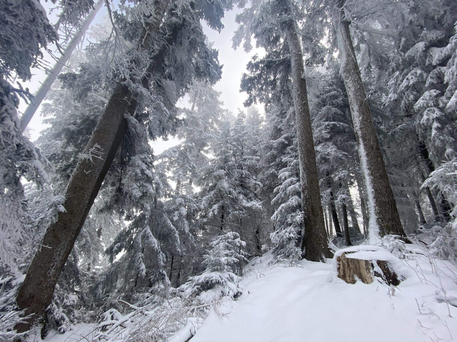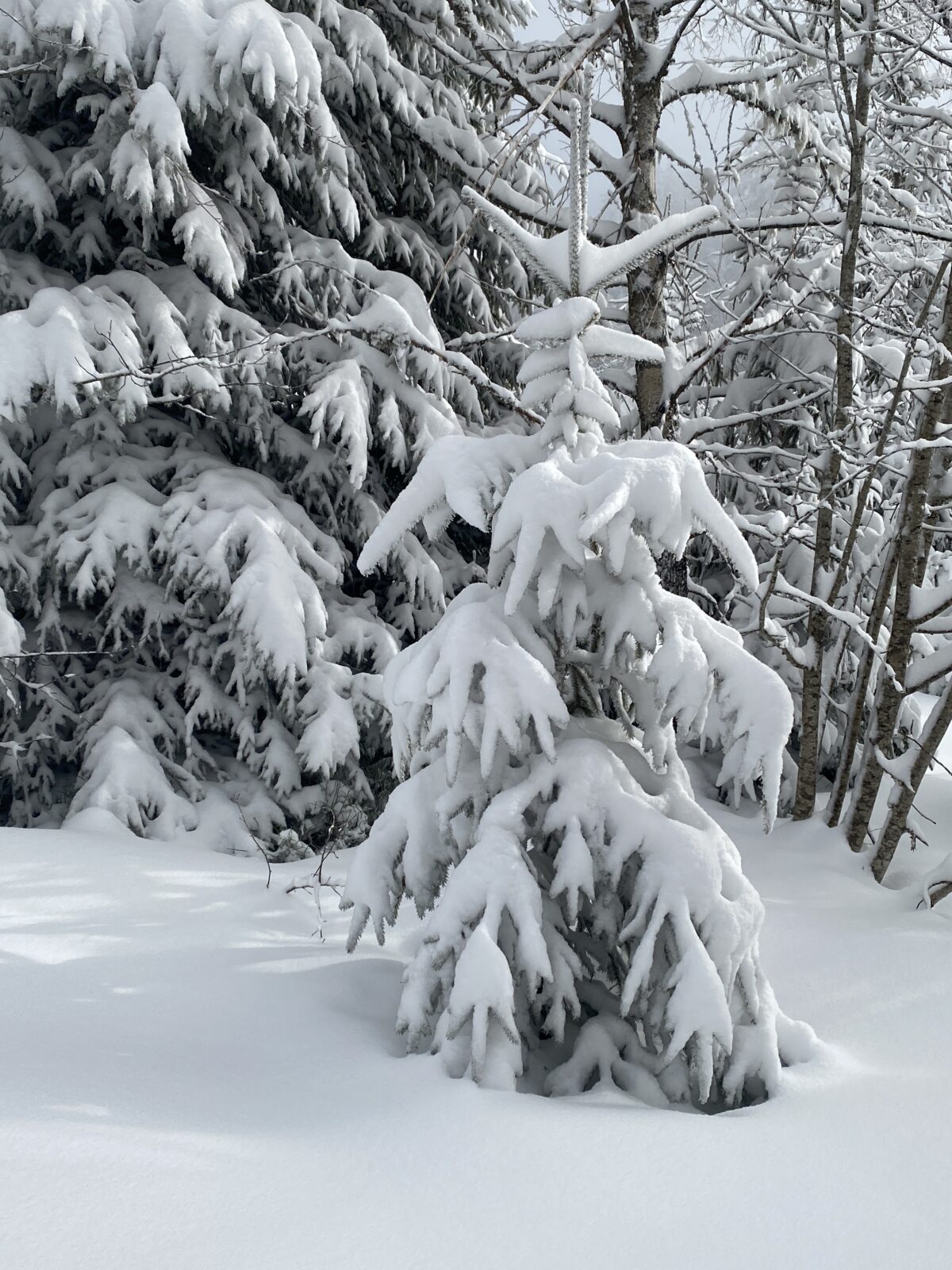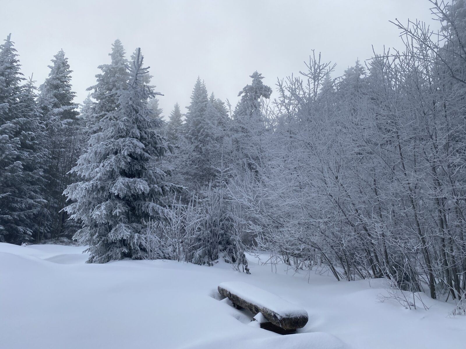 C’est une sortie avec beaucoup de forêt et le chemin du ruisseau est dans une combe que le soleil atteint peu à cette saison. Je suis contente que la météo ne fut pas totalement ensoleillée. Je précise aussi que j’ai suivi un sentier estival, non balisé raquettes, néanmoins sans aucun danger avec cette quantité de neige.
