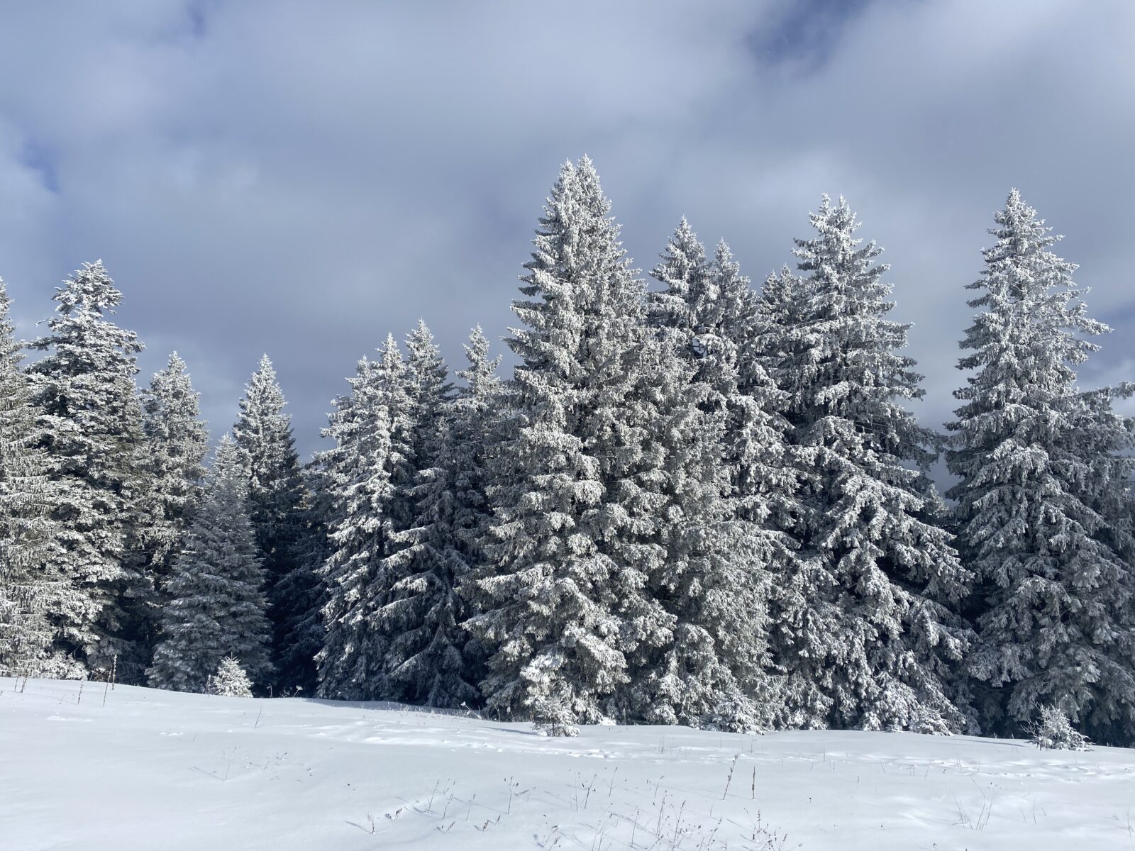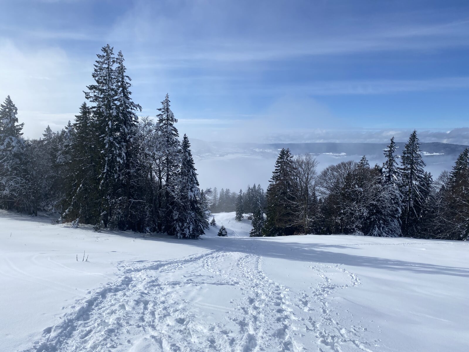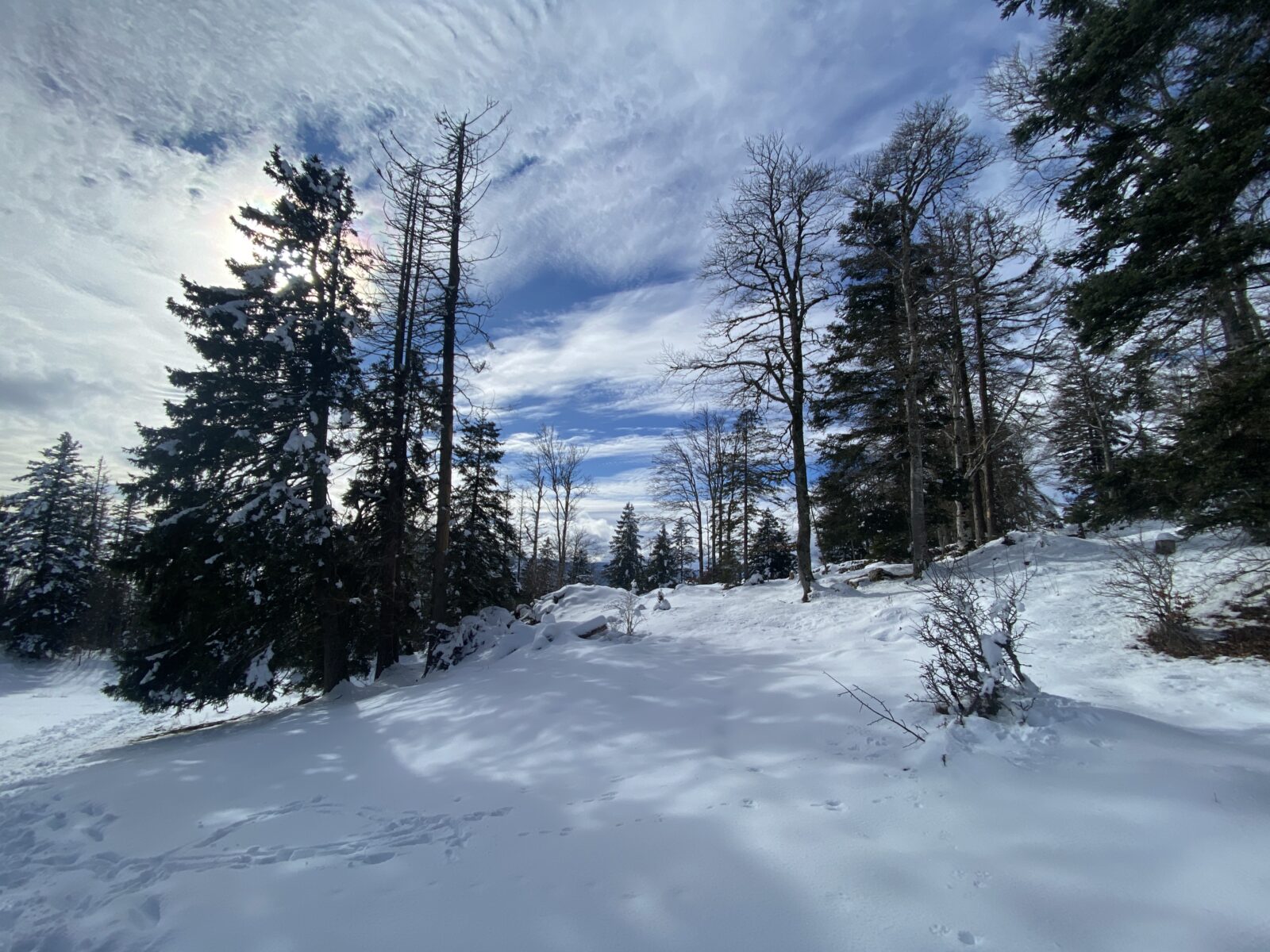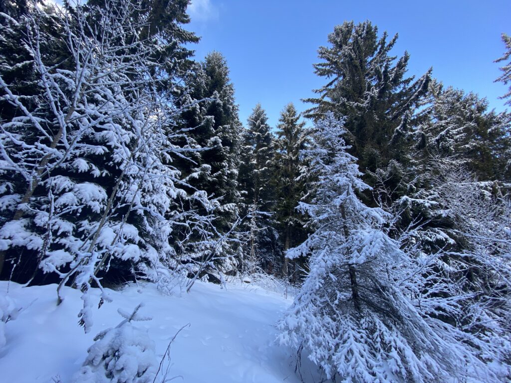 Il a neigé pendant la nuit. Les nuages jouent à cache-cache avec le soleil. Le chemin, les sapins, tout est recouvert de quelques centimètres de neige. Il n’y a aucun son et je marche en suivant les seules traces d’un randonneur que j’aperçois un peu plus haut.