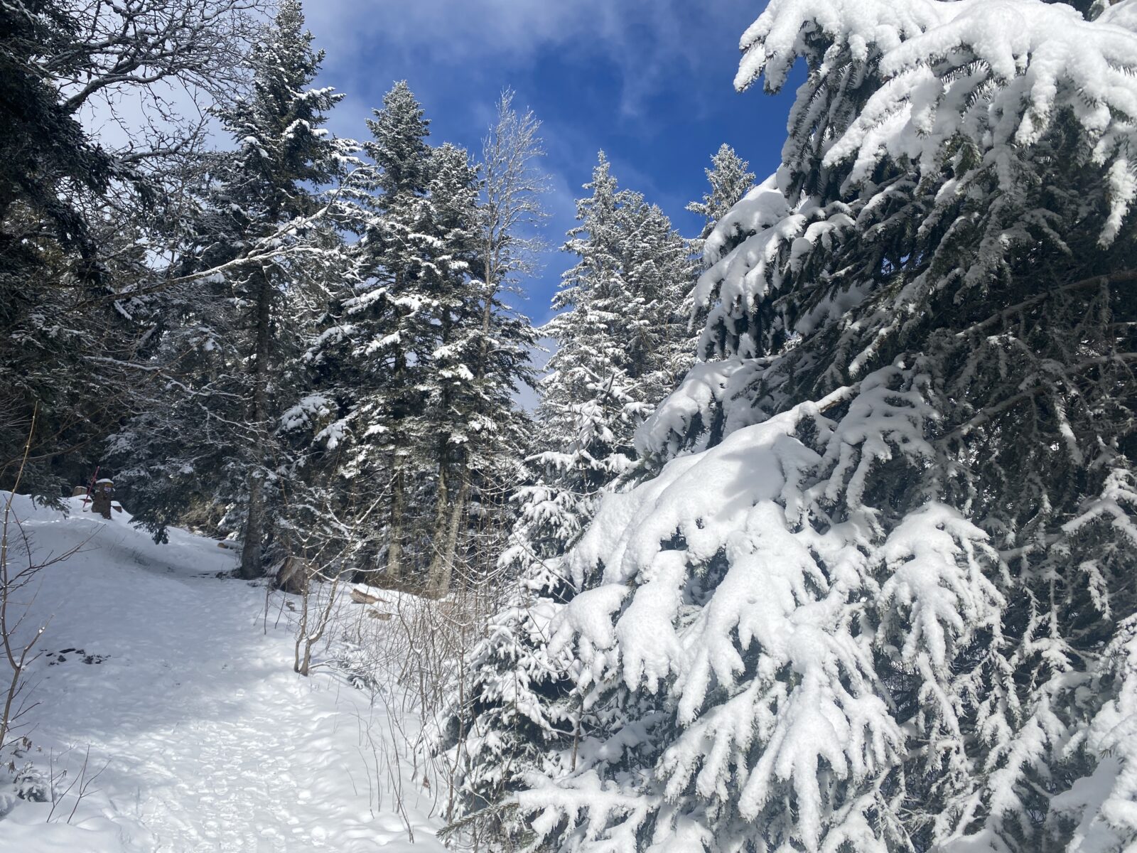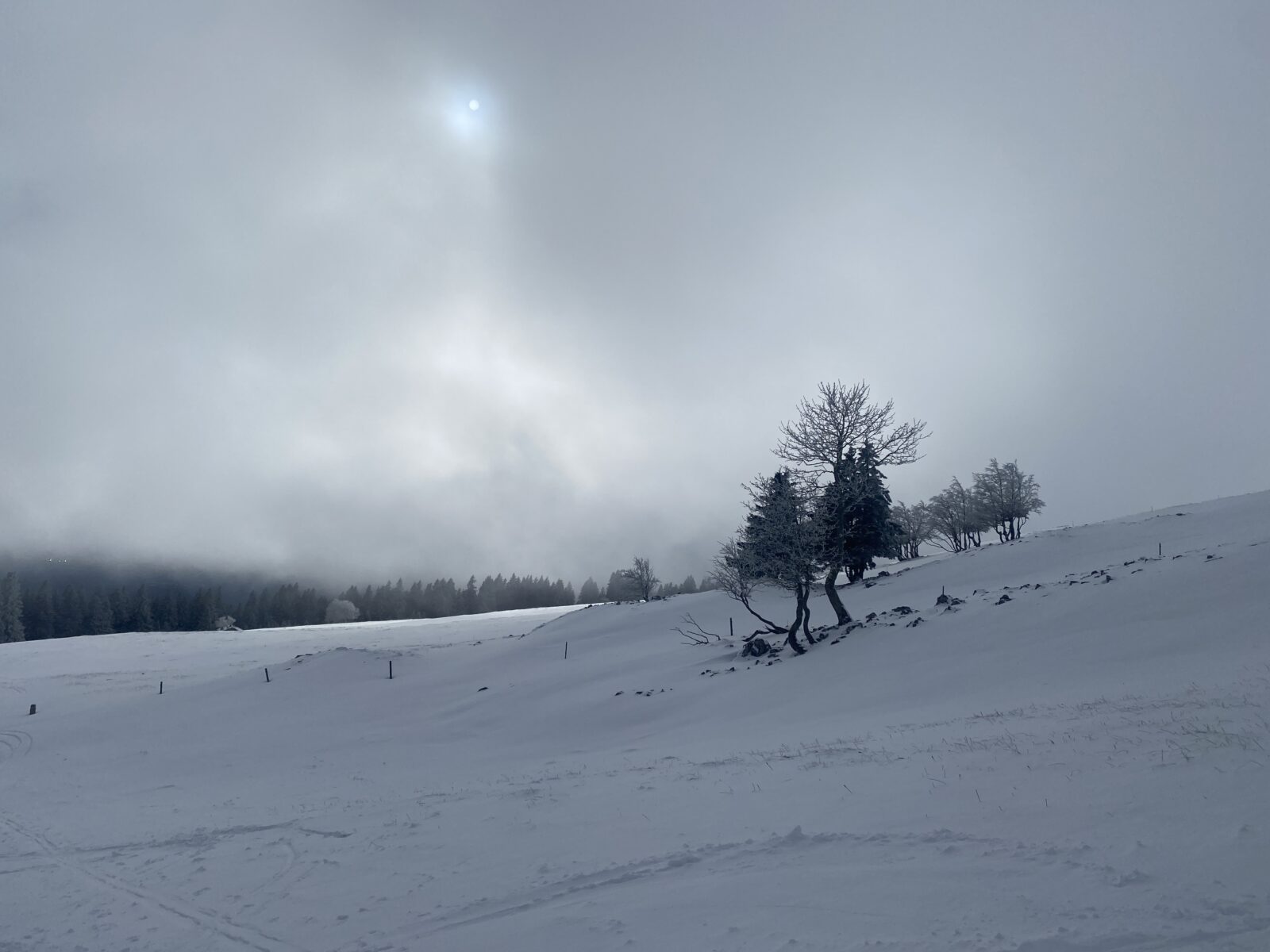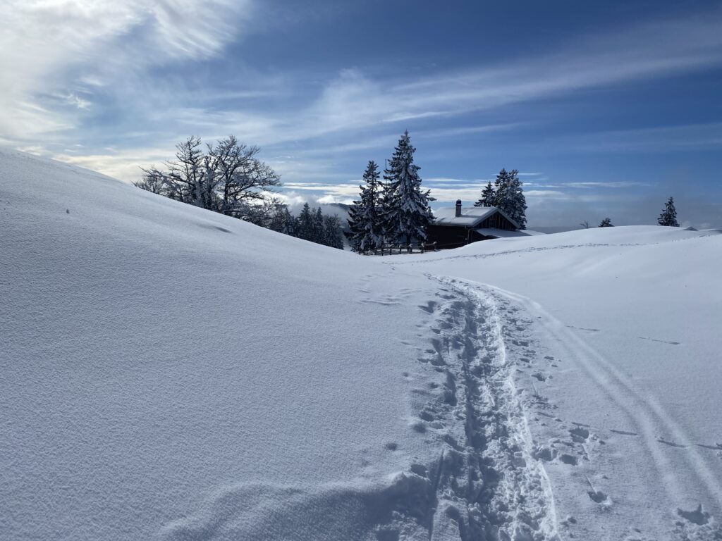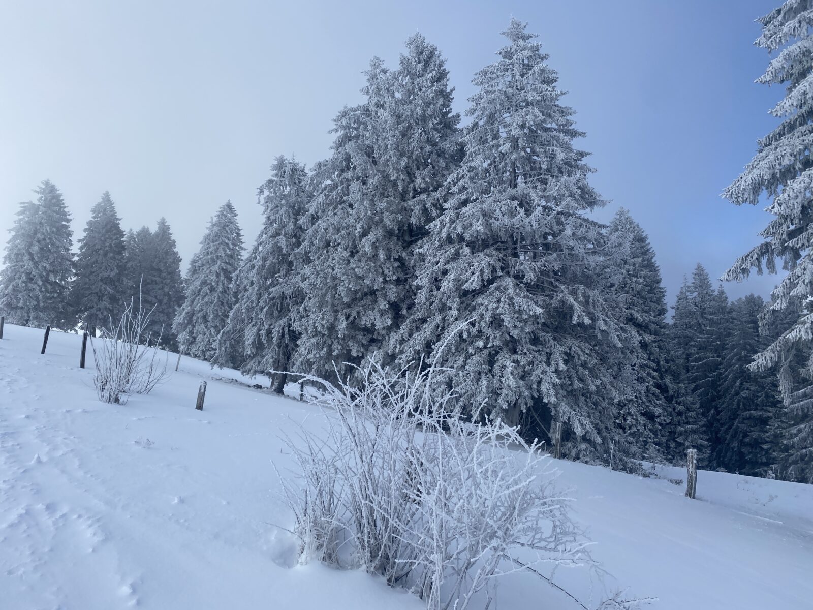 Il a neigé pendant la nuit. Les nuages jouent à cache-cache avec le soleil. Le chemin, les sapins, tout est recouvert de quelques centimètres de neige. Il n’y a aucun son et je marche en suivant les seules traces d’un randonneur que j’aperçois un peu plus haut.