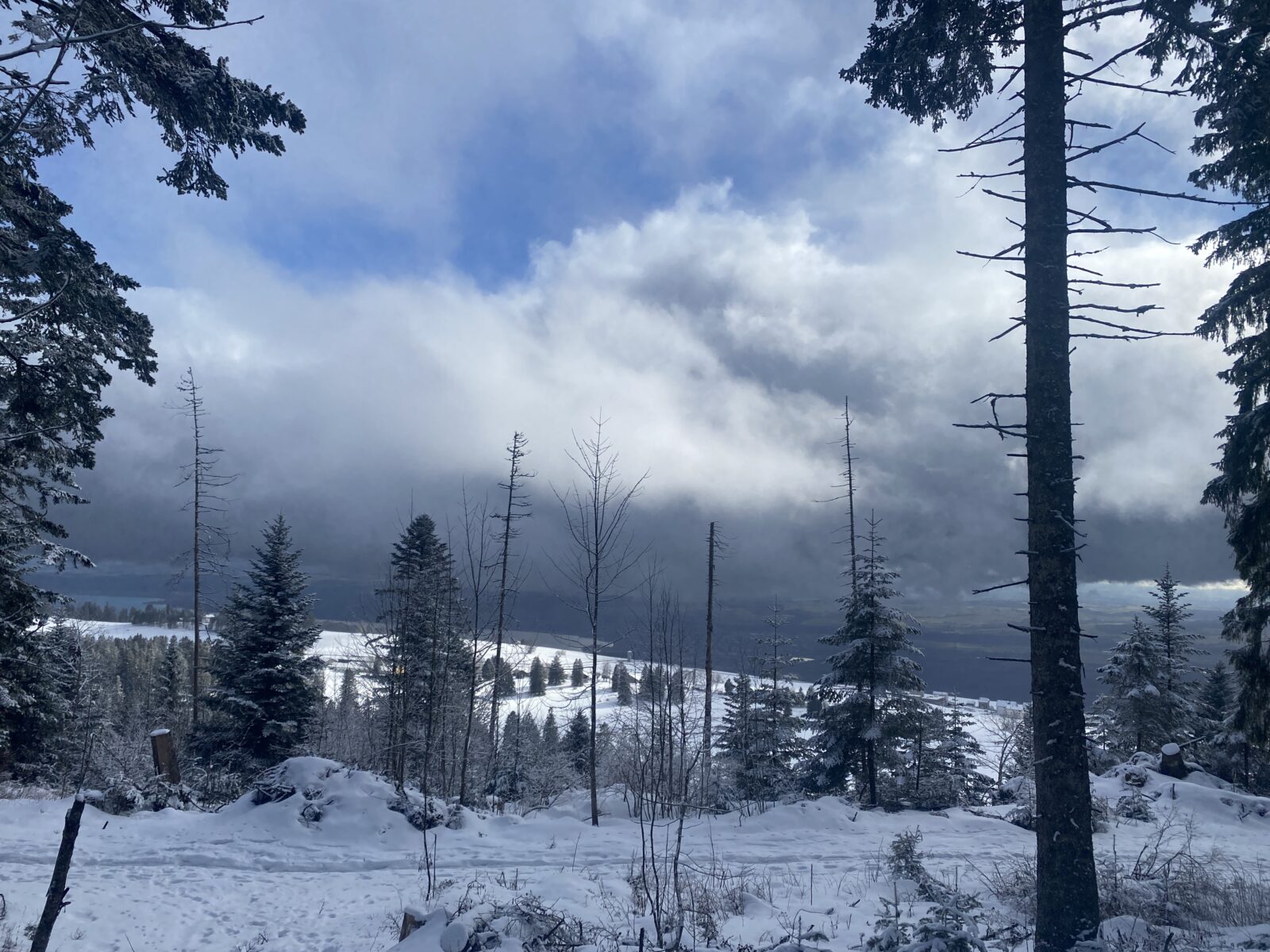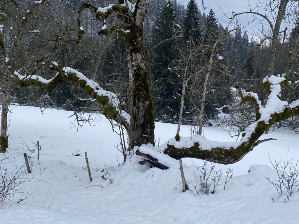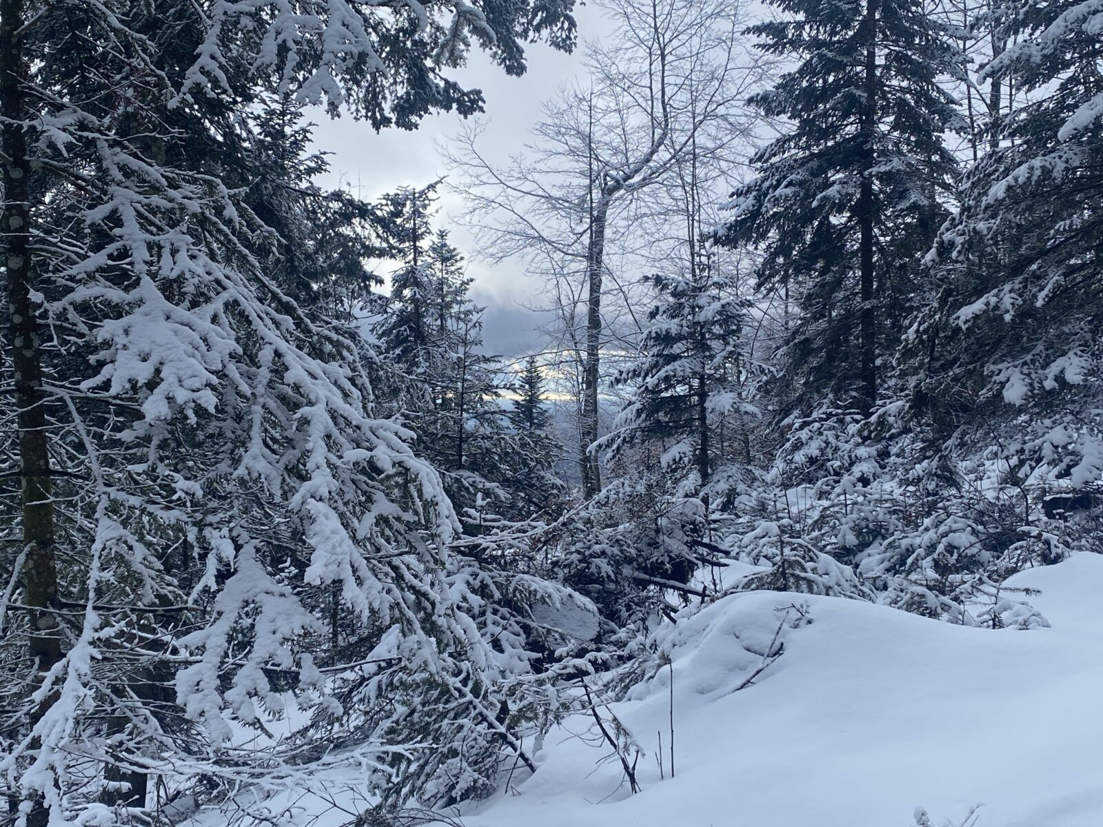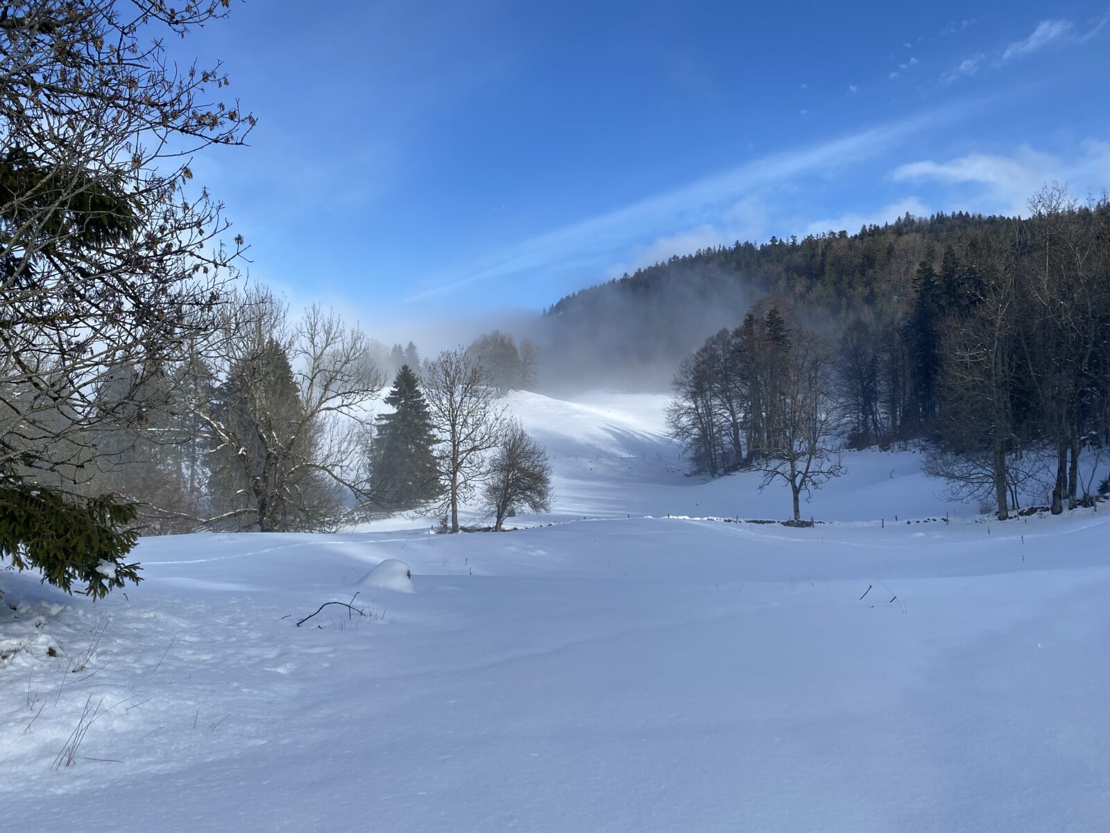 Il a neigé pendant la nuit. Les nuages jouent à cache-cache avec le soleil. Le chemin, les sapins, tout est recouvert de quelques centimètres de neige. Il n’y a aucun son et je marche en suivant les seules traces d’un randonneur que j’aperçois un peu plus haut.