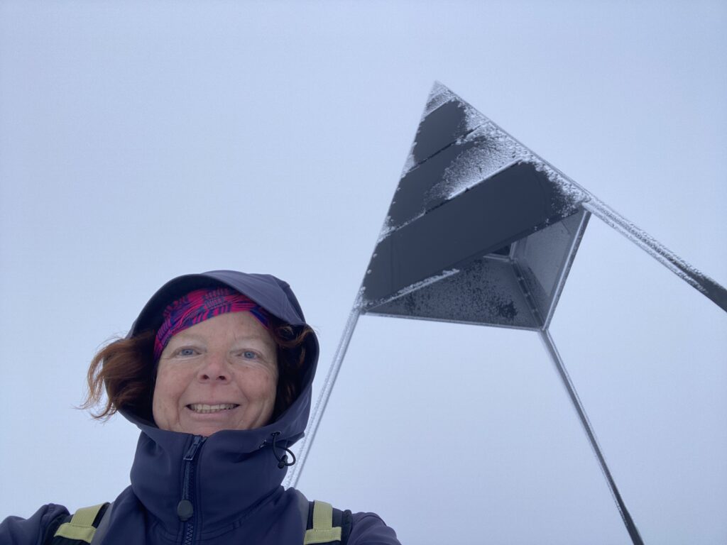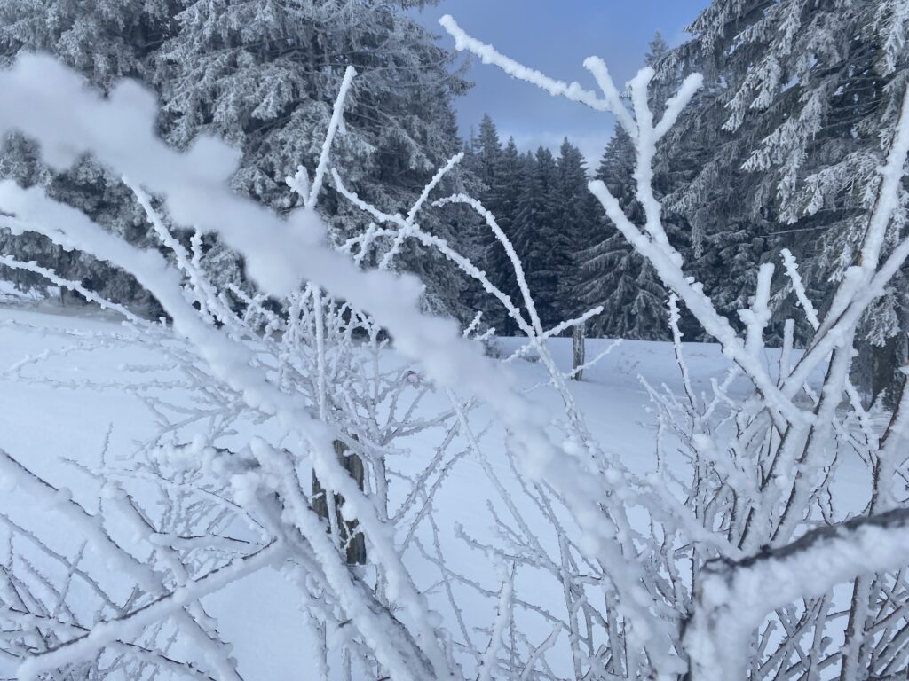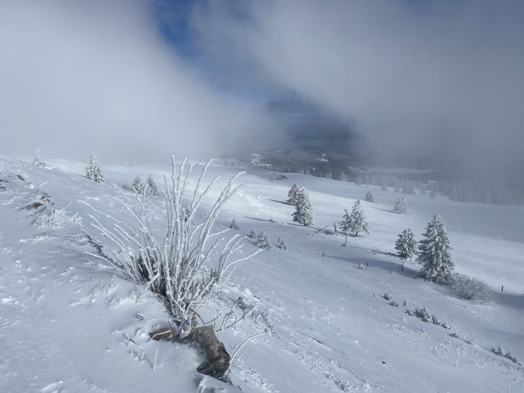 La montée est agréable dans la forêt, sans vent et j’arrive déjà en vue du sommet. En vue est exagéré, car les nuages et le brouillard le masquent. Le vent souffle fort, il fait froid, tout est figé par la neige et le givre. Les nuages passent vite et par moments la vue s’offre comme un cadeau.