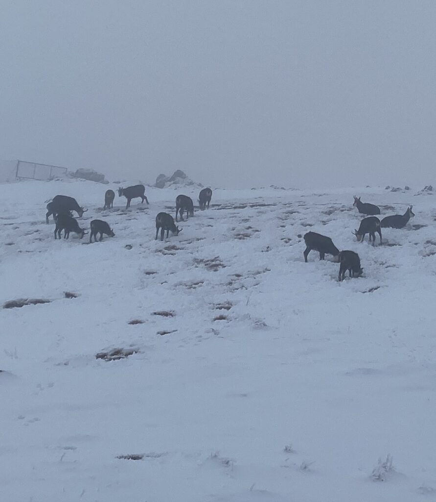 Quand j’arrive vers le restaurant (définitivement fermé), je vois le randonneur arrêté un peu plus haut qui observe un troupeau de chamois. Je le rejoins tranquillement et nous échangeons quelques mots. Il y a plus de 20 chamois, un seul nous regarde et nous surveille et les autres grattent la neige pour brouter. Comme nous restons à une certaine distance, ils ne bougent pas. Je rejoins finalement le sommet, bois du thé chaud et attend un moment une éventuelle éclaircie, qui ne viendra pas.