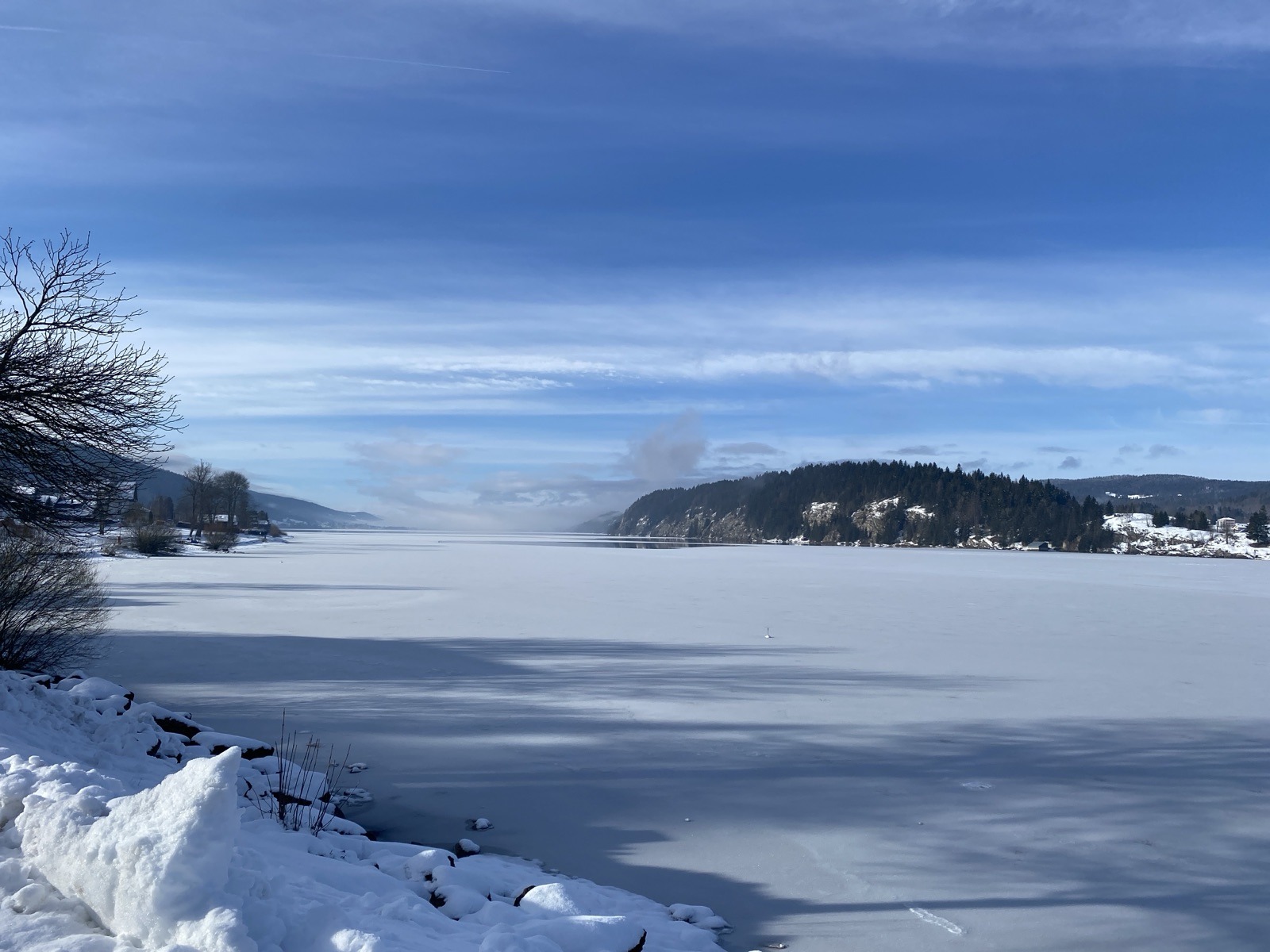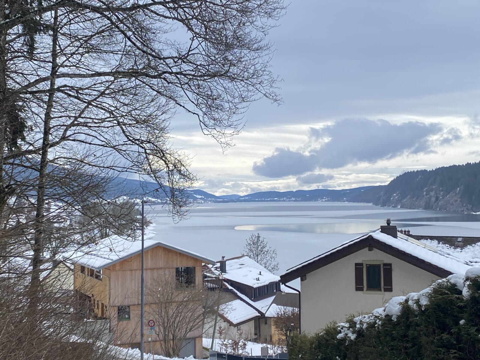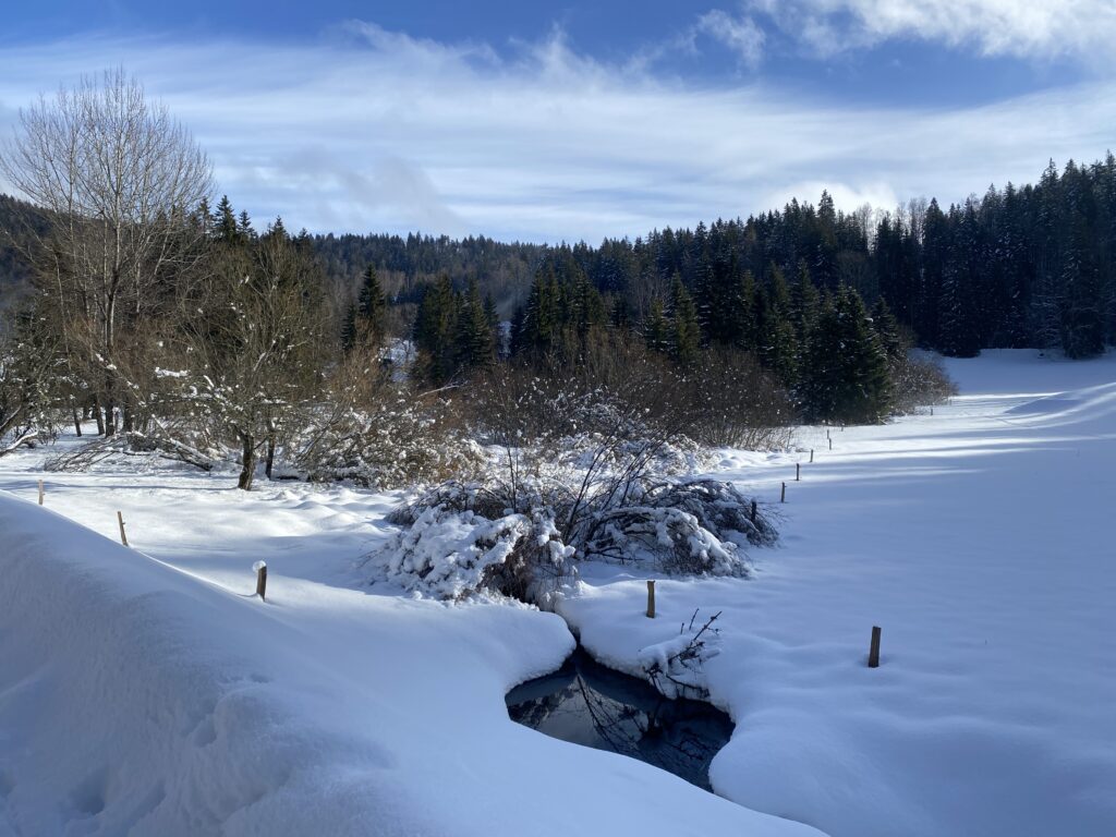 Quand j’arrive au Pont, le lac de Joux est gelé, il y a un peu de brumes rasantes, cela rend l’atmosphère magique.