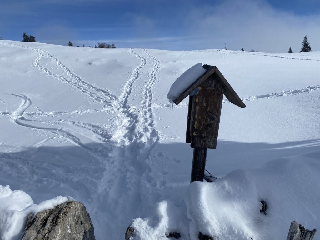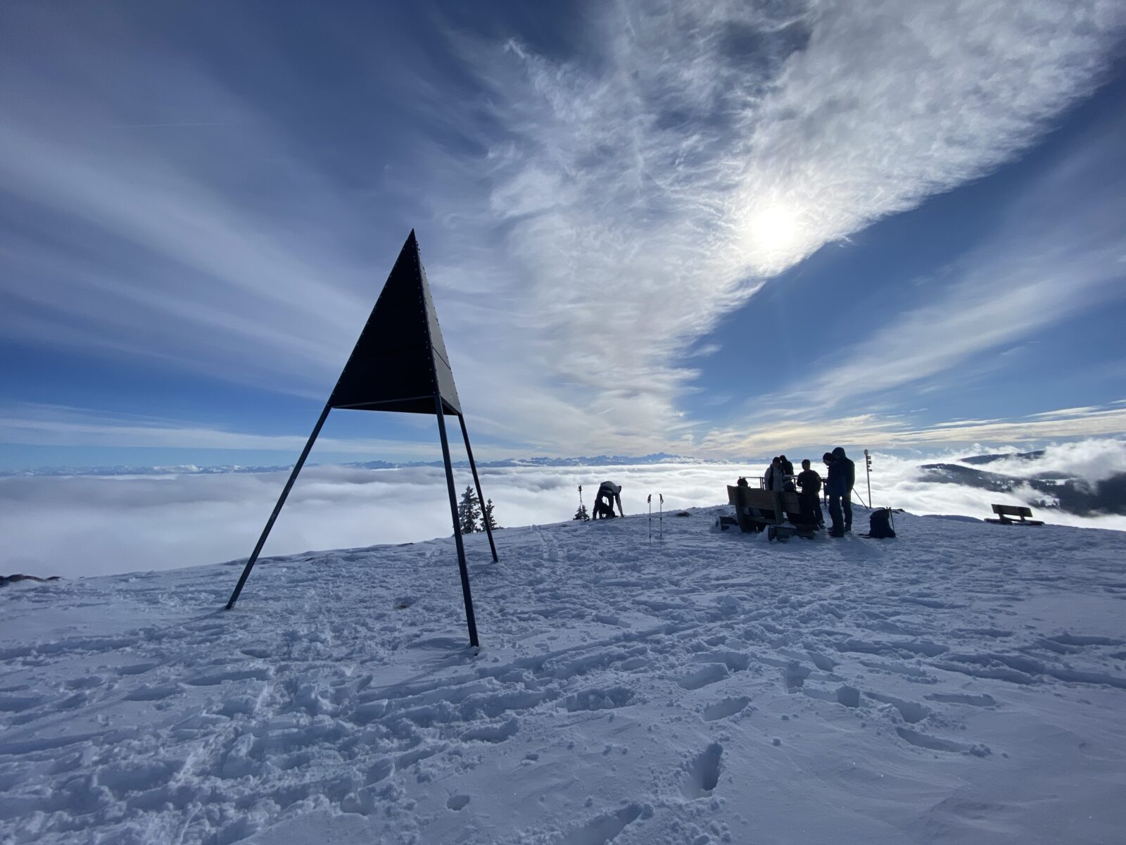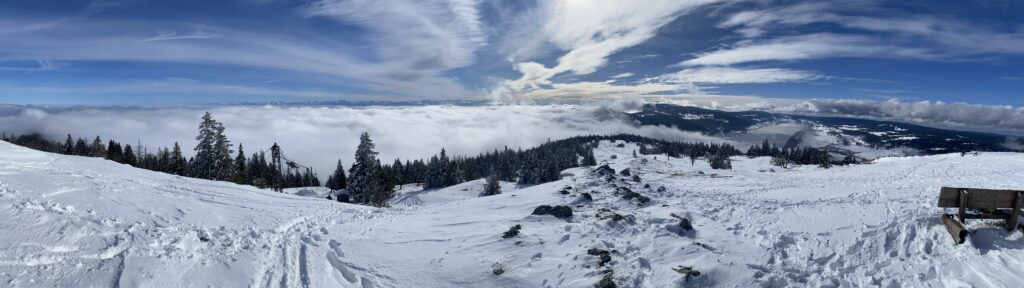 Pour atteindre le sommet, la montée s’effectue sur une neige bien tassée. La vue est spectaculaire, la mer de brouillard avec les sommets des Alpes qui émergent. Après quelques photos, je m’installe sur un banc de libre et pique-nique tranquillement. Deux personnes préparent leurs voiles de parapente pour la descente. Dans un premier temps, je me dis que je vais attendre leur départ, le temps passe, il fait frais et je pars avant eux finalement.