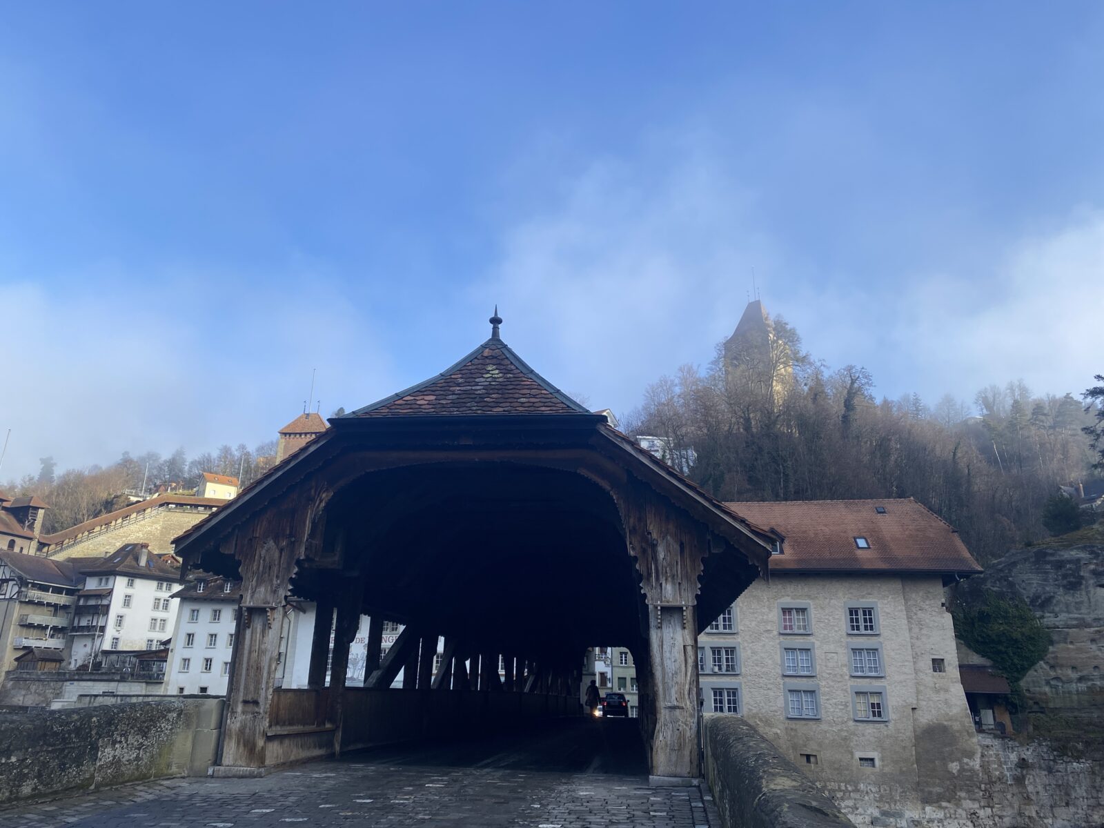 Je démarre de la gare de Fribourg et traverse la ville jusqu’au Pont de Berne, inauguré en 1250. Son aspect actuel date de 1653. Sa pile centrale en molasse et le tablier ont été refaits en 1853-54 et sa couverture date de 1855.