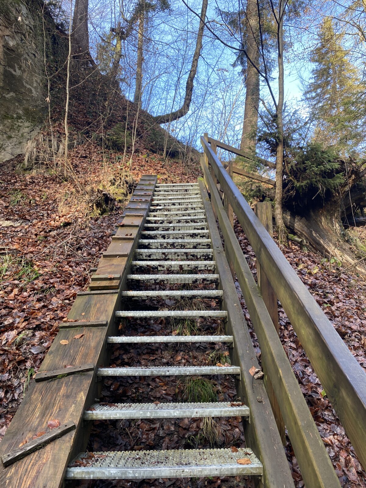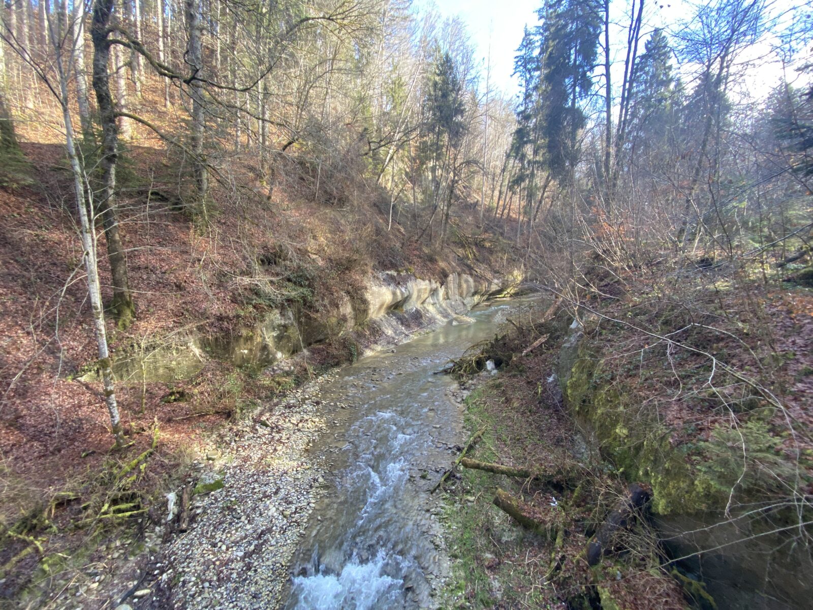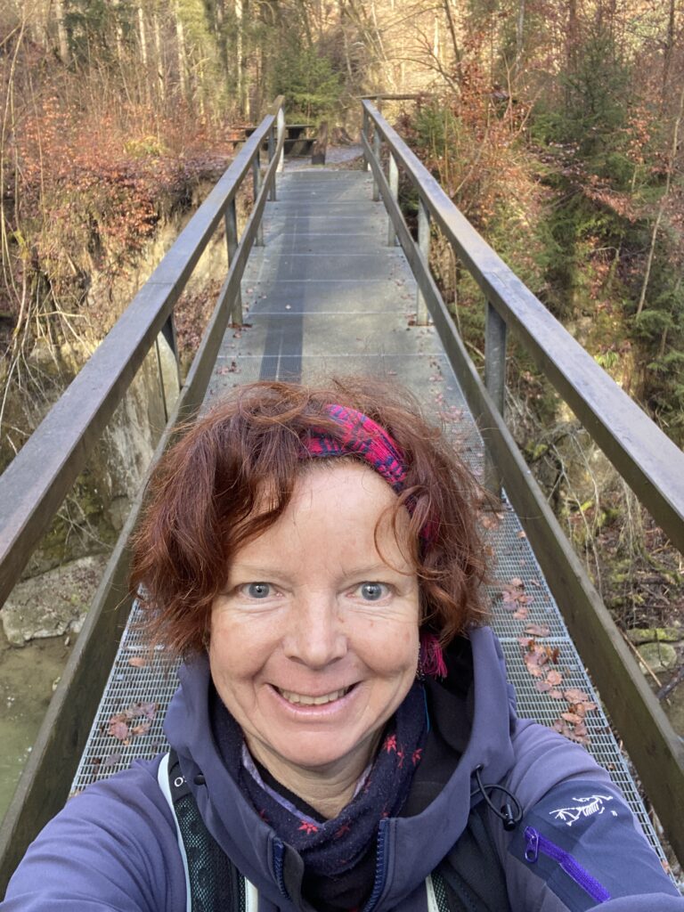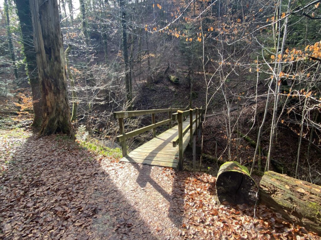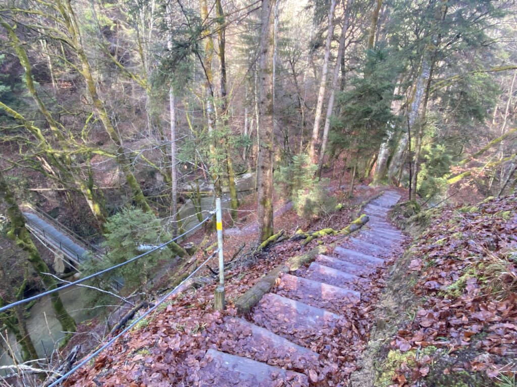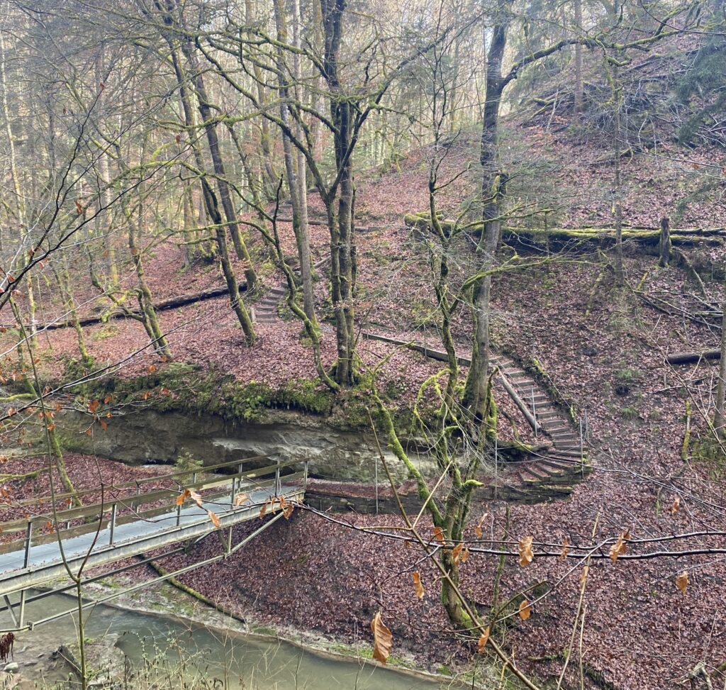 Je m’engage dans le sens anti-horaire un peu au hasard, ce qui sera un excellent choix par rapport à la météo. Une jolie montée en lacets et en escaliers jusqu’à la Tour de Dürrenbuhl, datant de 1370. Je traverse Bourguillon et ses habitations puis chemine en lisière de forêt ce qui me permet de profiter du beau soleil et de la douceur de cette journée. Ensuite le chemin traverse des champs et passe à côté de grandes fermes. Une petite descente jusqu’à Ameismühle d’où commencent les gorges. Un panneau d’avertissement indique que le trajet est déconseillé en cas de dégel à cause des chutes de glaçons. J’en verrai en effet de nombreux déjà tombés les jours précédents.