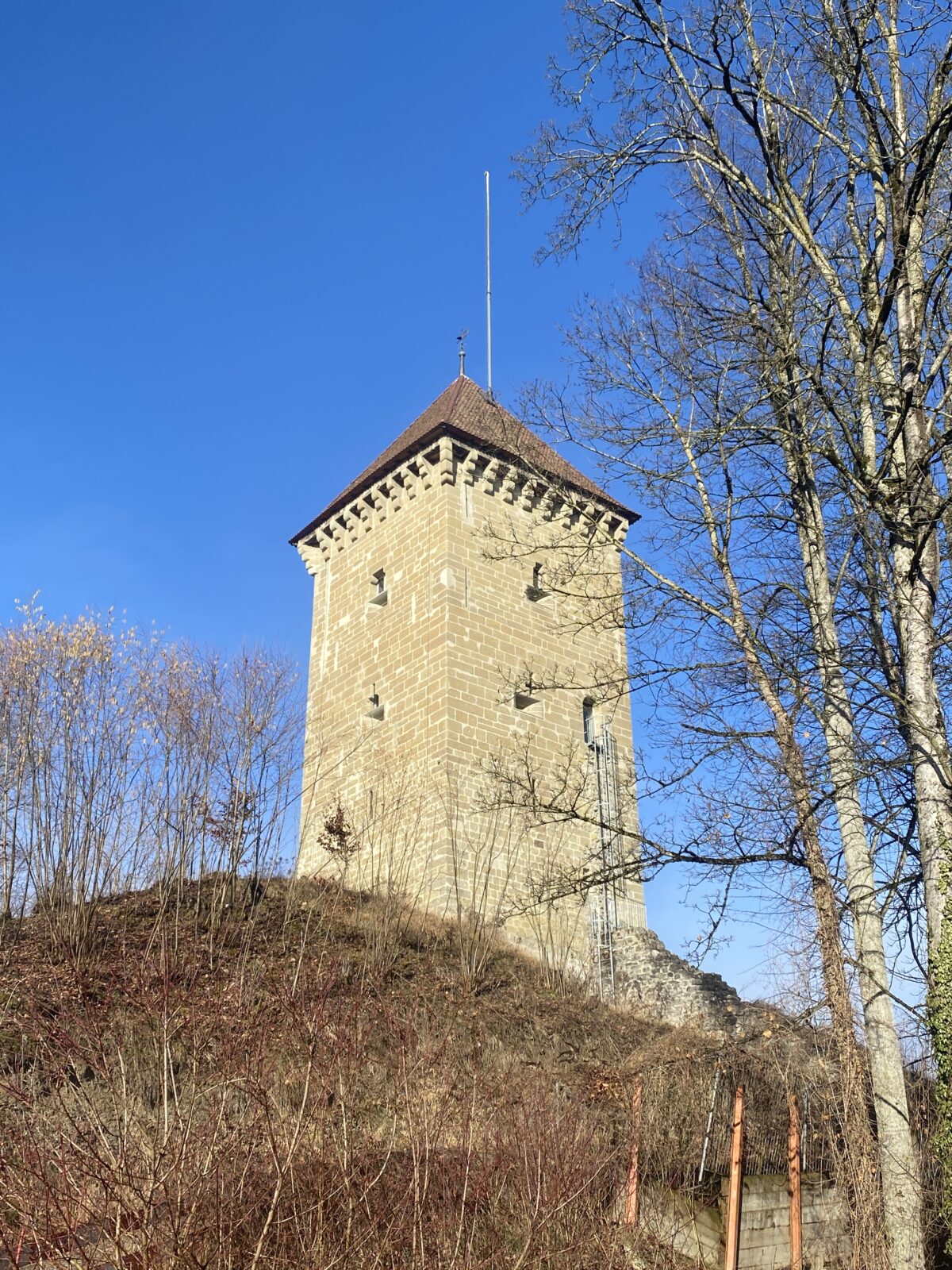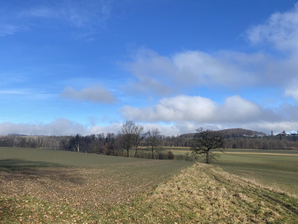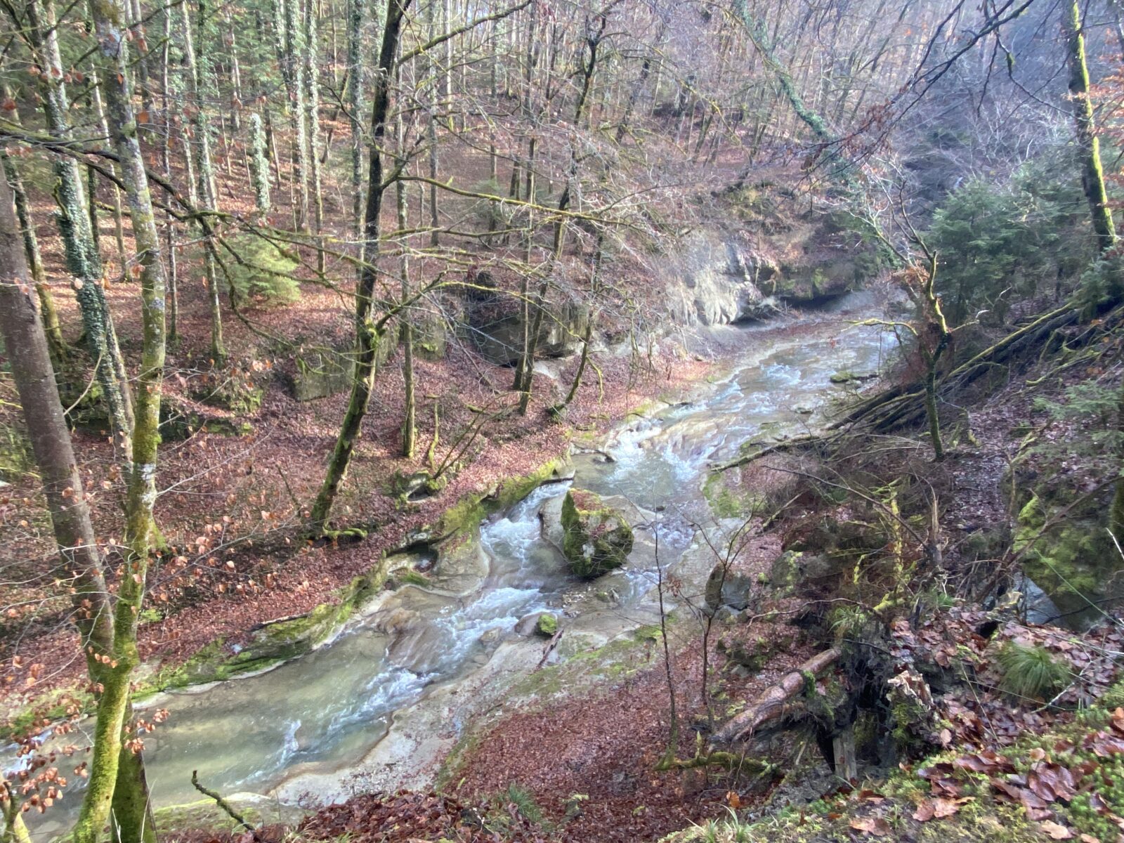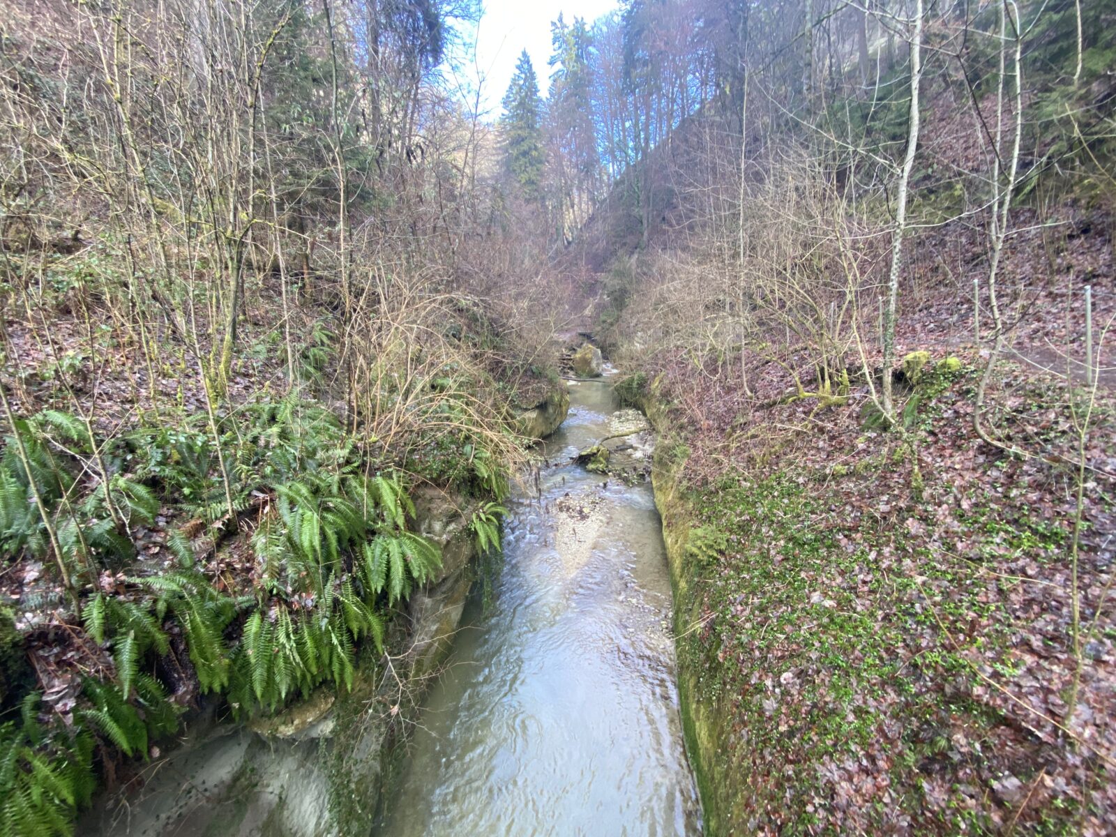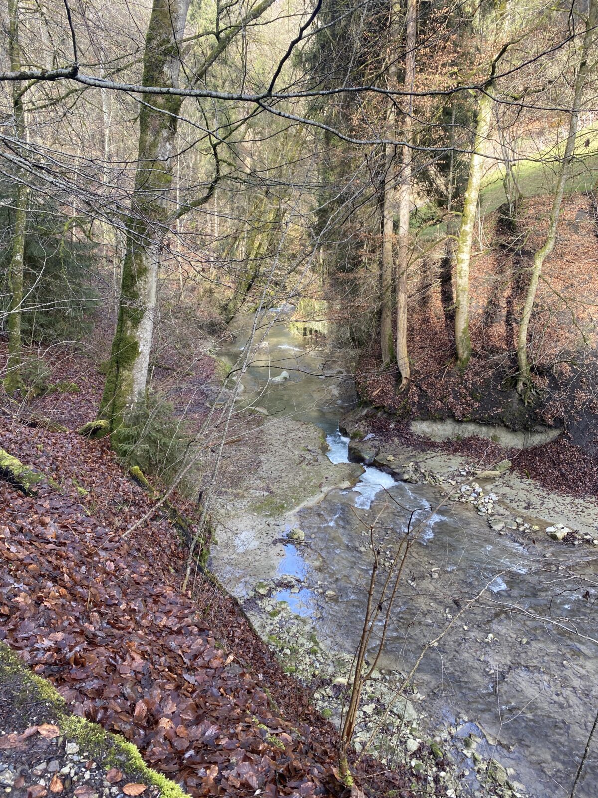 Je m’engage dans le sens anti-horaire un peu au hasard, ce qui sera un excellent choix par rapport à la météo. Une jolie montée en lacets et en escaliers jusqu’à la Tour de Dürrenbuhl, datant de 1370. Je traverse Bourguillon et ses habitations puis chemine en lisière de forêt ce qui me permet de profiter du beau soleil et de la douceur de cette journée. Ensuite le chemin traverse des champs et passe à côté de grandes fermes. Une petite descente jusqu’à Ameismühle d’où commencent les gorges. Un panneau d’avertissement indique que le trajet est déconseillé en cas de dégel à cause des chutes de glaçons. J’en verrai en effet de nombreux déjà tombés les jours précédents.