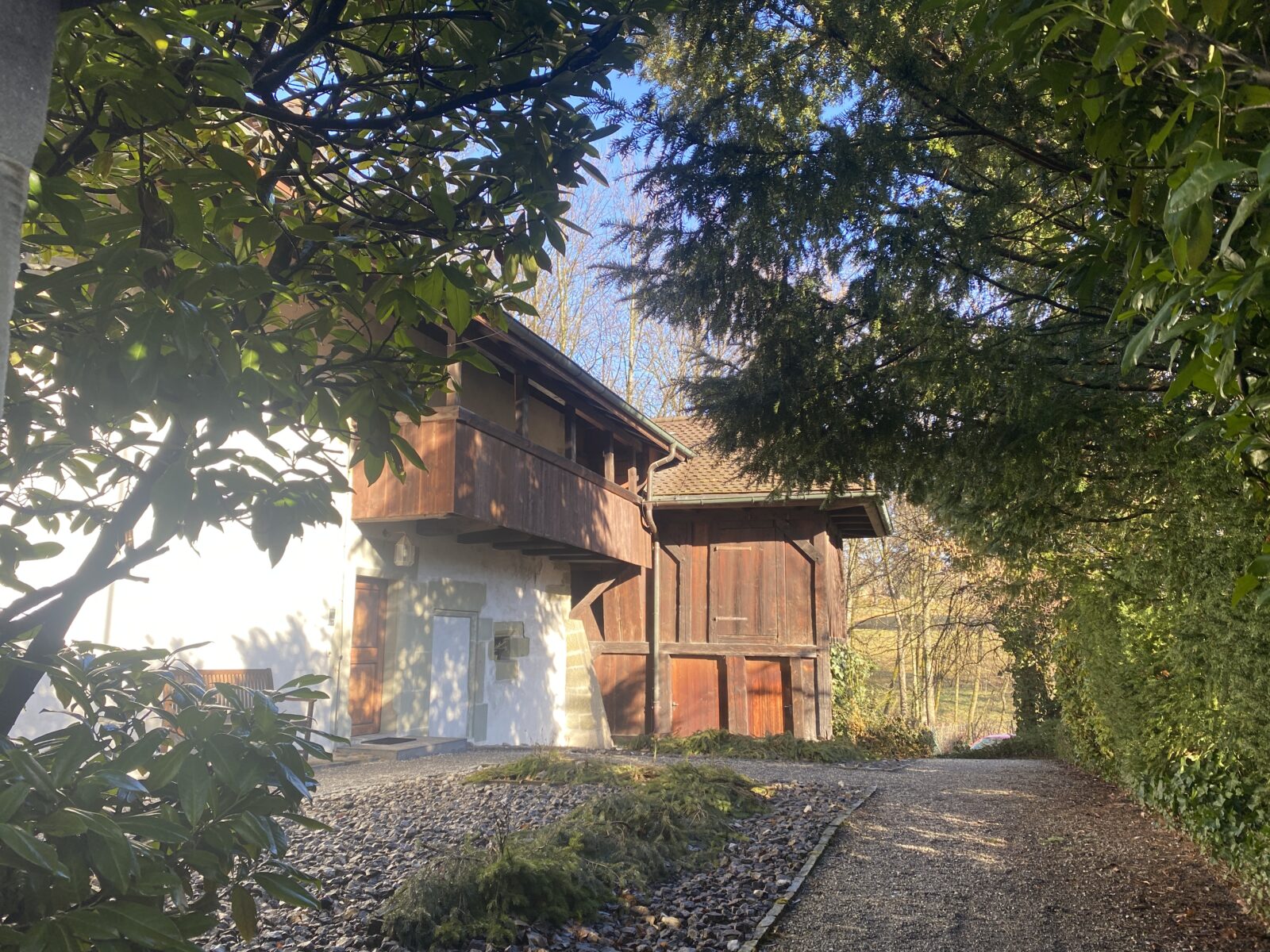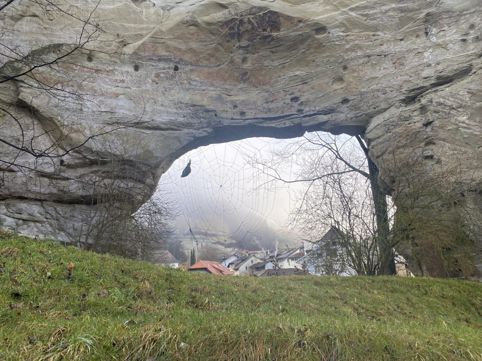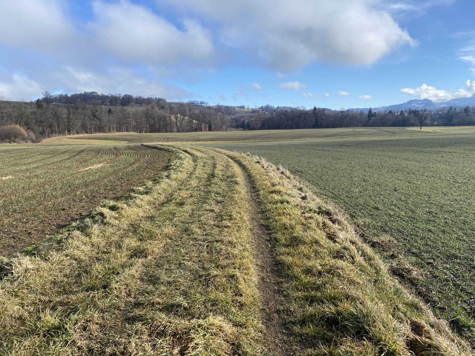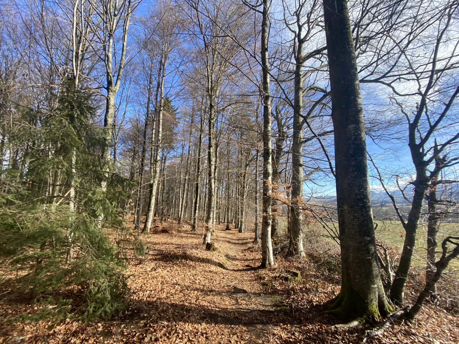 Je m’engage dans le sens anti-horaire un peu au hasard, ce qui sera un excellent choix par rapport à la météo. Une jolie montée en lacets et en escaliers jusqu’à la Tour de Dürrenbuhl, datant de 1370. Je traverse Bourguillon et ses habitations puis chemine en lisière de forêt ce qui me permet de profiter du beau soleil et de la douceur de cette journée. Ensuite le chemin traverse des champs et passe à côté de grandes fermes. Une petite descente jusqu’à Ameismühle d’où commencent les gorges. Un panneau d’avertissement indique que le trajet est déconseillé en cas de dégel à cause des chutes de glaçons. J’en verrai en effet de nombreux déjà tombés les jours précédents.