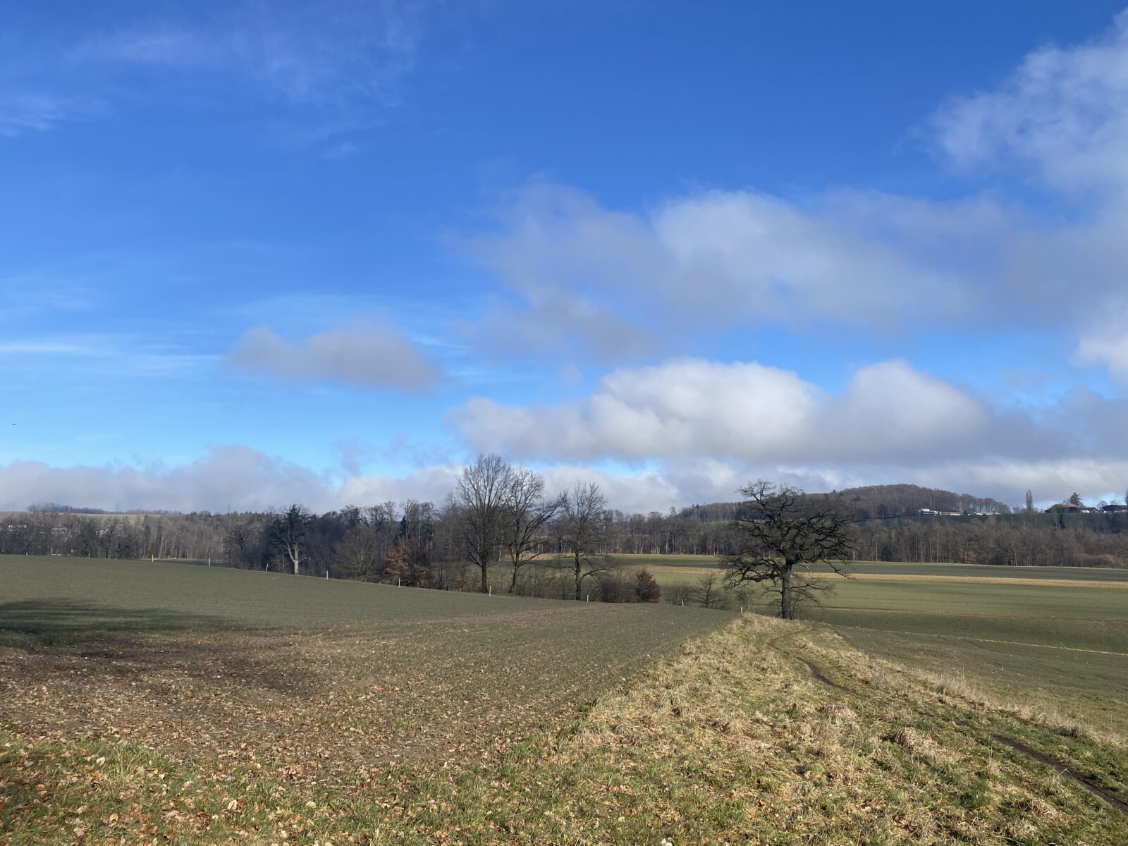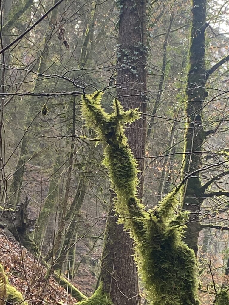 Je prends direction Petra Felix avec un magnifique soleil, le chemin passe à travers champs puis entre dans la forêt. Je croise encore de nombreux promeneurs. Je m’enfonce dans le brouillard et tout devient sombre. Quand je rejoins la bifurcation pour le Pont, je sors du brouillard et suis toute surprise, le soleil a disparu et de nombreux nuages élevés ont pris sa place.