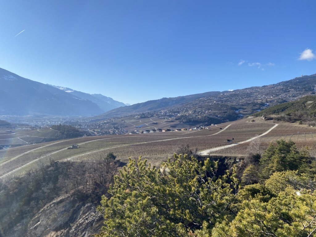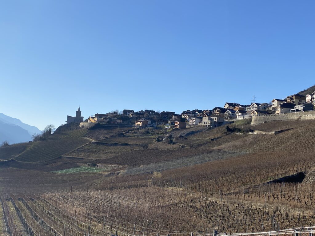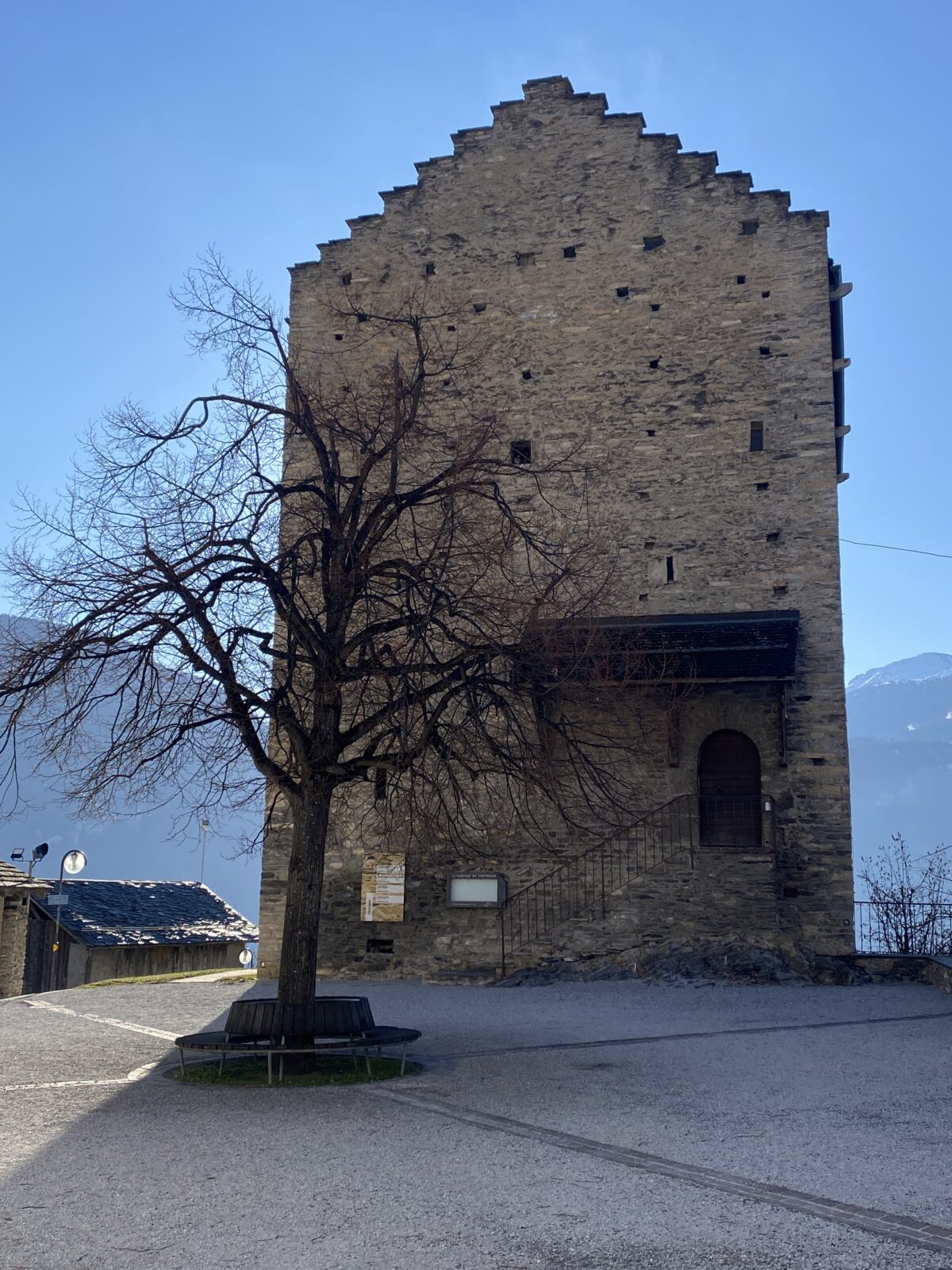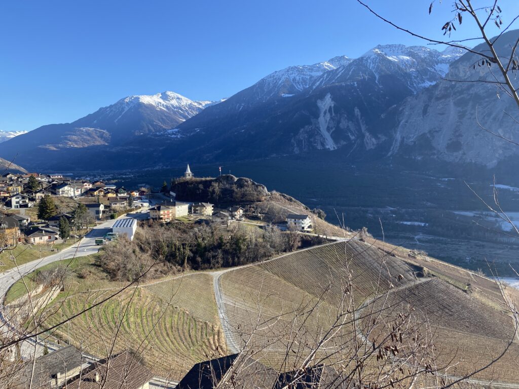 Je pars de la gare de Sierre et monte à travers la ville pour rejoindre le sentier. Il fait un temps magnifique. le ciel est sans aucun nuage. A travers les vignes, j’arrive tranquillement aux hameaux du château Anchettes et du Moulin puis à Venthône, village médiéval.