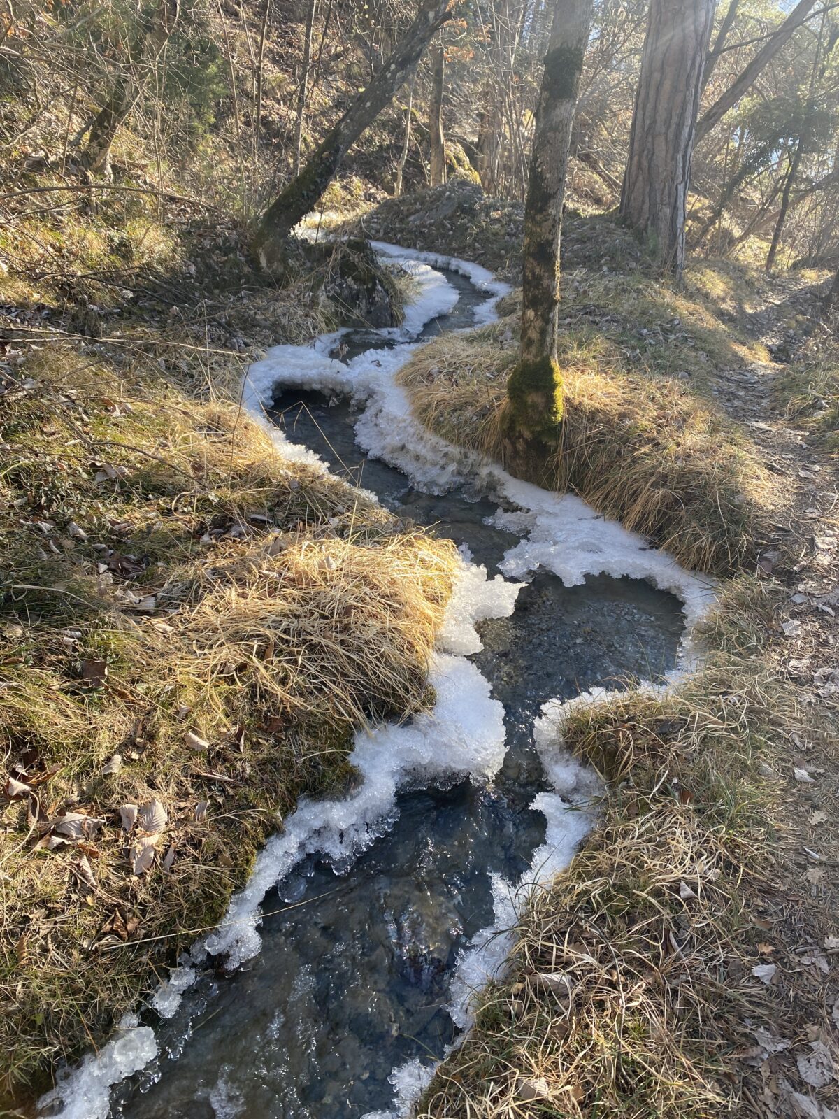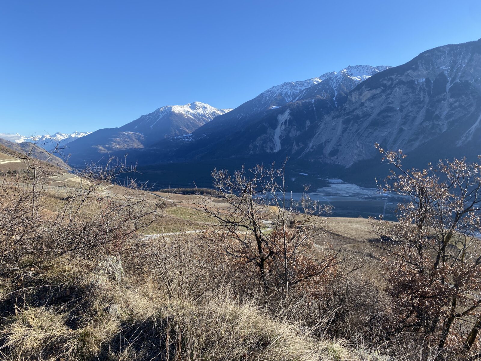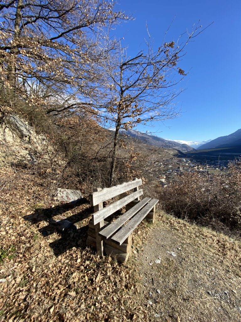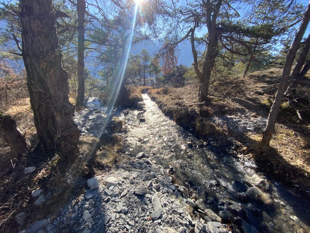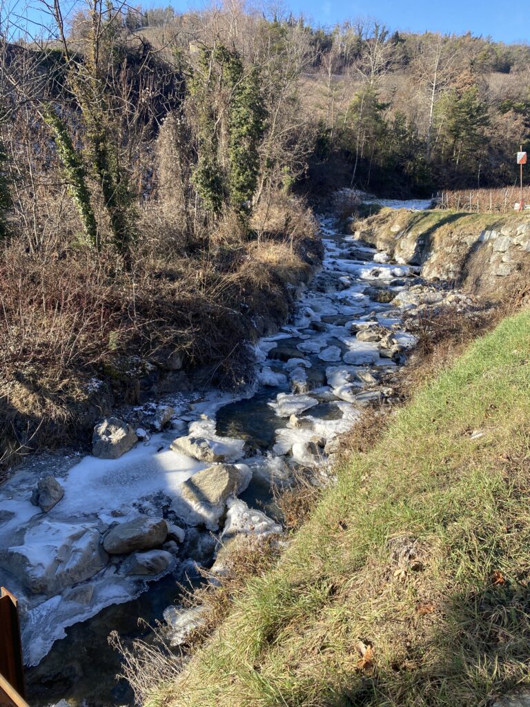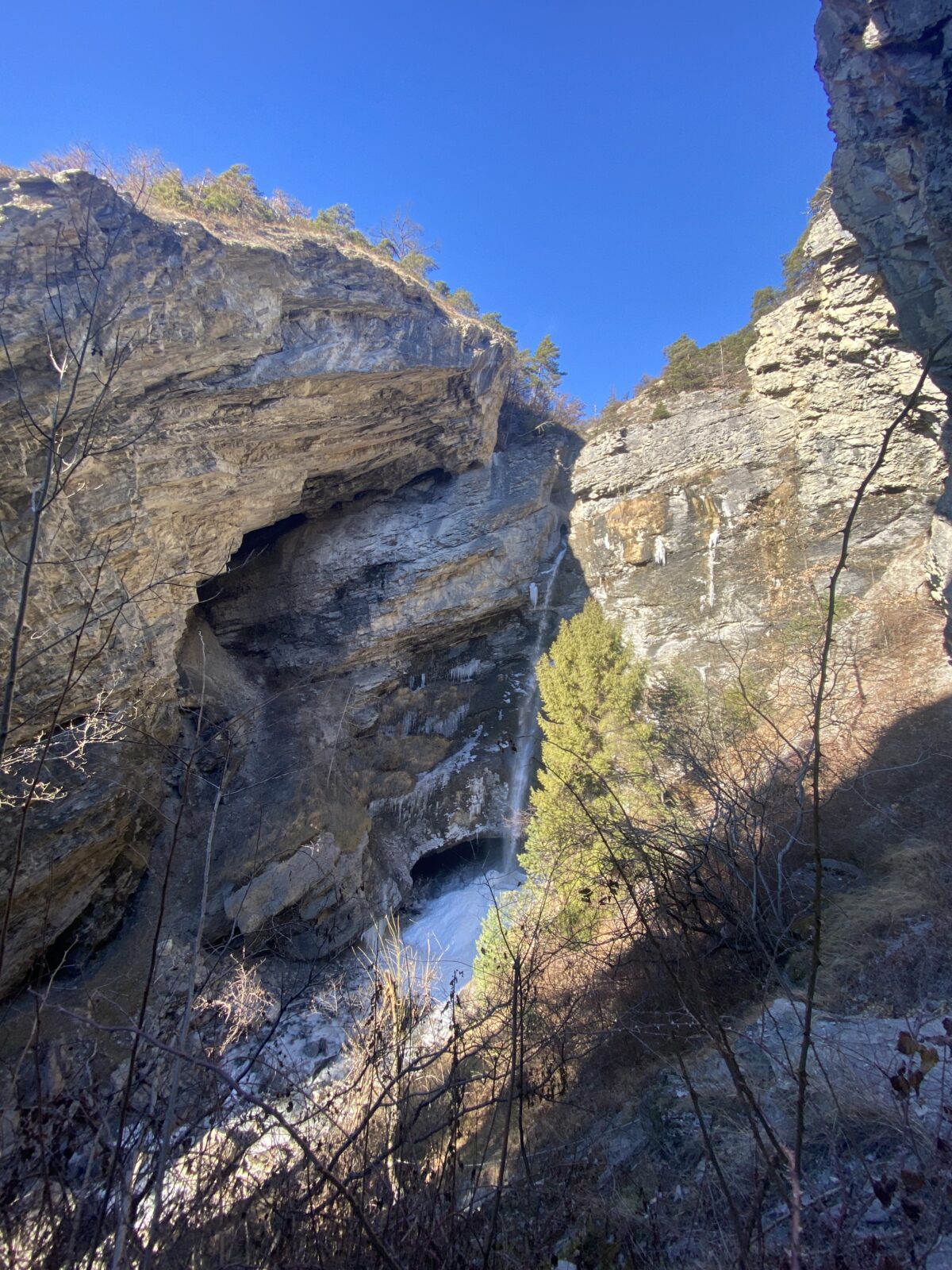 Je me trouve maintenant au-dessus de Salgesch, Salquenen, le chemin monte tranquillement d’abord dans les vignes puis dans une forêt de pins. Il semble que ce coteau fasse aussi partie du bois de Finges. Un panneau Wasserfall 15 minutes m’attire, quelques secondes suffisent pour que je me décide pour ce petit détour. Une montée par un joli sentier, un ruisseau qui serpente à côté avec des décorations de glace toutes plus belles les unes que les autres, un passage plus abrupt sécurisé par des chaînes et je m’enfonce de plus en plus loin et de plus en plus à l’ombre. Cela fait bien plus de 15 minutes que je marche. J’arrive à un pont qui enjambe la rivière avec une route carrossable qui part dans l’autre sens, tout est gelé. Un point carte, il n’y a plus de sentier. Un peu frustrée, je reviens sur mes pas. Je retrouve le soleil, et, presque arrivée sur le chemin du vignoble, je vois le panneau Wasserfall que j’avais loupé à la montée. Aucune hésitation, je m’engage dans la descente, même si je sais que je devrais remonter. Après une dizaine de minutes, je suis enfin à la chute d’eau. Un petit filet tombe de quelques dizaines de mètres, une photo pour immortaliser ce moment et je repars dans l’autre sens. Quand je suis de nouveau sur l’itinéraire prévu, je me rends compte que ma petite escapade a duré une heure.