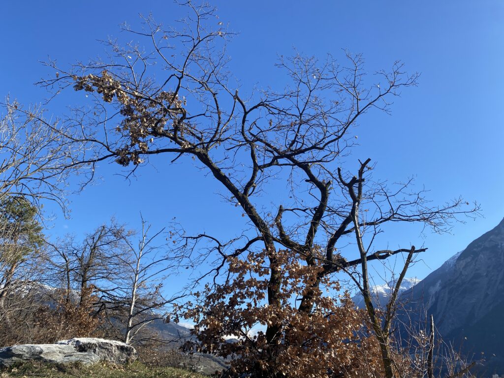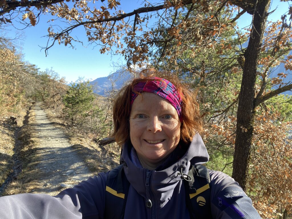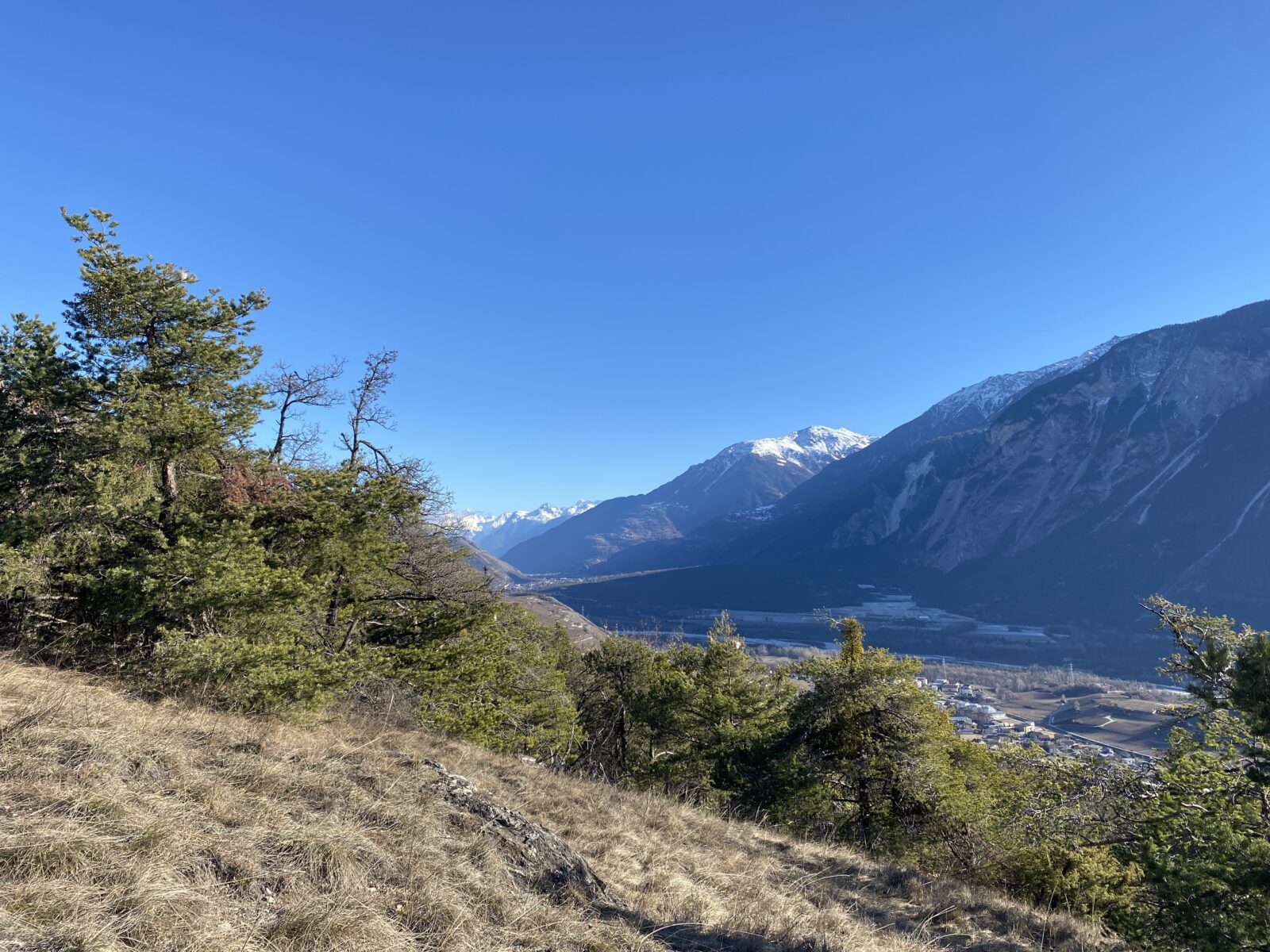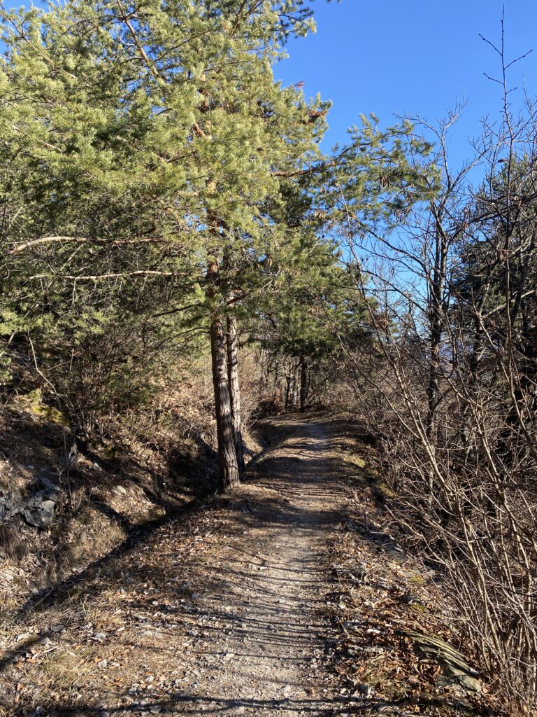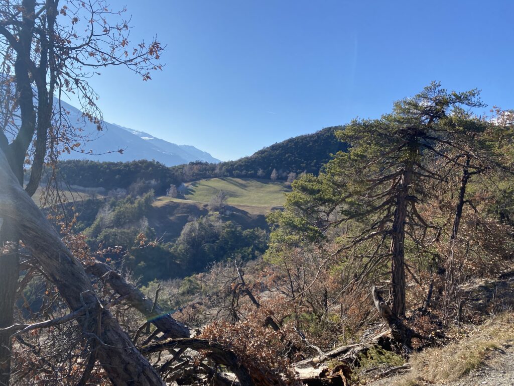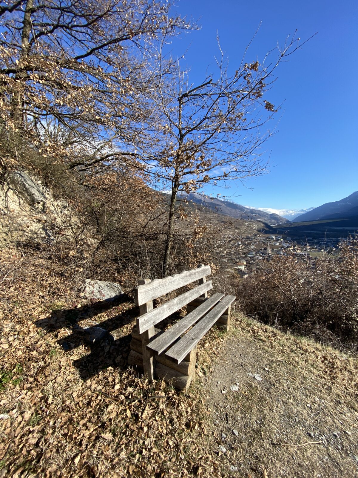 Je me trouve maintenant au-dessus de Salgesch, Salquenen, le chemin monte tranquillement d’abord dans les vignes puis dans une forêt de pins. Il semble que ce coteau fasse aussi partie du bois de Finges. Un panneau Wasserfall 15 minutes m’attire, quelques secondes suffisent pour que je me décide pour ce petit détour. Une montée par un joli sentier, un ruisseau qui serpente à côté avec des décorations de glace toutes plus belles les unes que les autres, un passage plus abrupt sécurisé par des chaînes et je m’enfonce de plus en plus loin et de plus en plus à l’ombre. Cela fait bien plus de 15 minutes que je marche. J’arrive à un pont qui enjambe la rivière avec une route carrossable qui part dans l’autre sens, tout est gelé. Un point carte, il n’y a plus de sentier. Un peu frustrée, je reviens sur mes pas. Je retrouve le soleil, et, presque arrivée sur le chemin du vignoble, je vois le panneau Wasserfall que j’avais loupé à la montée. Aucune hésitation, je m’engage dans la descente, même si je sais que je devrais remonter. Après une dizaine de minutes, je suis enfin à la chute d’eau. Un petit filet tombe de quelques dizaines de mètres, une photo pour immortaliser ce moment et je repars dans l’autre sens. Quand je suis de nouveau sur l’itinéraire prévu, je me rends compte que ma petite escapade a duré une heure.