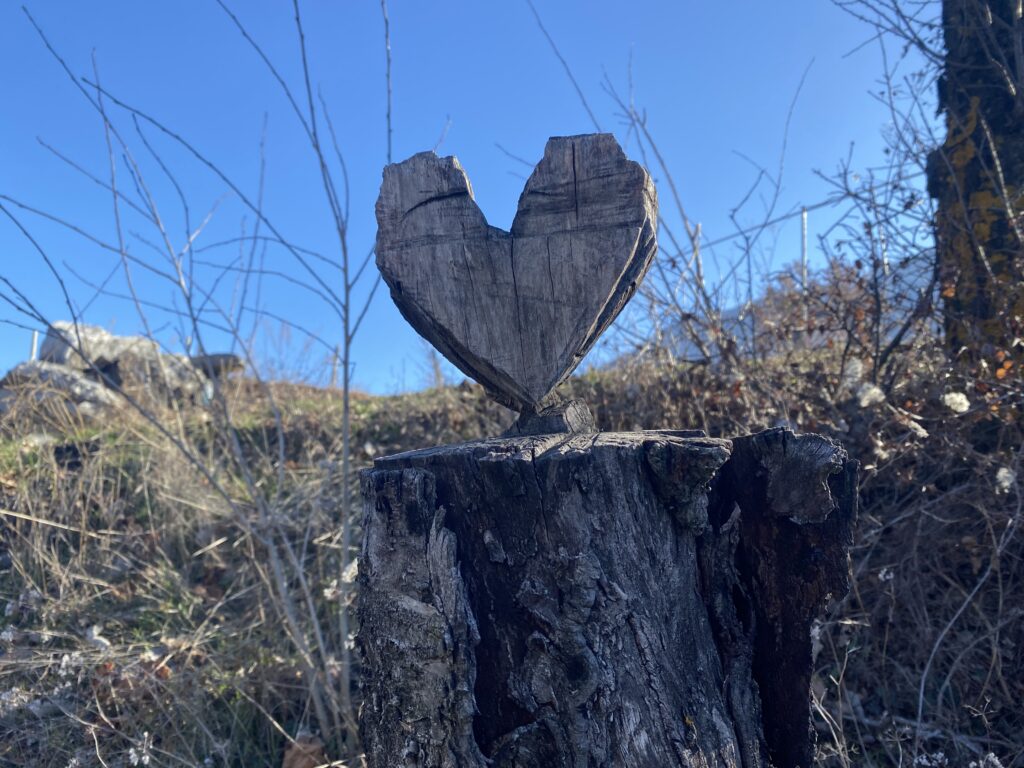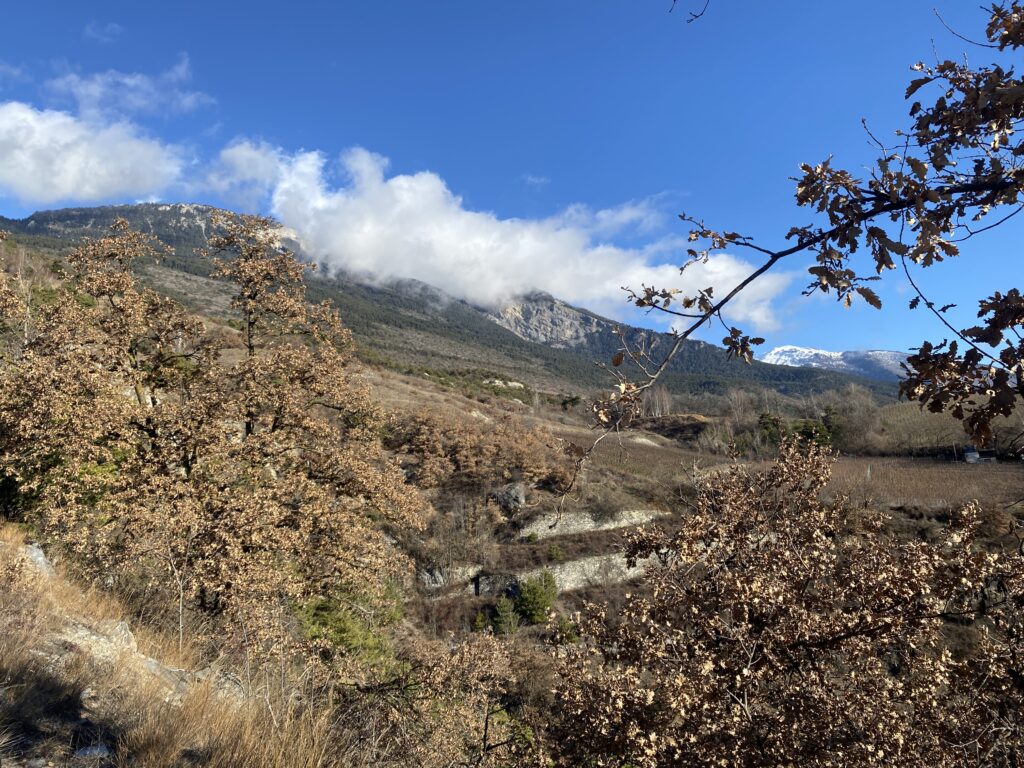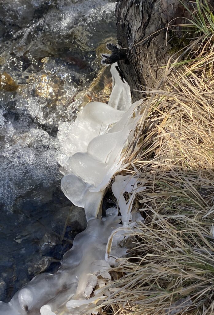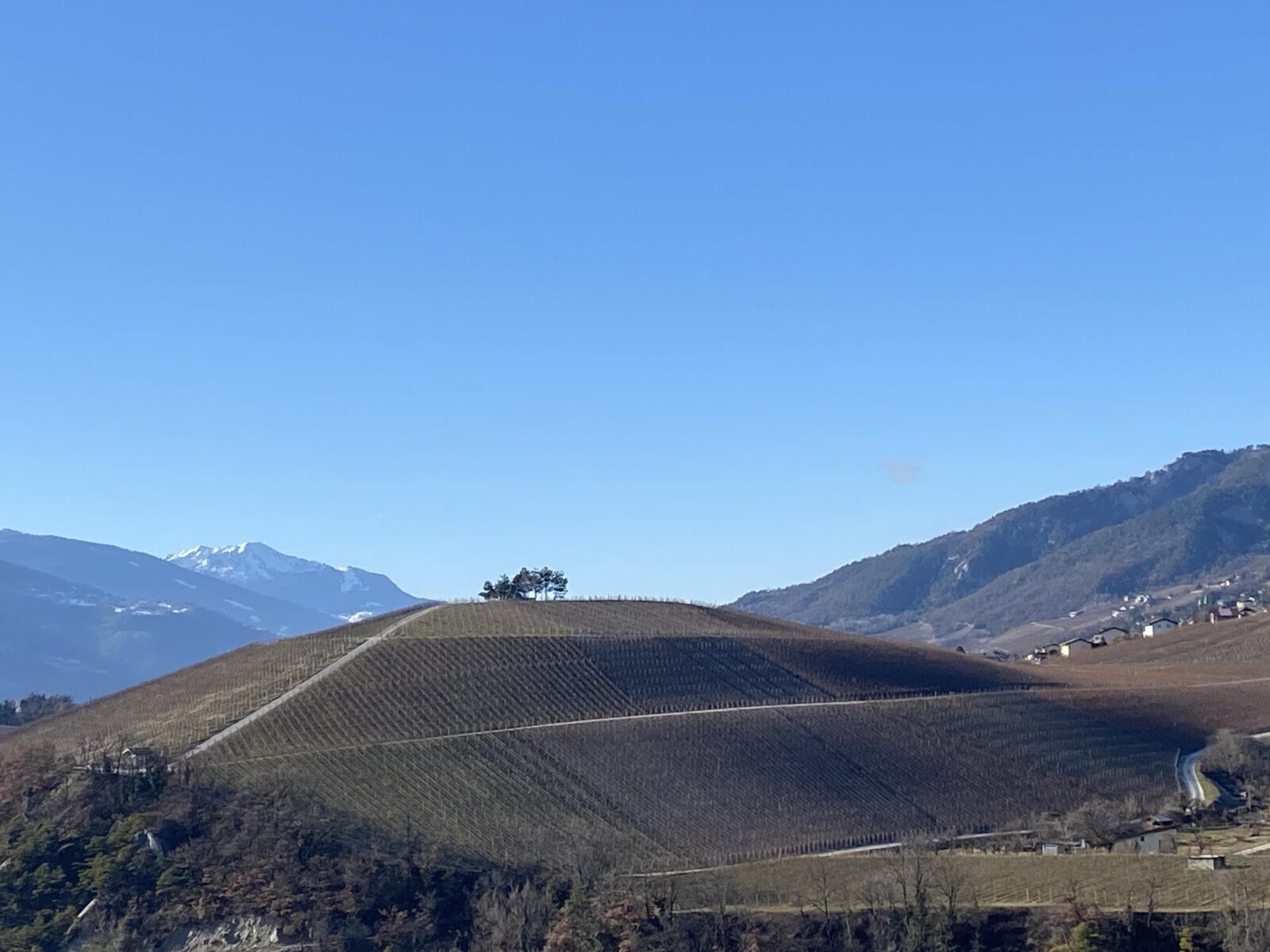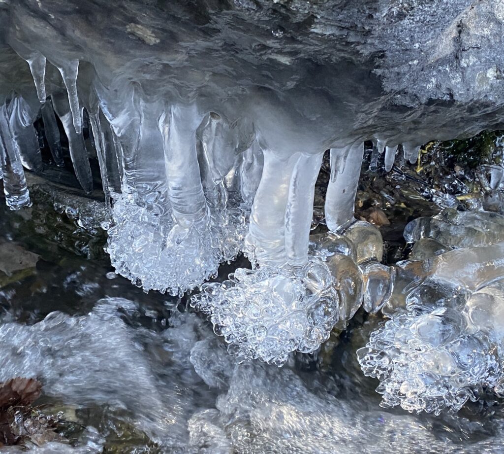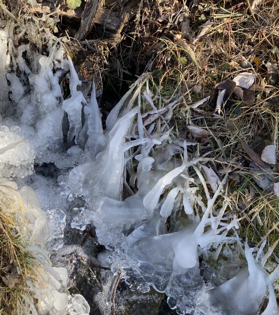 Je me trouve maintenant au-dessus de Salgesch, Salquenen, le chemin monte tranquillement d’abord dans les vignes puis dans une forêt de pins. Il semble que ce coteau fasse aussi partie du bois de Finges. Un panneau Wasserfall 15 minutes m’attire, quelques secondes suffisent pour que je me décide pour ce petit détour. Une montée par un joli sentier, un ruisseau qui serpente à côté avec des décorations de glace toutes plus belles les unes que les autres, un passage plus abrupt sécurisé par des chaînes et je m’enfonce de plus en plus loin et de plus en plus à l’ombre. Cela fait bien plus de 15 minutes que je marche. J’arrive à un pont qui enjambe la rivière avec une route carrossable qui part dans l’autre sens, tout est gelé. Un point carte, il n’y a plus de sentier. Un peu frustrée, je reviens sur mes pas. Je retrouve le soleil, et, presque arrivée sur le chemin du vignoble, je vois le panneau Wasserfall que j’avais loupé à la montée. Aucune hésitation, je m’engage dans la descente, même si je sais que je devrais remonter. Après une dizaine de minutes, je suis enfin à la chute d’eau. Un petit filet tombe de quelques dizaines de mètres, une photo pour immortaliser ce moment et je repars dans l’autre sens. Quand je suis de nouveau sur l’itinéraire prévu, je me rends compte que ma petite escapade a duré une heure.