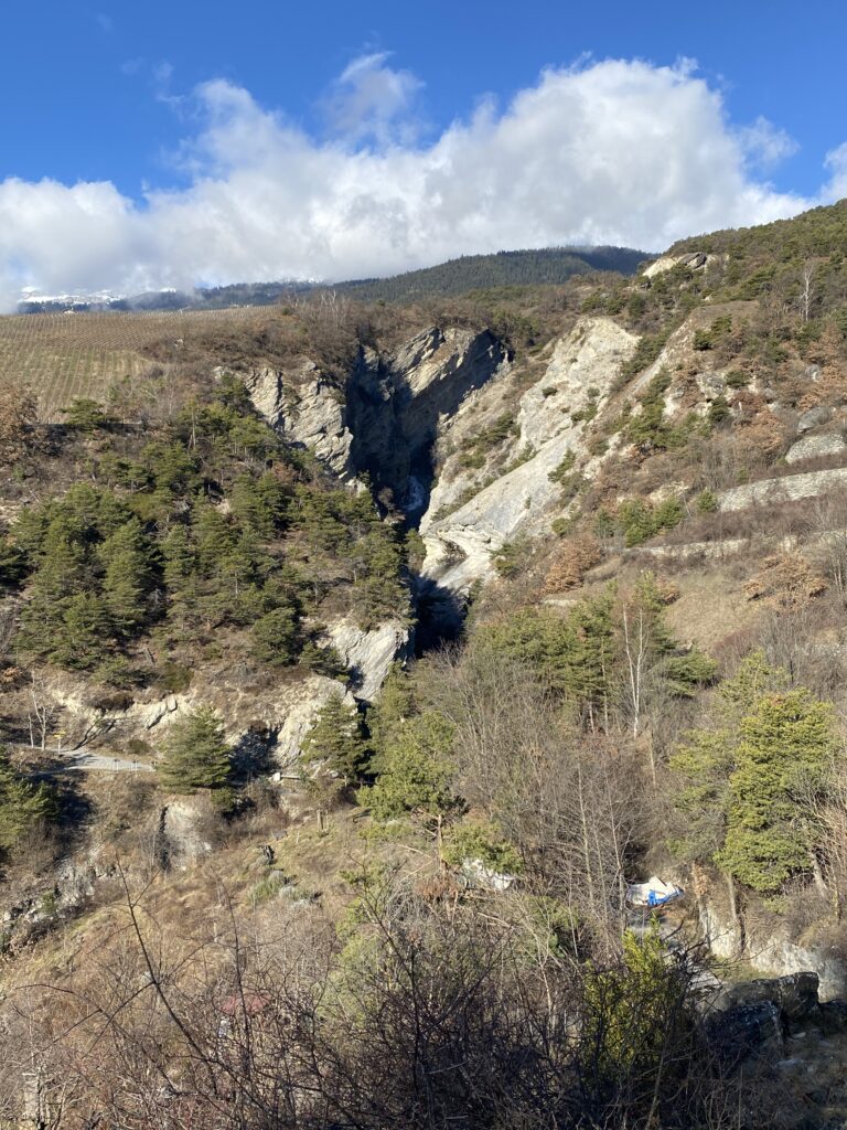 Je traverse d’autres hameaux et arrive à Miège, je trouve cette première partie un peu trop habitée et construite à mon goût. A partir de là, mon envie de nature est comblée. Après un chemin au milieu des vignes, je descends dans un vallon, qui s’ouvre sur une gorge, la Raspille. C’est la frontière linguistique. J’apprends que le Valais était germanophone jusqu’à Sion depuis le Xe siècle. Ce n’est qu’au cours des XIXe et XXe que le français est redevenu majoritaire.