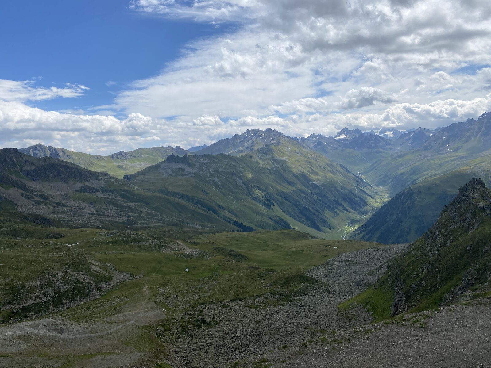Pour mon dernier jour, la météo devrait rester sèche jusqu’au soir dans la région, grâce au foehn. Je décide donc de monter en altitude. En bus et en téléphérique jusqu’à Madrisa à 1884m. Dans le MadrisaBahn, un Monsieur et son chien avec qui je partage la montée, m’encourage à me rendre jusqu’à Massplatte pour profiter de la vue sur toute la vallée. Comme la météo est annoncée meilleure le matin, je décide de m’y rendre en premier pour en profiter. Le paysage est idyllique, des ruisseaux, des mélèzes, et des rochers comme déposés par un géant. La vue est par contre déjà perturbée par de sombres nuages. Je reviens sur mes pas pour reprendre le chemin en sens inverse de mon projet initial jusqu’à Schaffürggli à 2388m, longue route sans charme, caillouteuse sous les câbles du téléphérique. Par contre, la descente qui s’offre à moi sur l’autre versant est un pur bonheur, entre rhododendrons, marmottes, ruisseaux chantants et jusqu’au moment où je rejoins le chemin qui vient de Madrisa, je ne croise personne. Le sentier jusqu’au Schlappinjoch, frontière avec l’Autriche est par contre bien fréquenté et je rejoins le col accompagnée par de nombreux randonneurs. Quelques photos et je redescends rapidement me mettre à l’abri pour manger quelque chose, car un vent froid souffle fort. Je reprends le même chemin en partie, puis suis le chemin plus ou moins à flanc de coteau dans un paysage magnifique jusqu’à Madrisa. Je remercie la rencontre de ce matin qui m’a fait faire cette boucle dans l’autre sens.