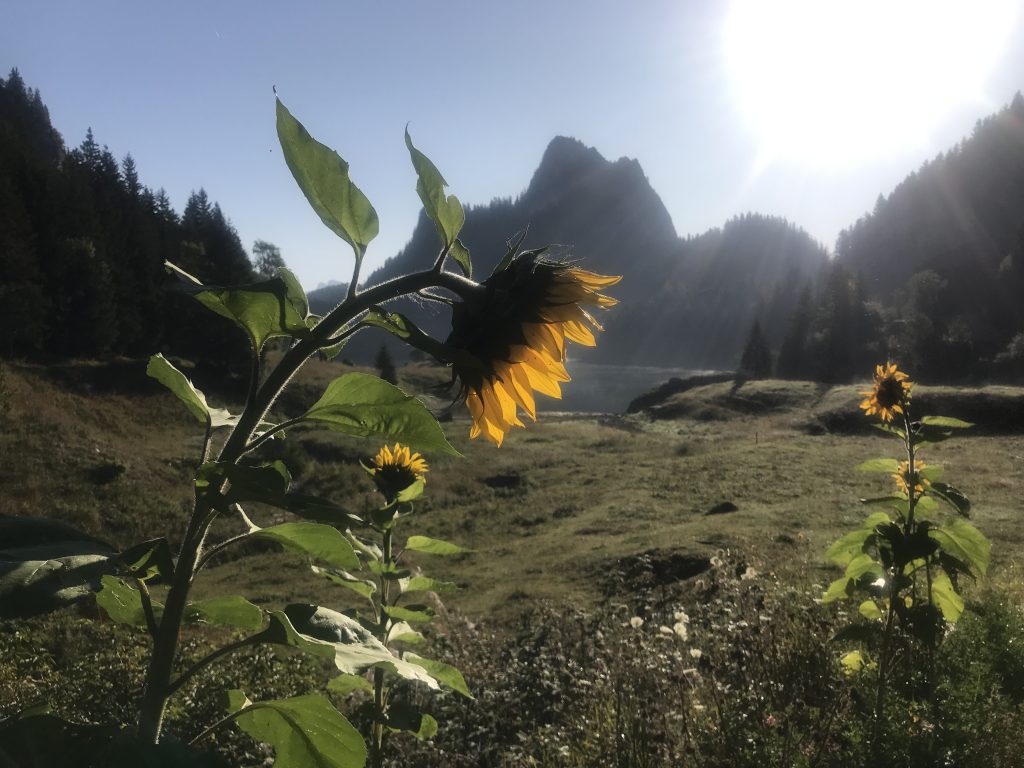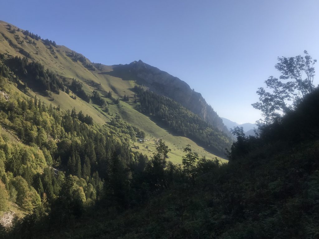 Départ pour les Cornettes de Bise. Le car postal nous dépose à Miex parking et sacs sur le dos, nous entamons de suite le gros dénivelé pour découvrir 30 minutes après dans son écrin de verdure le lac Tanay. Pause sur la terrasse ensoleillée face au lac, deux expresso servit par une charmante et accueillante personne. Courte la pause, les choses sérieuses continuent… du dénivelé positif jusqu’en haut.