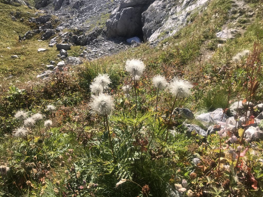 Une descente impressionnante par le flanc sud-est direction le Miex parking. Mes bâtons sont dans le sac… et m’auraient été utiles, je trébuche … chute… heureusement sans gravité. Mais la leçon est retenue… désormais descente avec les bâtons.