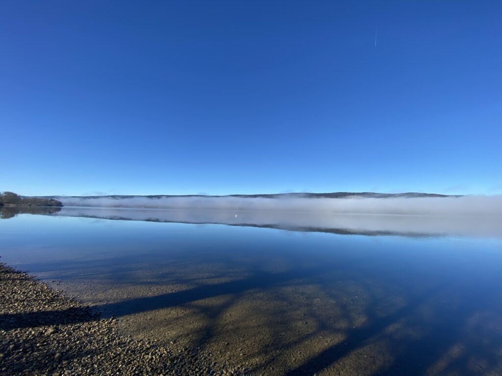 Je pars des Bioux, le brouillard trainant sur le lac rend le paysage magique.