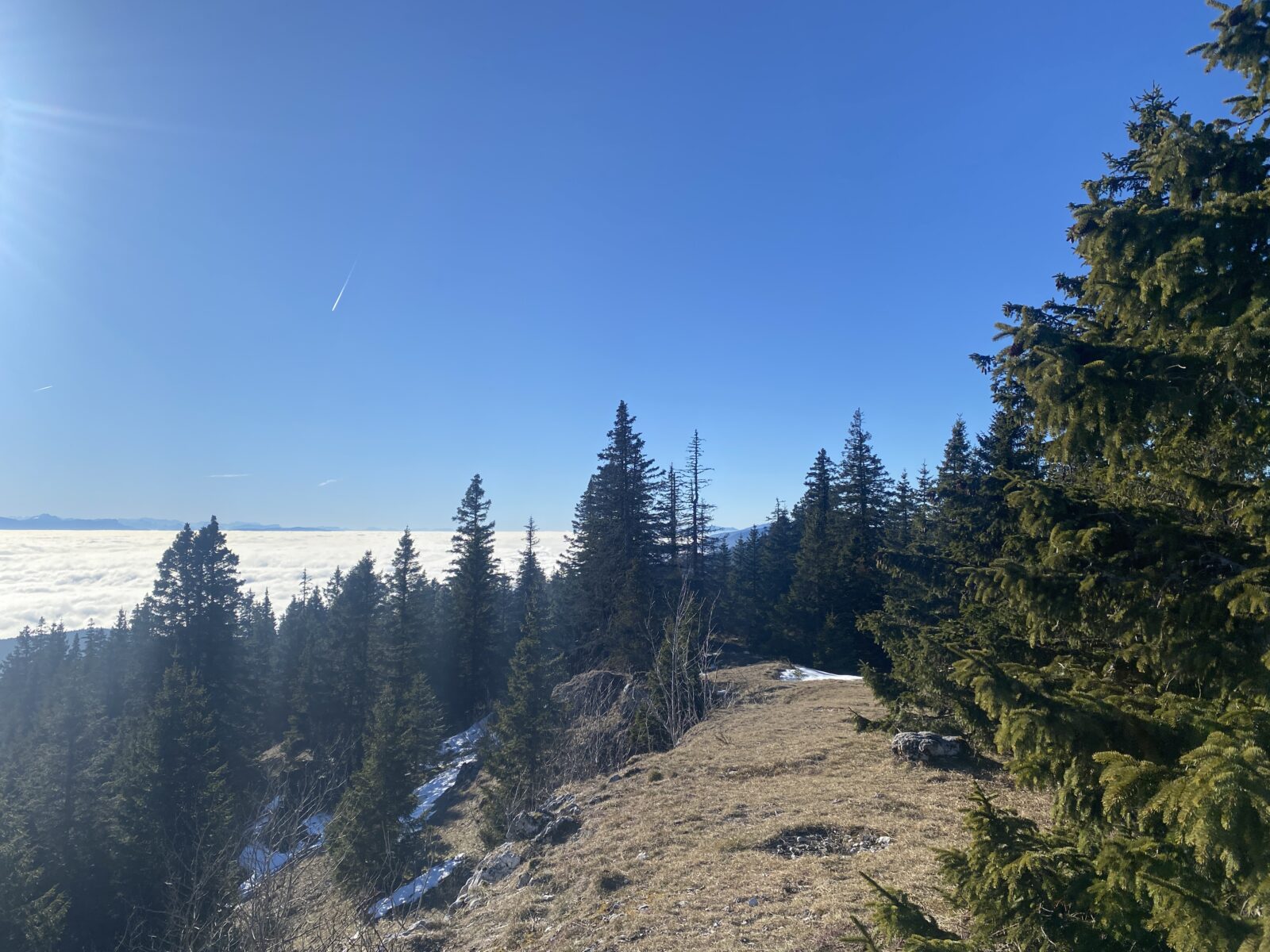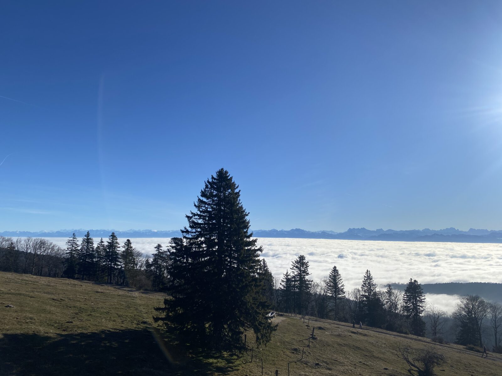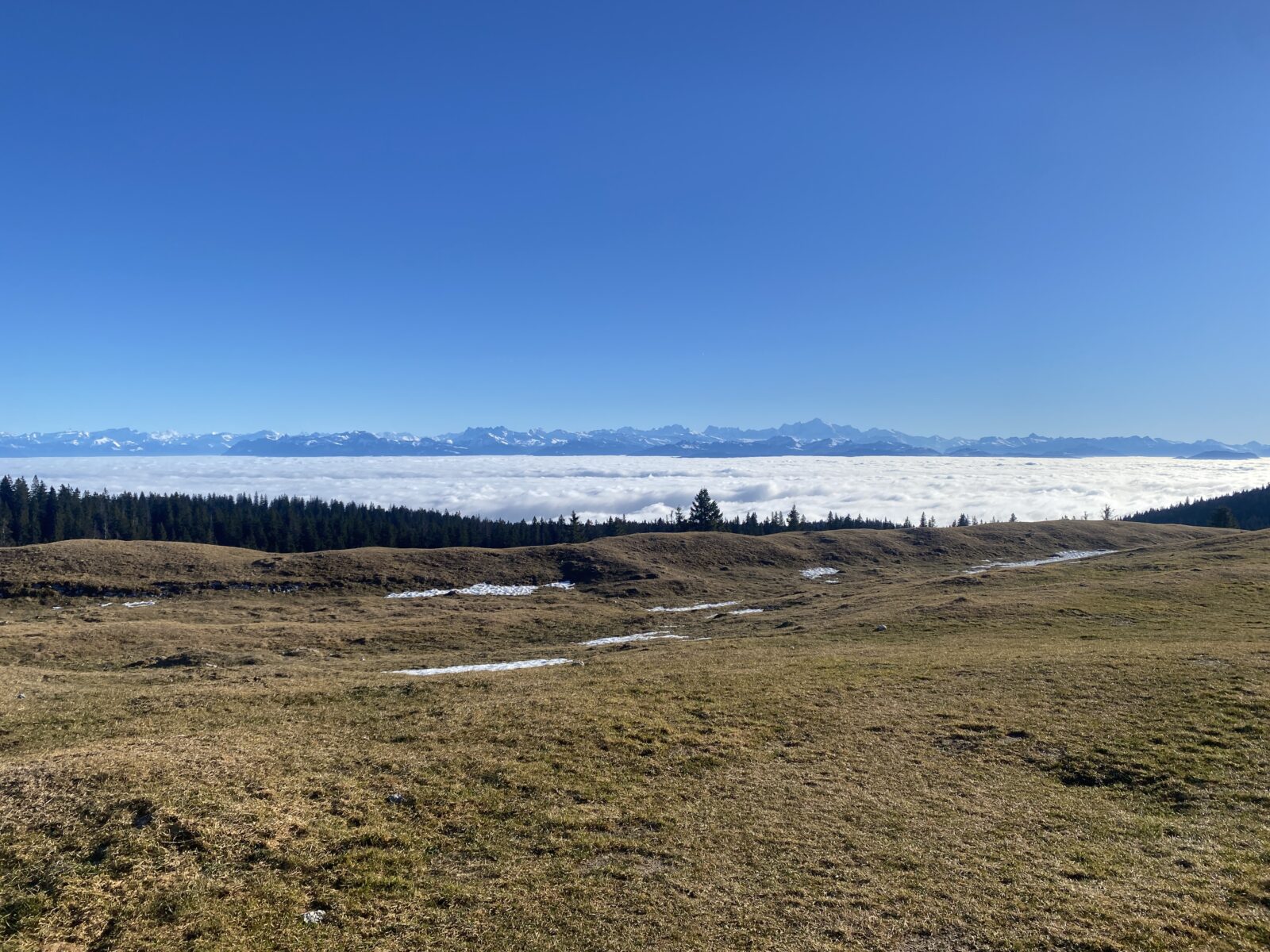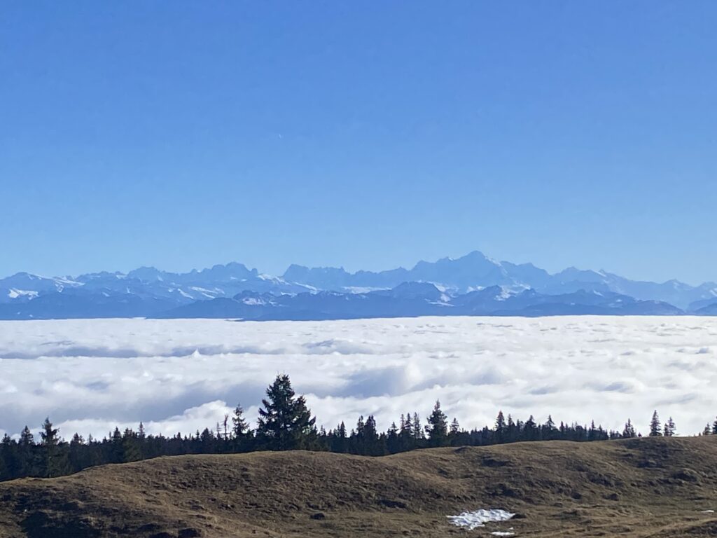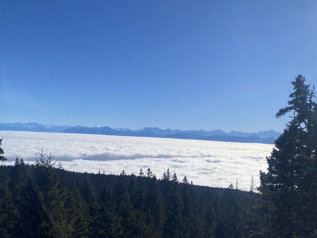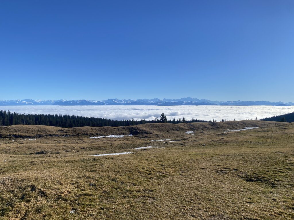 Je pars du parking de l’arbre à Siméon, un peu en dessous du col, et prend la direction de Chalet Neuf à travers les champs sans neige. Je rejoins les Monts de Bière devant, ce point de vue incroyable sur le Léman (caché par la mer de brouillard) et la chaîne des Alpes.