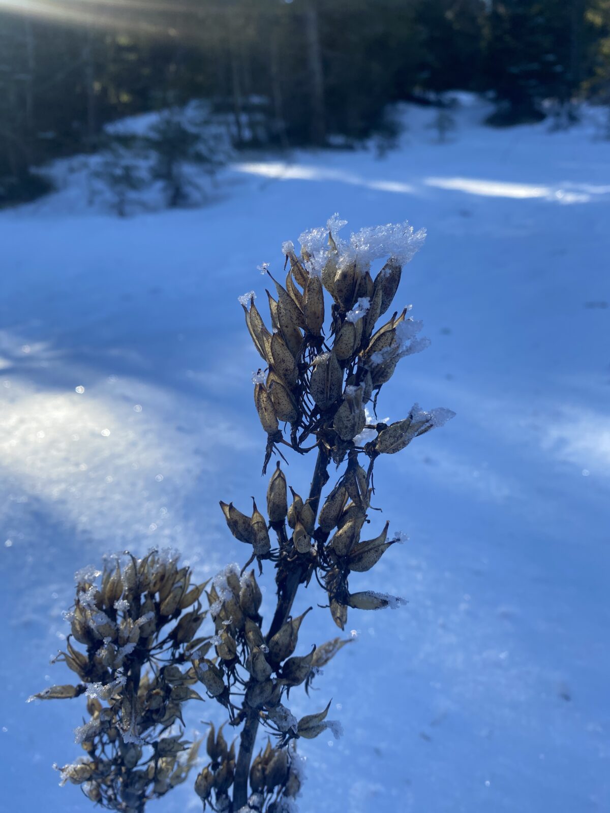 Je décide de rejoindre la cabane du Petit Cunay. La descente dans la forêt est enneigée et verglacée et je ne tarde pas à utiliser les petits crampons qui m’accompagnent à chaque sortie souvent sans voir la lumière. Autant dire qu’ils sont tout contents et moi en sécurité.