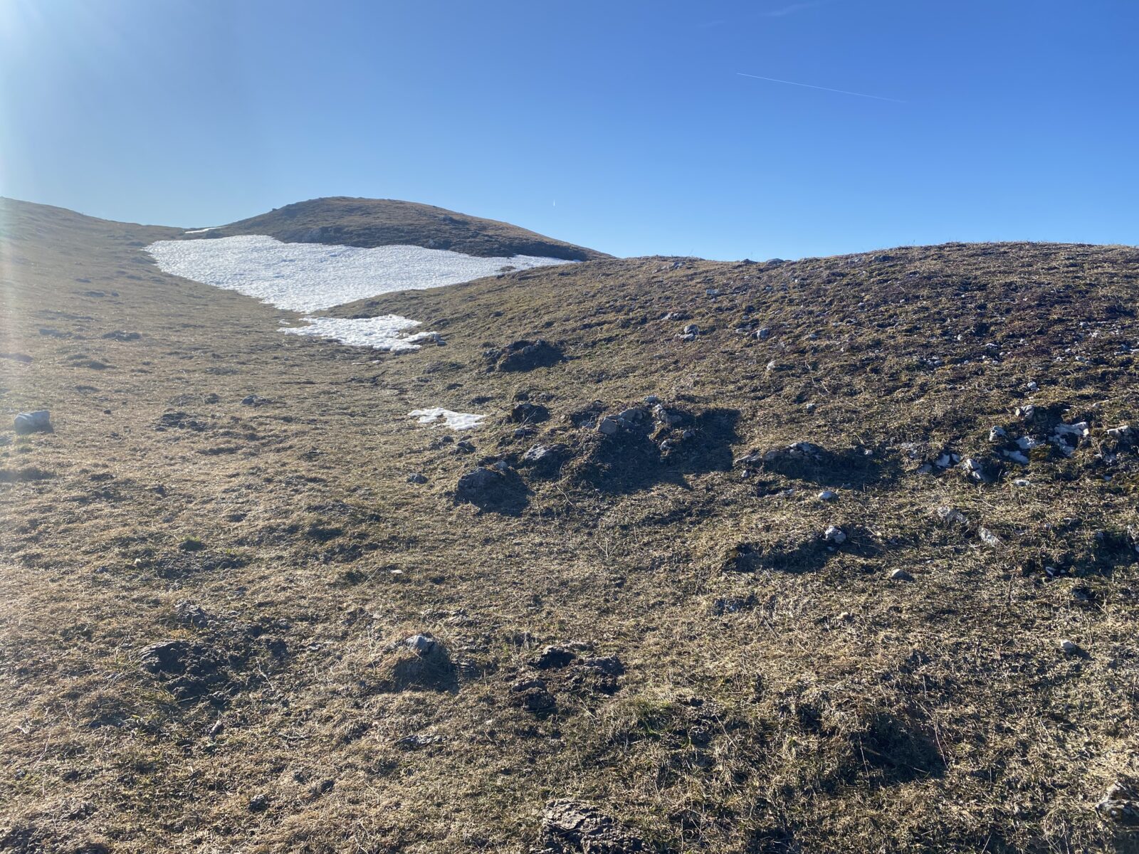 Je pique-nique à l’abri de la bise et comme je suis encore motivée, je rentre par le Grand Cunay et les Monts de Bière derrière. Sur les versants nord, la neige est bien présente et sur les versants sud, c’est l’herbe jaunie que je foule. Je repasse par les Monts de Bière devant, profite à nouveau de la vue en nombreuse compagnie et reprends le même chemin jusqu’au parking.