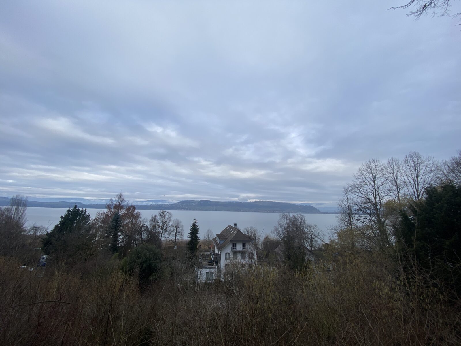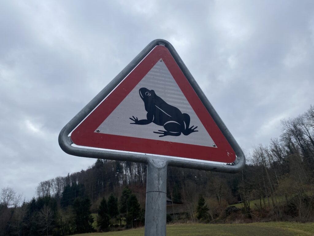 Je commence par me promener dans Morat pour profiter de cette jolie petite ville médiévale. Puis je rejoins le chemin qui longe le lac jusqu’à Greng. Je marche dans la campagne et au milieu de champs et de fermes, je me rends compte que c’est une région agricole. Il fait gris et le temps est très humide, d’ailleurs les panneaux de signalisation sont adaptés.