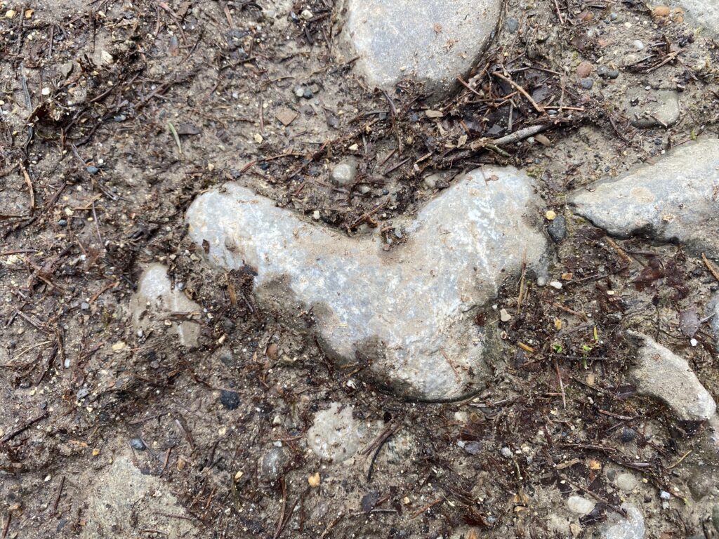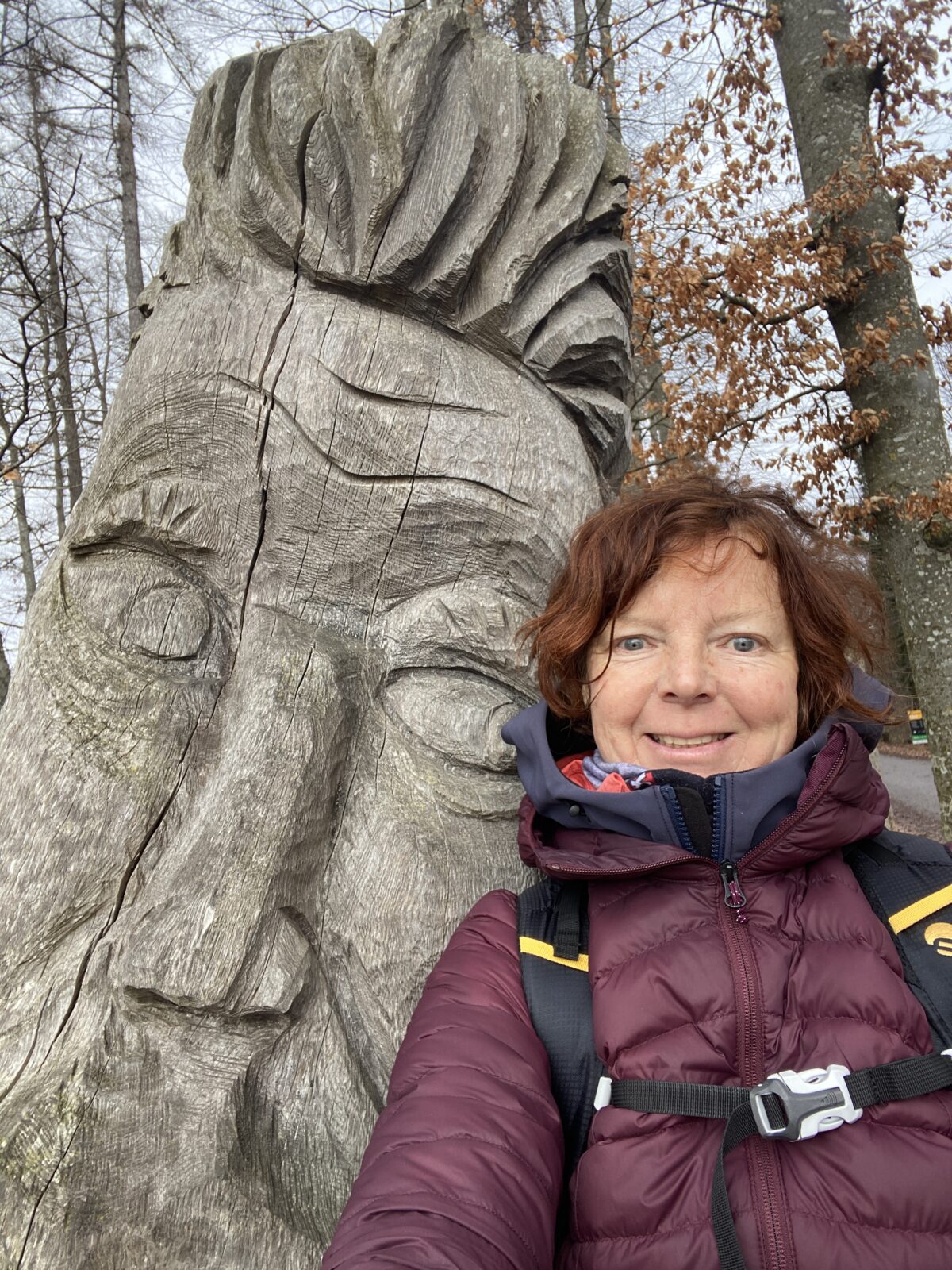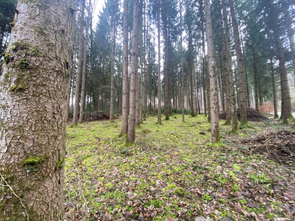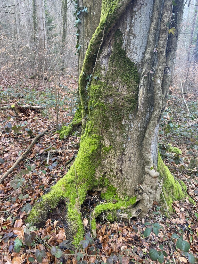 Je monte dans la forêt en direction de la Corbaz, le point le plus haut de la journée, à 683m. J’attends une clairière pour manger, assise sur des rondins coupés. Je me refroidis malgré les nombreuses couches enfilées et repars d’un bon pas.