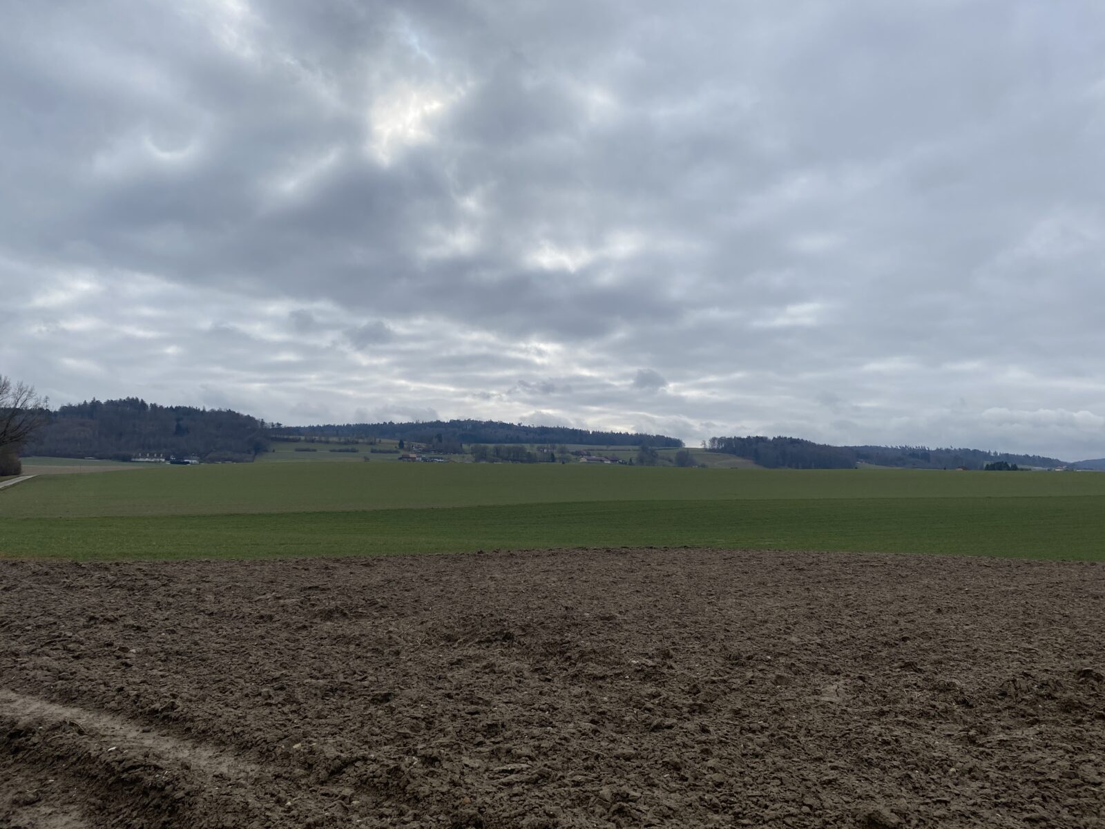 Je traverse un quartier d’habitations puis retrouve la campagne, la forêt et la nature pratiquement jusqu’à Givisiez avec le soleil.