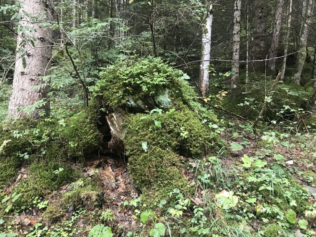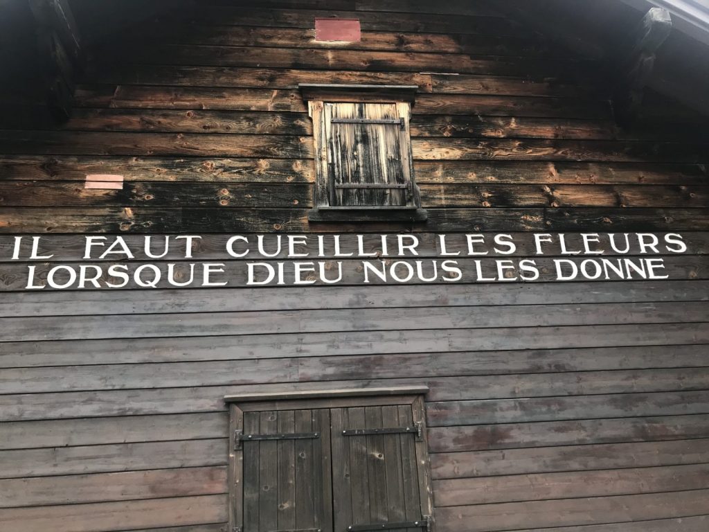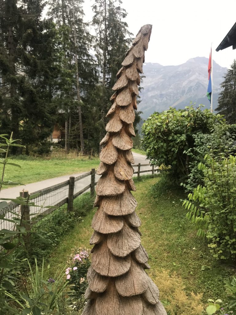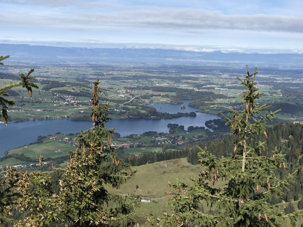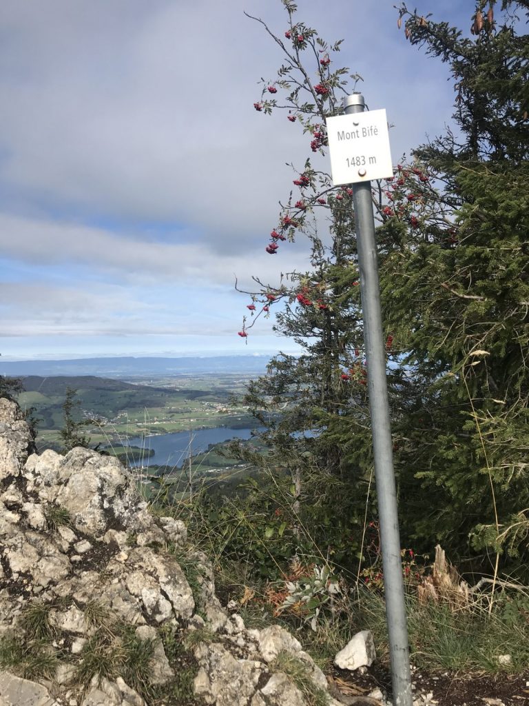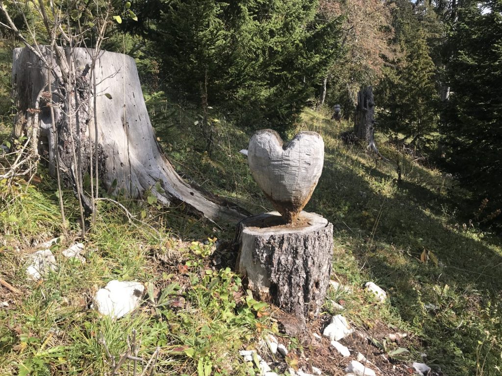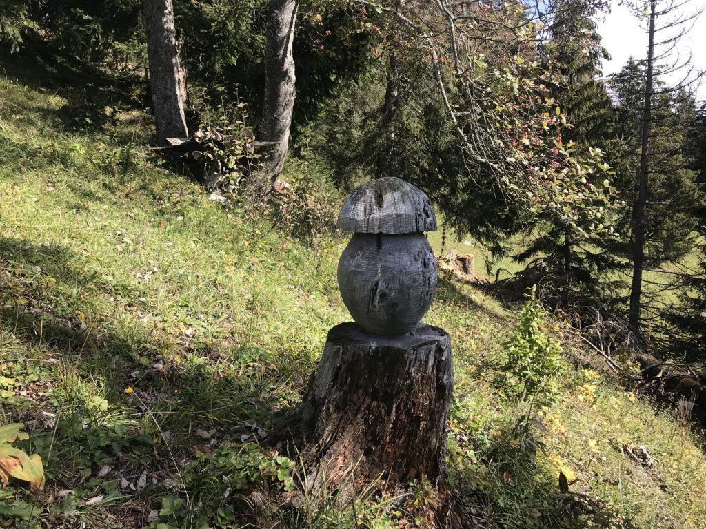 Partie de Cerniat j’ai choisi de passer par Petits Monts et le Mont Bifé comme pour prolonger l’approche ! De pâturages déserts de vaches et de leurs sonnailles (snif) aux forêts qui se teintent de couleurs automnales, le chemin rejoint la crête jusqu’au Mont Bifé. De là, la vue plonge sur le lac de Gruyère et le chemin plonge aussi. Courte descente et remontée facile vers le Vanil des Courts. Je profite des œuvres d’un bûcheron poète. Pause pique-nique au sommet à admirer la vue sur les sommets, les ondulations encore vertes des collines environnantes et les arabesques du lac.