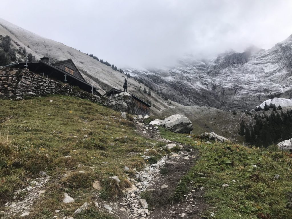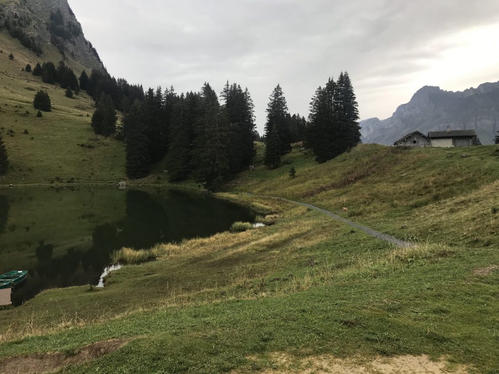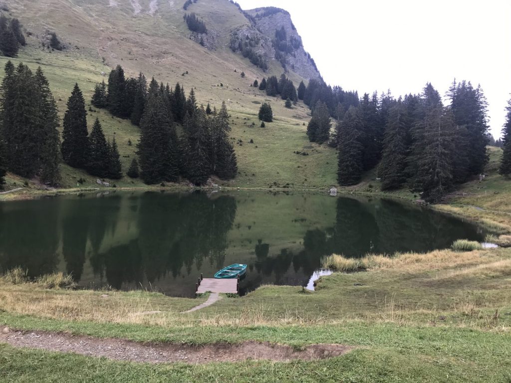 Le temps incertain me fait choisir un tracé court, les Diablerets lac Retaud et retour par le Pont Bourquin. Pas âme qui vive, une averse qui me permet de tester mon pantalon de pluie ! car depuis les bourrasques de vent de 120 km/h au Chasseral ce printemps, j’ai renoncé à la cape de pluie. Le restaurant du Lac Retaud semble bien vide et aucune envie d’aller boire un café avec un masque sur le nez.
