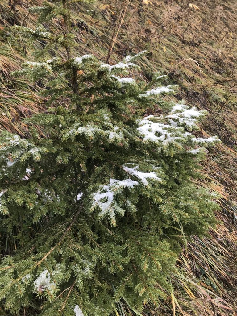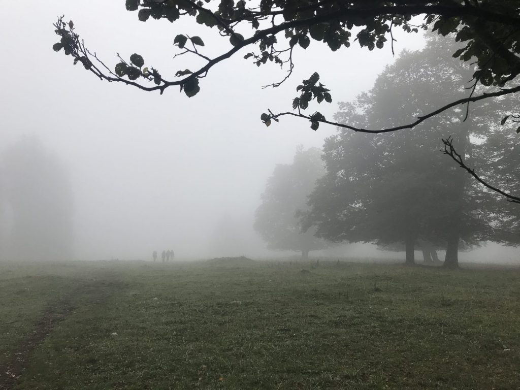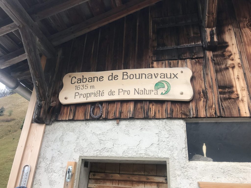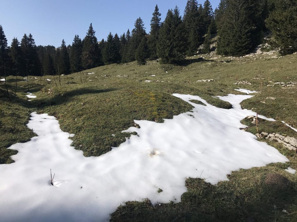 La montée jusqu’à refuge de Pro Natura à Bounavau se déroule facilement, petite pause, nous nous refroidissons vite et repartons sur un sentier terreux, bien humide et à flanc de coteau, rapidement nous nous rendons compte que nous allons arriver dans la neige, d’ailleurs les sapins autour de nous sont saupoudrés, le brouillard monte et nous décidons prudemment de faire demi-tour. Pause pique-nique au refuge, les marmottes sifflent encore à l’approche d’un rapace et d’un renard, quand vont-elles hiberner, est-ce la météo qui les encourage, leur horloge biologique ou dès qu’elles ne trouvent plus de nourriture ?