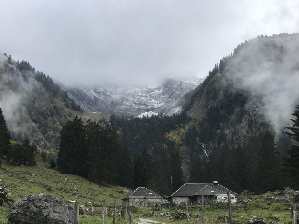 Sortie prévue avec Didier et un couple d’amis qui ont un contretemps et nous nous décidons de partir un peu à l’arrache pour Grandvillars, direction Bounavau le Van, les Merlas et retour à Grandvillars par Estavannens. Il a plu pendant la nuit ajoutant une humidité pénétrante à la température fraîche, peu importe, le chemin qui grimpe régulièrement nous réchauffe rapidement. Nous rions du nom du torrent local, Rio des Marais que nous renommons Rio del Mare pour nous croire en Amérique du Sud et sentir le chaud. Les sommets sont dans les nuages et ce n’est que quand nous arrivons aux Baudes que nous remarquons que la neige est proche, très proche.