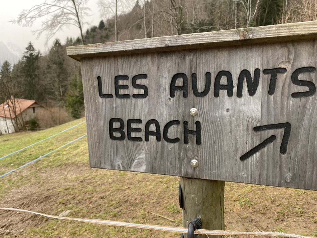 Pause repas agréable au Cubly avec tables et bancs et vue partielle sablonneuse sur le Léman.