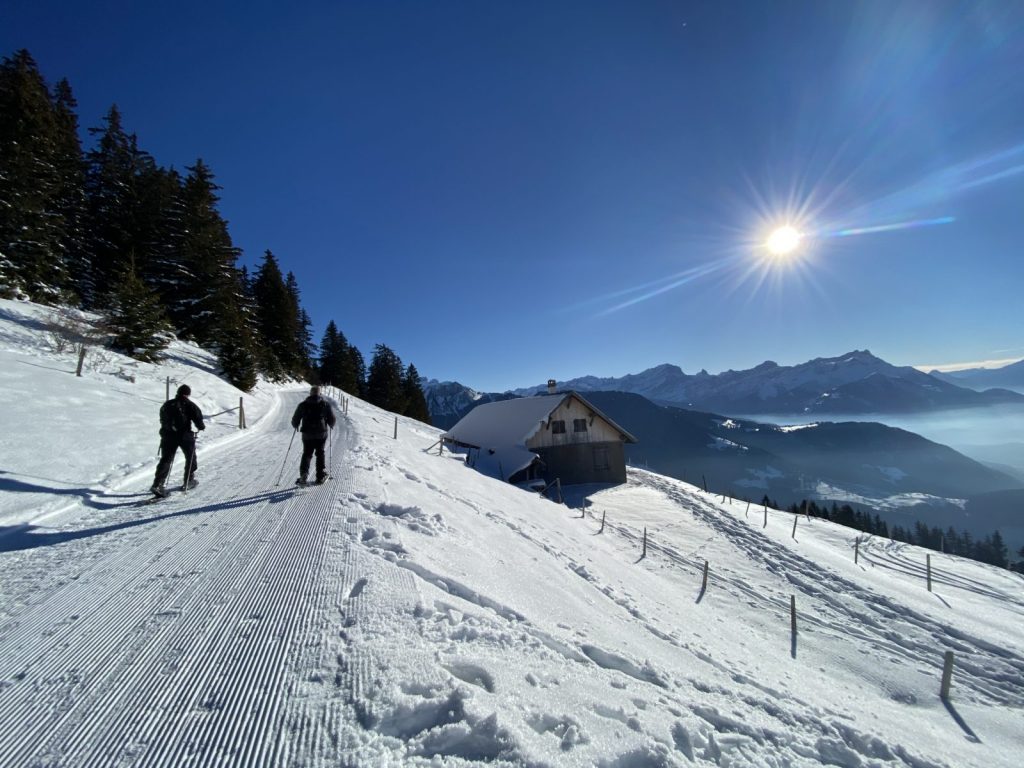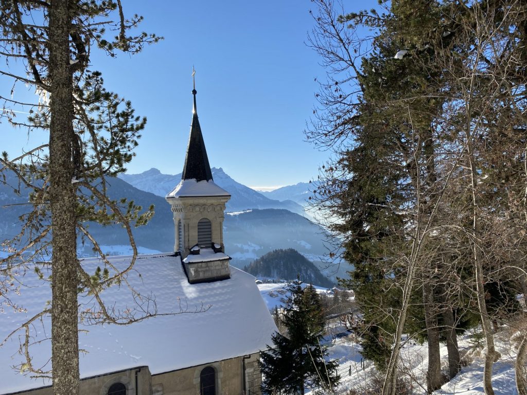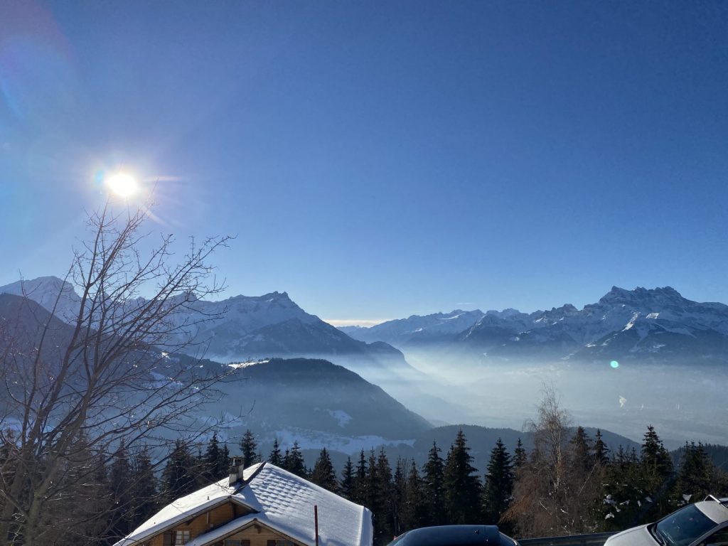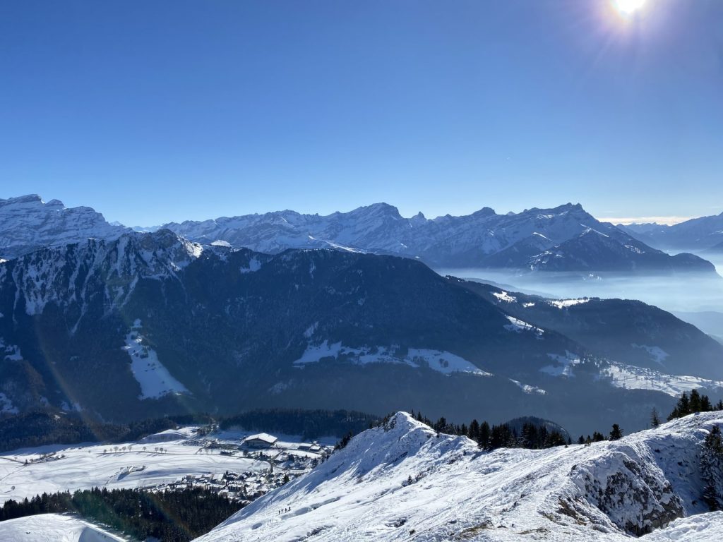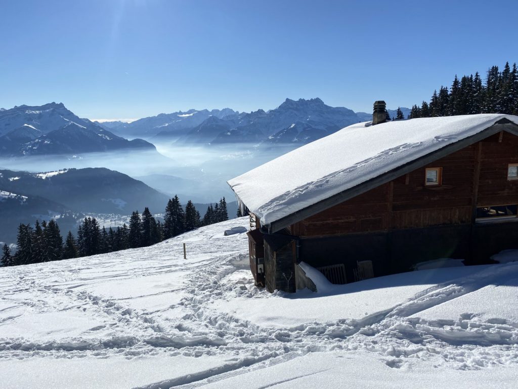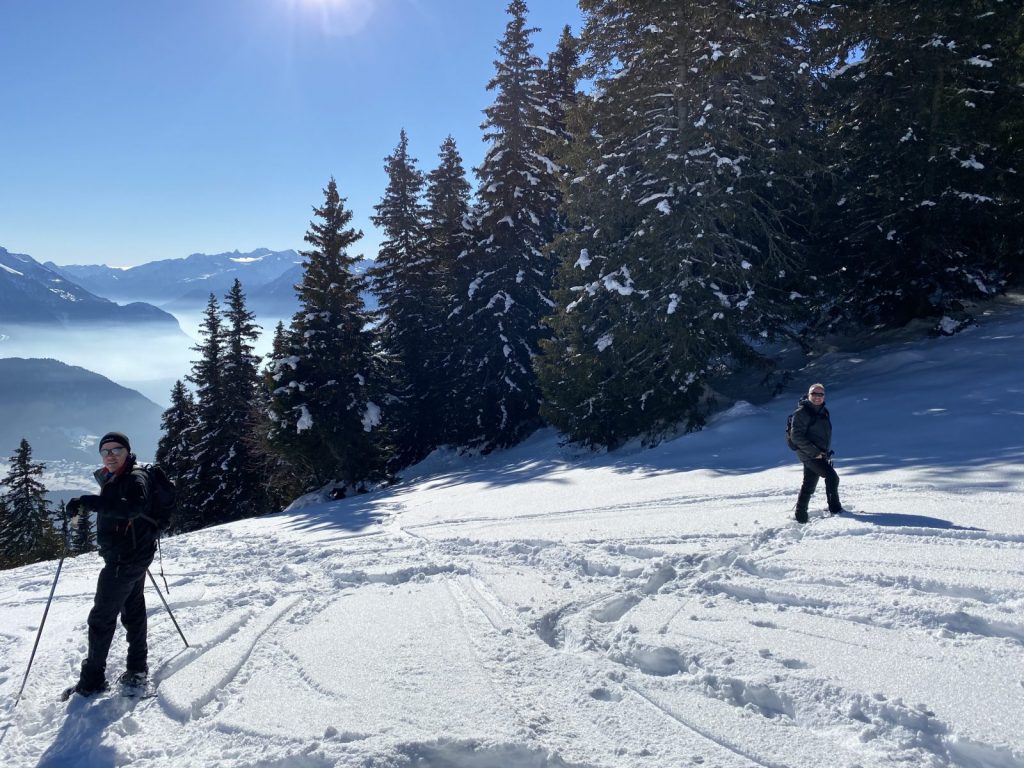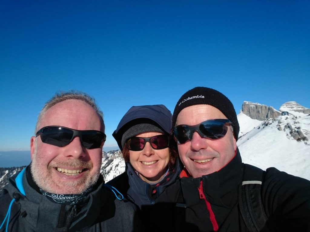 Départ en ce dimanche avec Didier et Jean-Daniel pour Leysin et un tour sur un sentier raquettes au-dessus du village. La météo est vraiment fantastique, grand soleil et doux. Nous suivons le tracé raquettes No 464 bien tracé et tassé, en fait les raquettes ne seraient pas nécessaires. Au lieu dit Solacyre, nous continuons jusqu’au sommet la Riondaz à 1980m, là le vent fort nous refroidit et après la pause photos, nous redescendons pour le pique-nique à Solacyre et profitons de la terrasse de l’auberge fermée pour nous restaurer. Le retour par des champs de neige pour nous éclater et nous rejoignons Prafandaz puis Leysin par le tracé officiel. Balade facile et bonne mise en jambes pour mes compères du jour pour qui c’est la première sortie raquettes de la saison.
