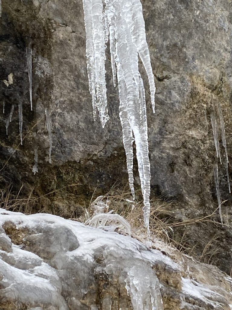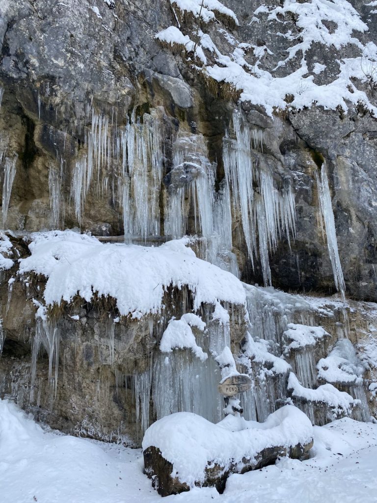 J’ai suivi la route direction la glacière, j’ai découvert « l’eau pendante « avec de superbes glaçons et suis remontée en direction de Petit Pré de Rolle (sans y aller) pour redescendre sur St-Georges (et en fait il y a une belle remontée). Peut-être qu’il y a un chemin plus direct, j’ai marché sans itinéraire et sans carte.