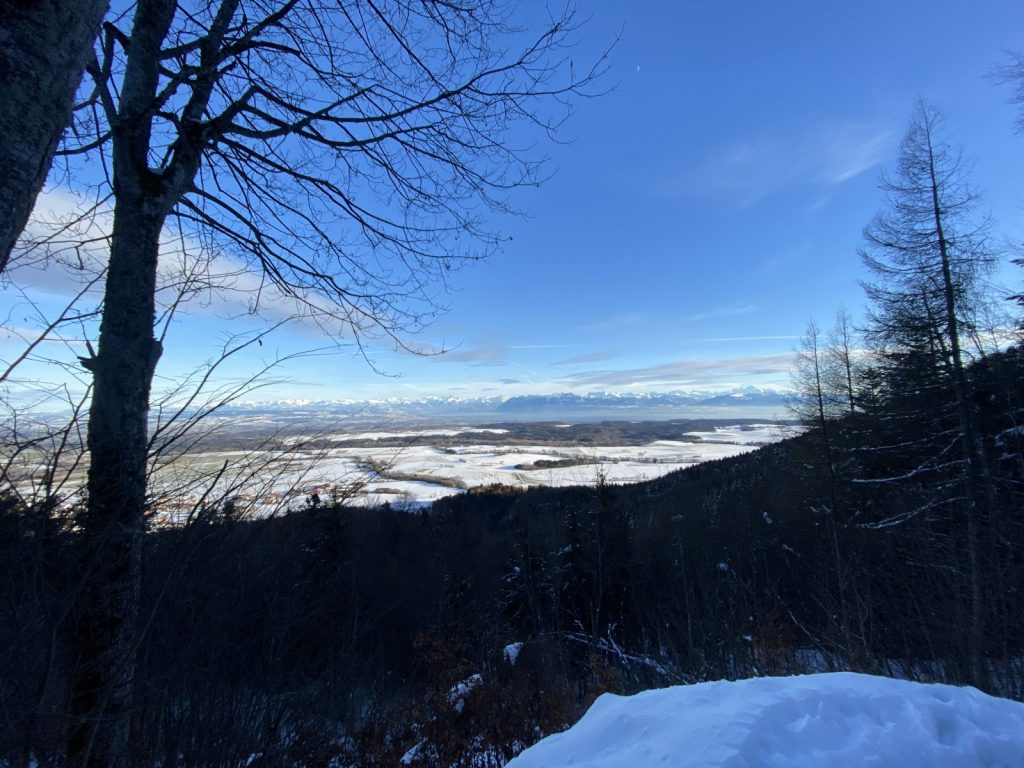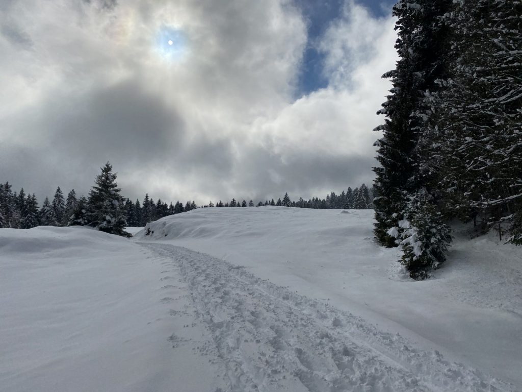 Cette journée s’annonce belle, alors nous nous décidons Pierre-André et moi pour une sortie raquettes, la neige étant encore très présente. Ce matin, je vais d’abord pédaler pour amener mon vélo électrique au service, donc le départ est plus tardif qu’à notre habitude et nous nous décidons pour le pied du Jura, Montricher et sa Croix de Chatel. C’était sans compter notre envie sportive et nous changeons d’avis en concertation totale (comme souvent), et nous voilà partis pour le Mont Tendre, bon d’accord j’y étais dimanche, mais quand on aime, on ne compte pas. Les raquettes restent sur le sac à dos jusqu’au Pré Anselme, la neige est tassée et gelée, ce qui n’est pas gênant à la montée.