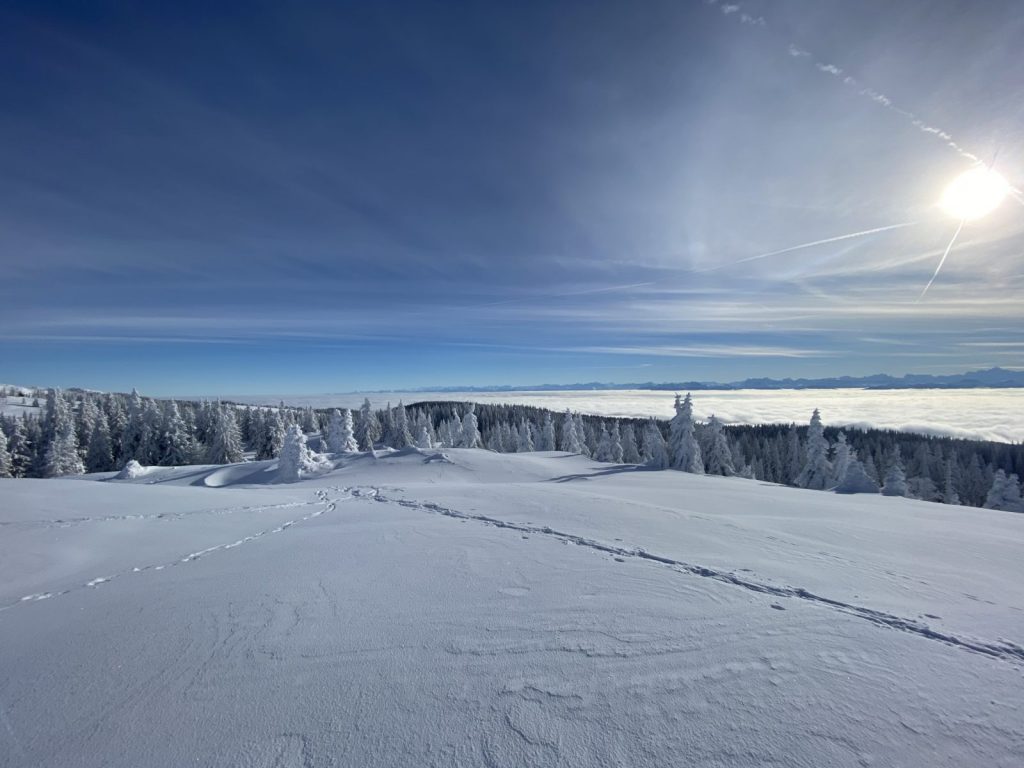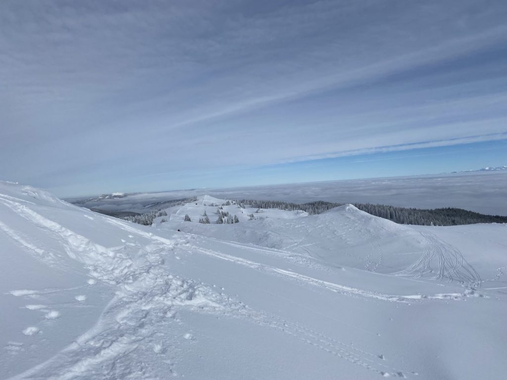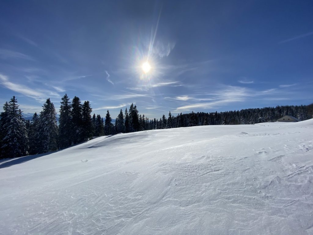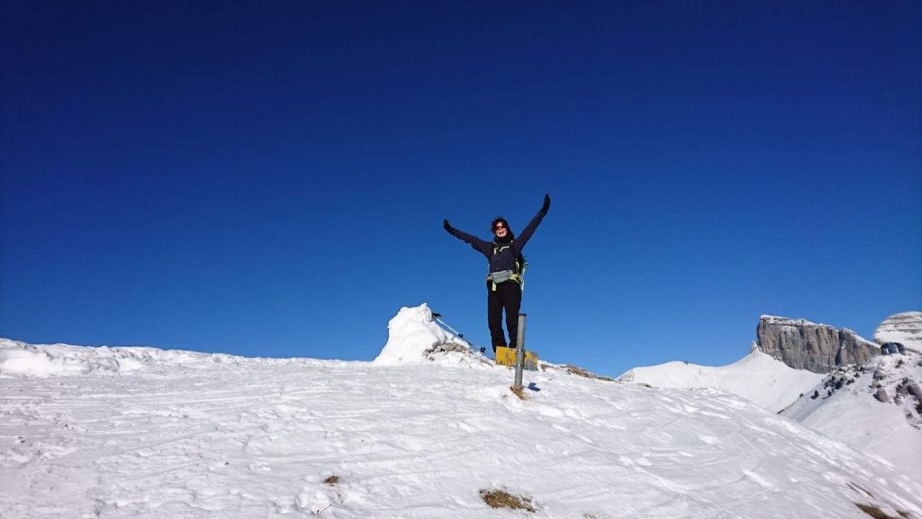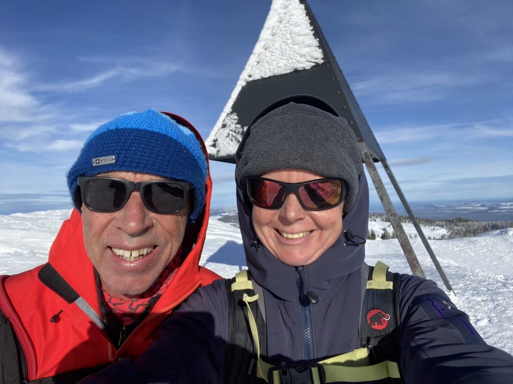 Le vent nous balaie sur le Pré Anselme et nous sommes contents de retourner dans la forêt abritée pour la suite du trajet. Des skieurs à la descente nous avertissent que là-haut ça décoiffe ! Et en effet, un vent fort et glacial nous transperce a peine arrivés au niveau de la Buvette. Nous décidons de nous abriter sous l’avant-toit pour rapidement manger un sandwich et boire du thé chaud, car j’ai besoin de forces pour le dernier tronçon jusqu’au sommet. Et quelle bonne idée, la dernière montée nous réchauffe totalement et nous permet de profiter du sommet avec plaisir. La descente euphorique à travers les champs de neige nous ramène au Pré Anselme en moins de temps qu’il ne faut pour le dire. Pierre-André me prête ses mini crampons pour le reste de la descente et je me sens toute légère et en sécurité. Une belle découverte.