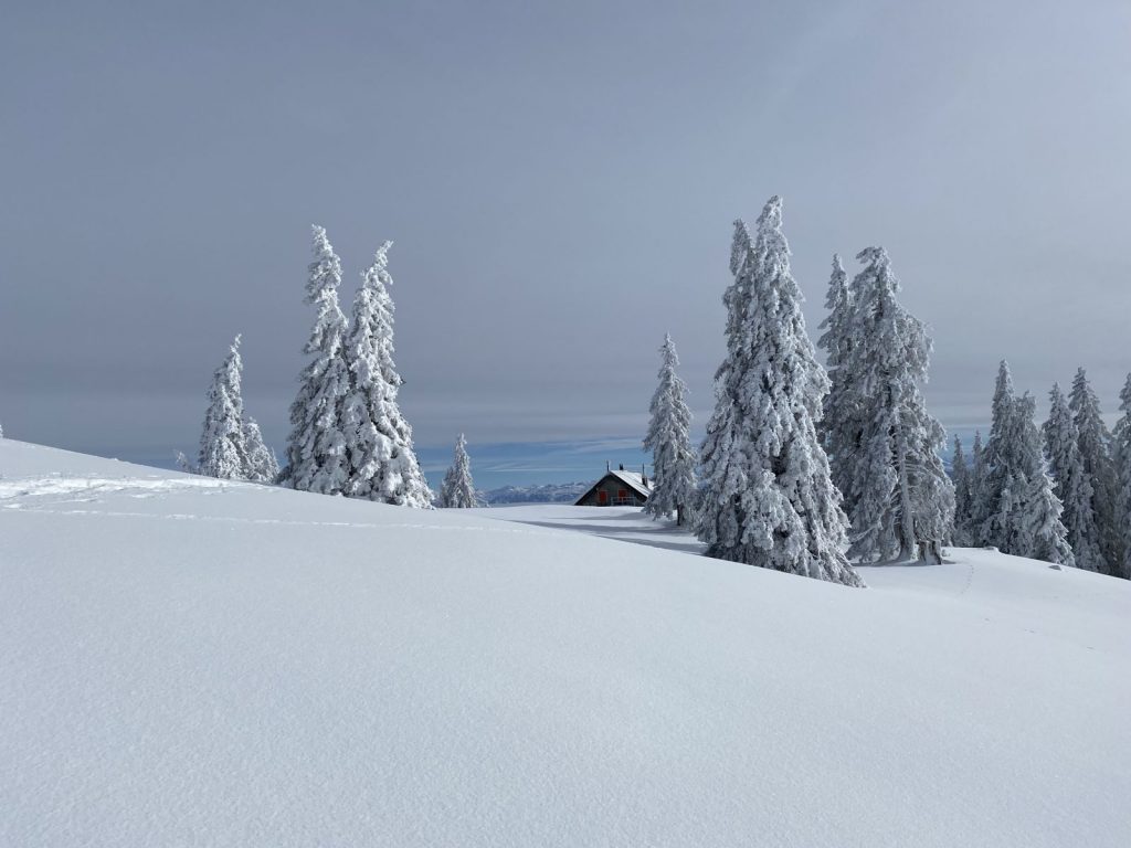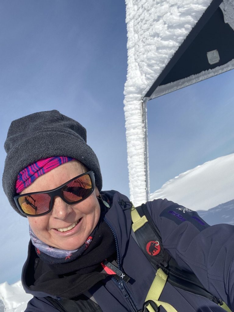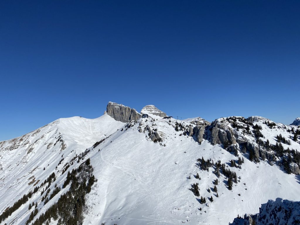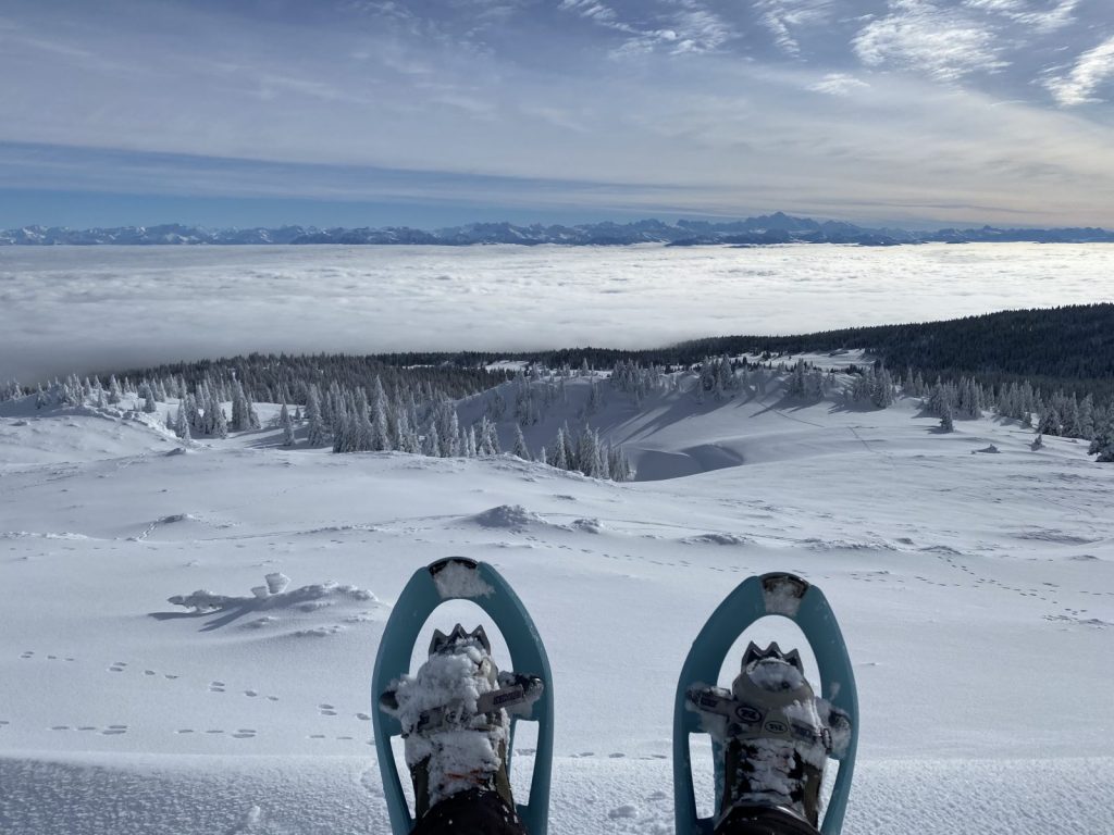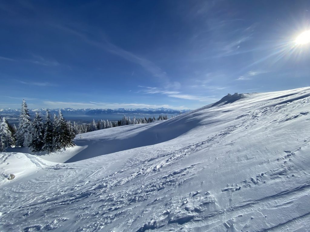 Le vent nous balaie sur le Pré Anselme et nous sommes contents de retourner dans la forêt abritée pour la suite du trajet. Des skieurs à la descente nous avertissent que là-haut ça décoiffe ! Et en effet, un vent fort et glacial nous transperce a peine arrivés au niveau de la Buvette. Nous décidons de nous abriter sous l’avant-toit pour rapidement manger un sandwich et boire du thé chaud, car j’ai besoin de forces pour le dernier tronçon jusqu’au sommet. Et quelle bonne idée, la dernière montée nous réchauffe totalement et nous permet de profiter du sommet avec plaisir. La descente euphorique à travers les champs de neige nous ramène au Pré Anselme en moins de temps qu’il ne faut pour le dire. Pierre-André me prête ses mini crampons pour le reste de la descente et je me sens toute légère et en sécurité. Une belle découverte.