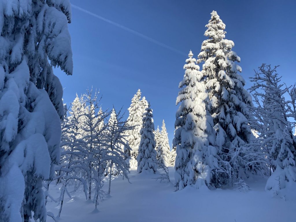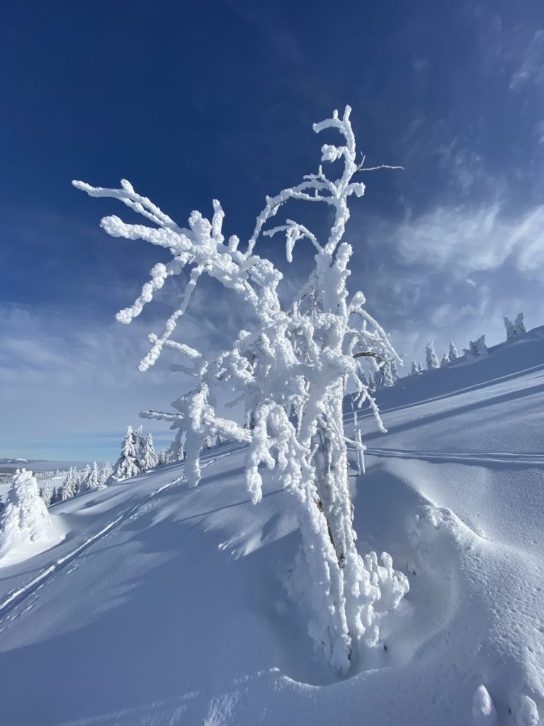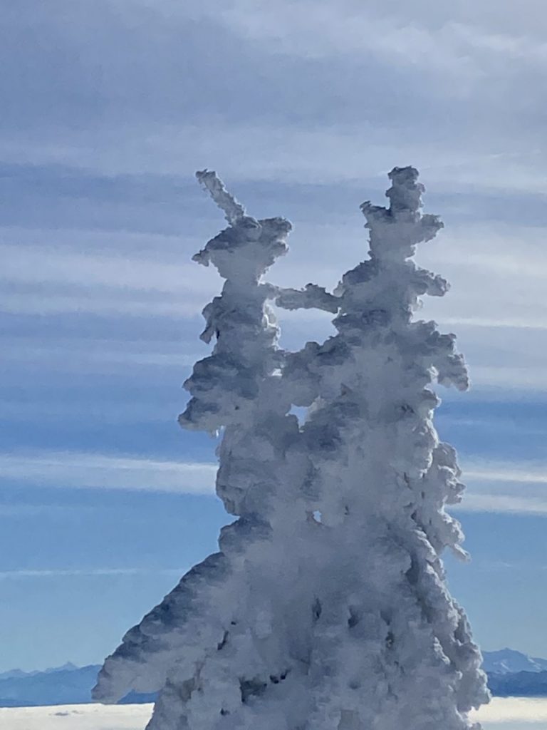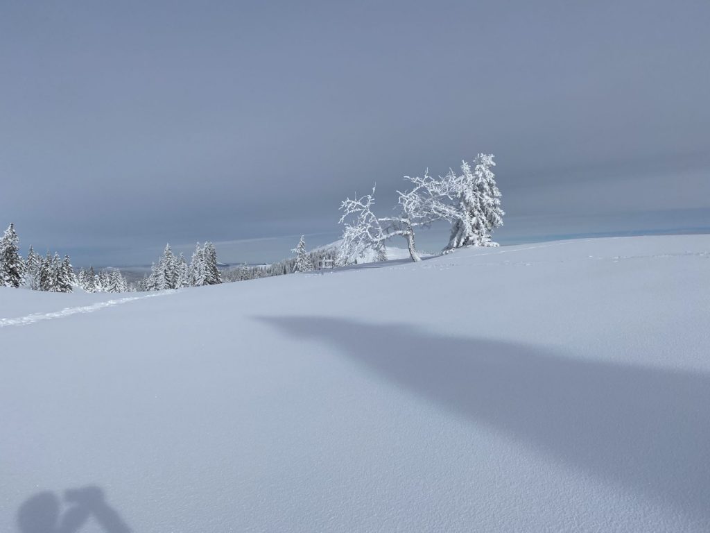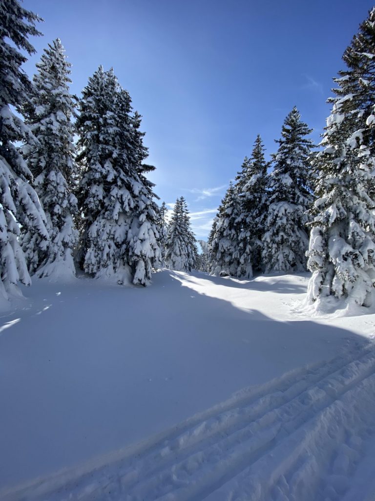 Nous avons pris quelques libertés avec le tracé officiel d’été, en ligne droite par les mamelons et les vallons ce qui a probablement ajouté du dénivelé et de l’effort dans la haute neige et tellement de plaisir et de rires aussi. Les sapins et les arbres étaient encore tout décorés de givre et c’est comme si des personnages étaient perchés à leur sommet.