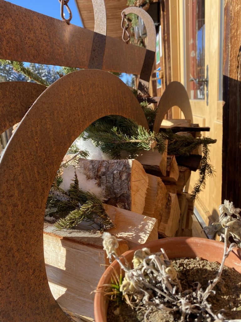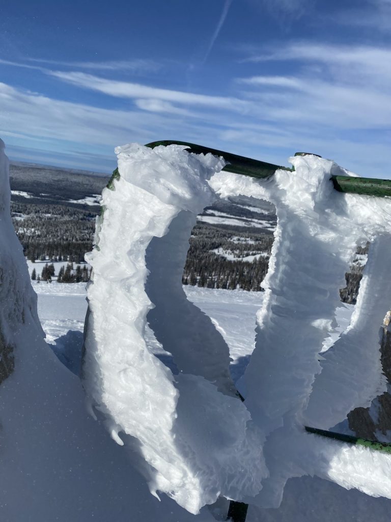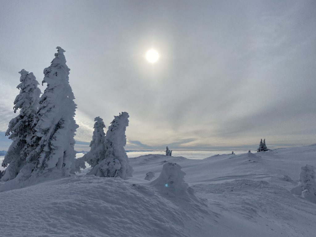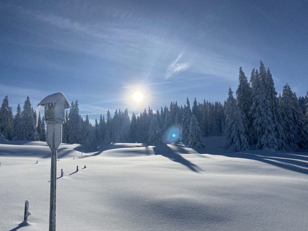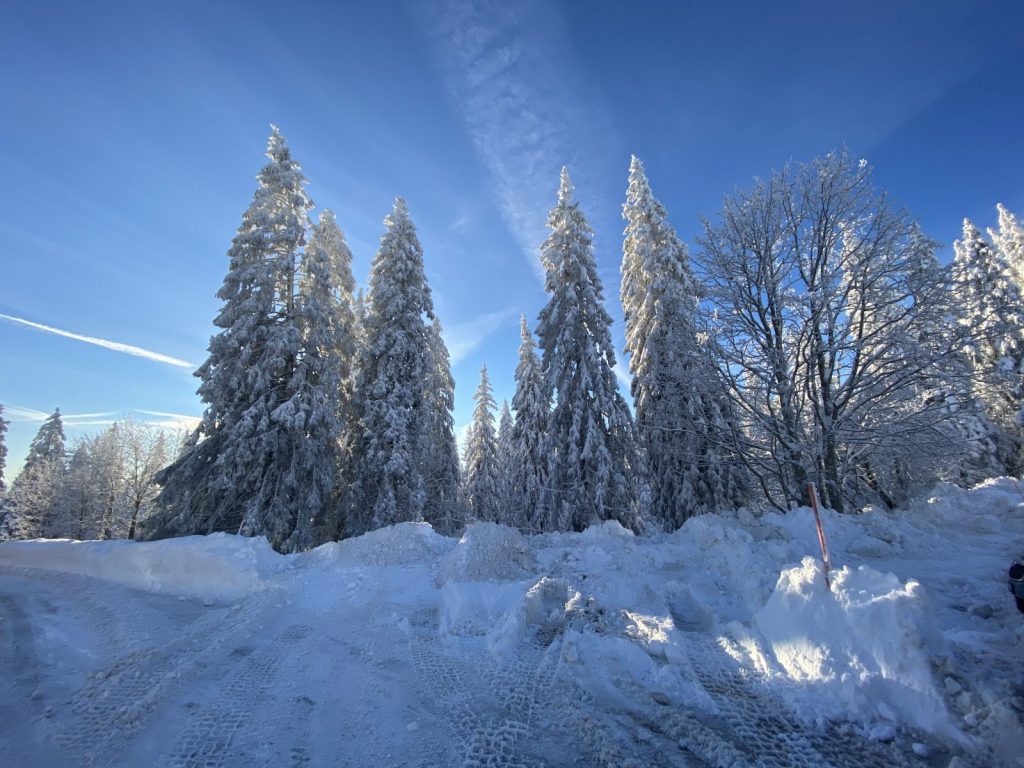 Nous avons pris quelques libertés avec le tracé officiel d’été, en ligne droite par les mamelons et les vallons ce qui a probablement ajouté du dénivelé et de l’effort dans la haute neige et tellement de plaisir et de rires aussi. Les sapins et les arbres étaient encore tout décorés de givre et c’est comme si des personnages étaient perchés à leur sommet.