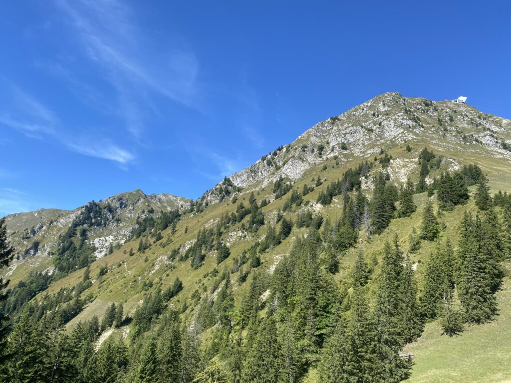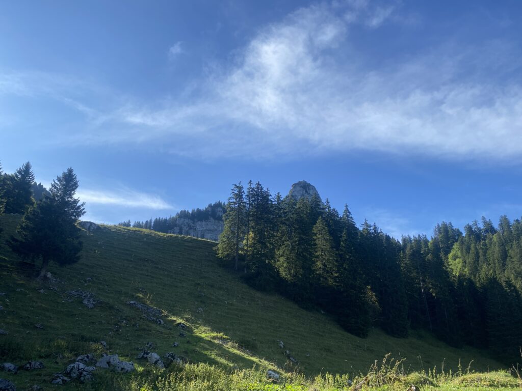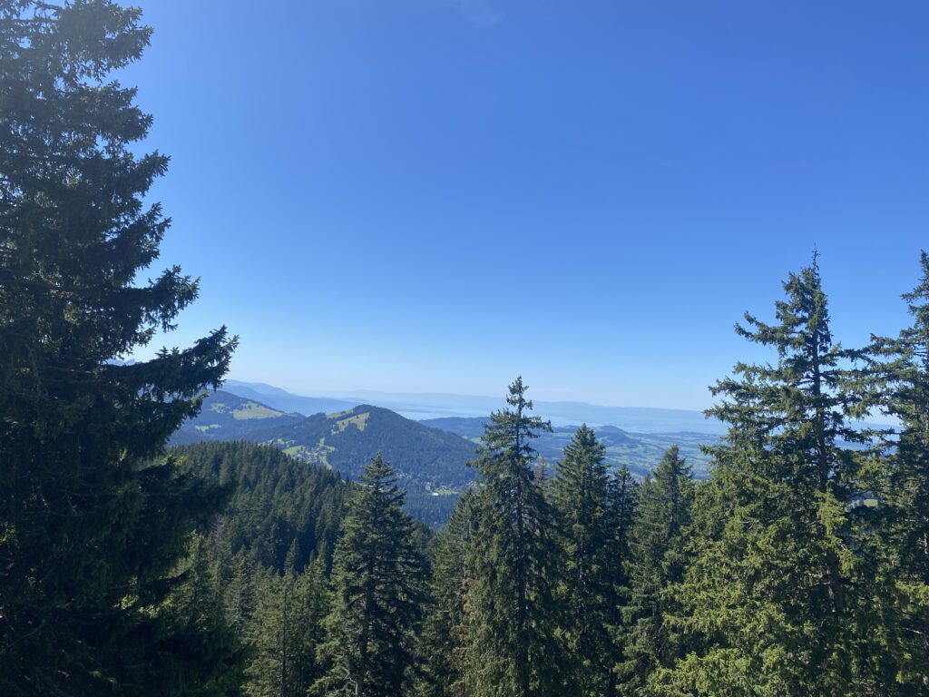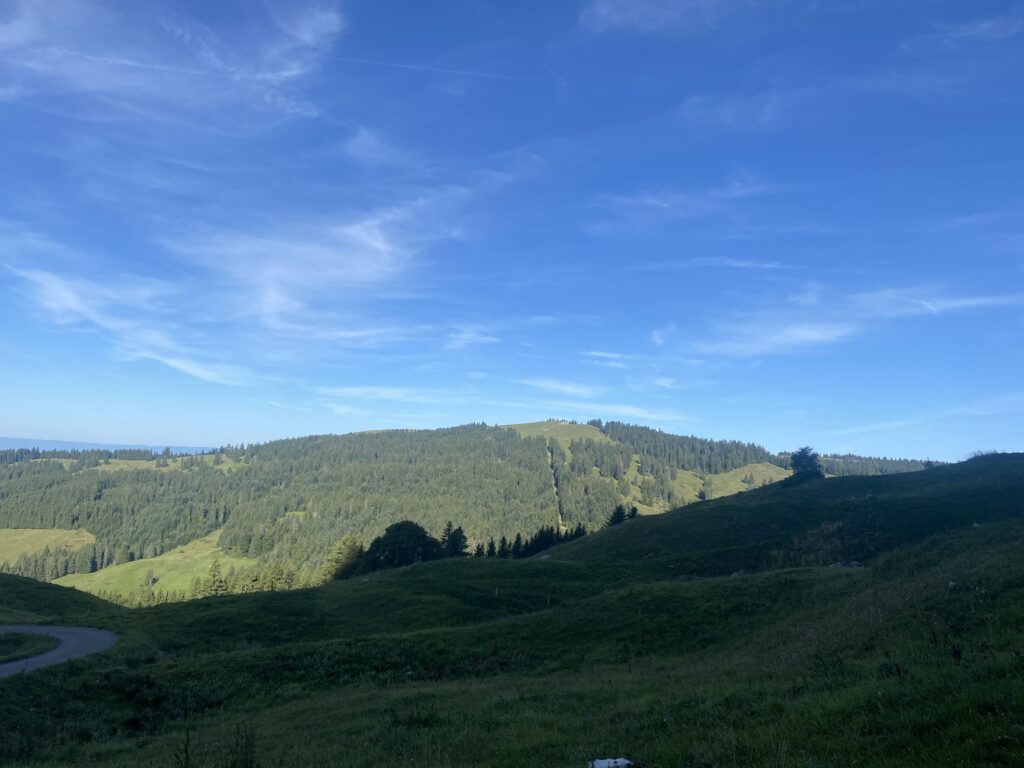 Alors bien sûr, je monte à nouveau, il y a peu de monde dans cette partie, je passe les Moilles, une autre buvette, ensuite Belle Chaux et me trouve maintenant au-dessus des Paccots et de la buvette du Vuipay. Les nombreuses voitures m’indiquent que là aussi ça doit afficher complet. Une traversée à flanc de coteau, dans les pâturages et la forêt et j’arrive au départ du chemin pour Teysachaux. J’avais fait le tour dans l’autre sens en 2021 et ajouté la grimpette à Teysachaux. Aucun risque que je récidive aujourd’hui (sourire). Depuis là, c’est facilement que je rejoins mon point de départ.