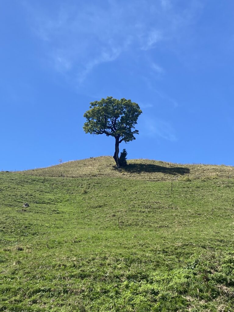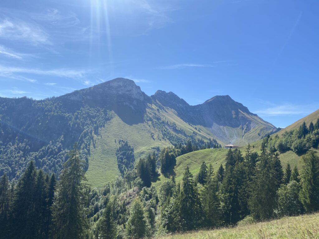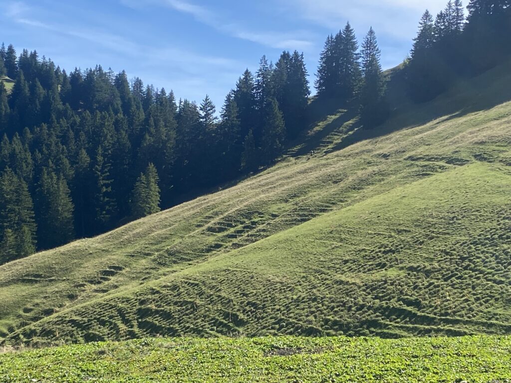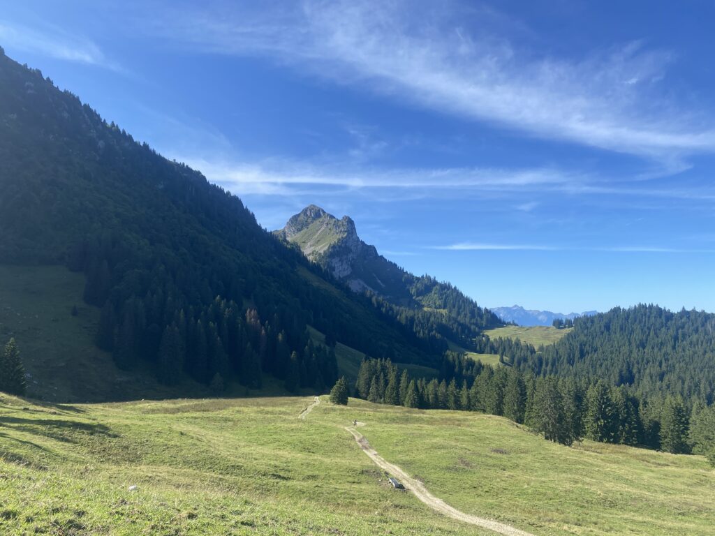 Alors bien sûr, je monte à nouveau, il y a peu de monde dans cette partie, je passe les Moilles, une autre buvette, ensuite Belle Chaux et me trouve maintenant au-dessus des Paccots et de la buvette du Vuipay. Les nombreuses voitures m’indiquent que là aussi ça doit afficher complet. Une traversée à flanc de coteau, dans les pâturages et la forêt et j’arrive au départ du chemin pour Teysachaux. J’avais fait le tour dans l’autre sens en 2021 et ajouté la grimpette à Teysachaux. Aucun risque que je récidive aujourd’hui (sourire). Depuis là, c’est facilement que je rejoins mon point de départ.