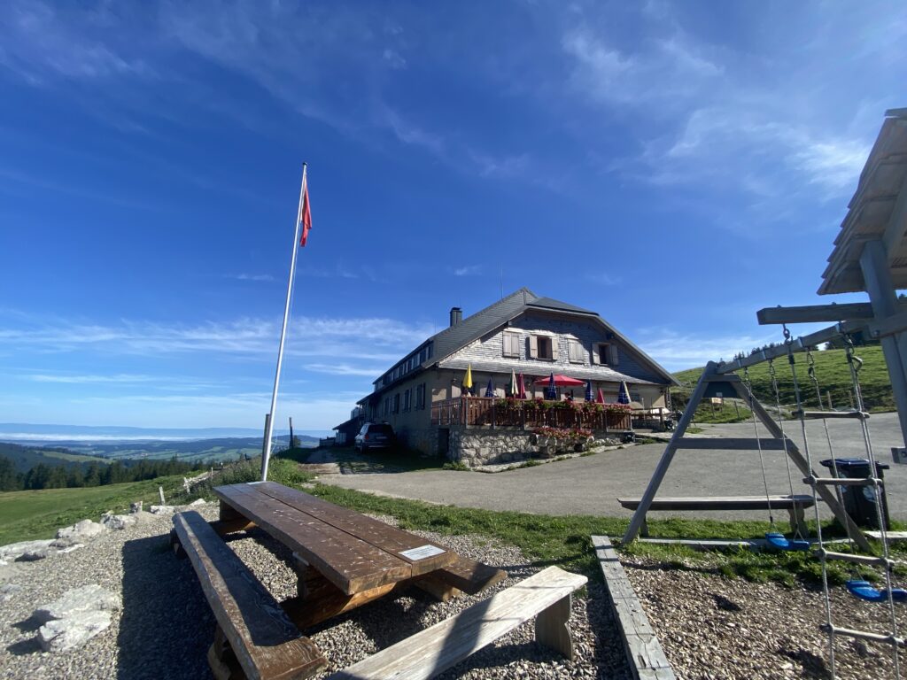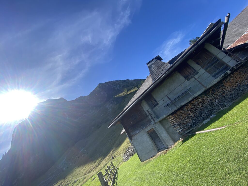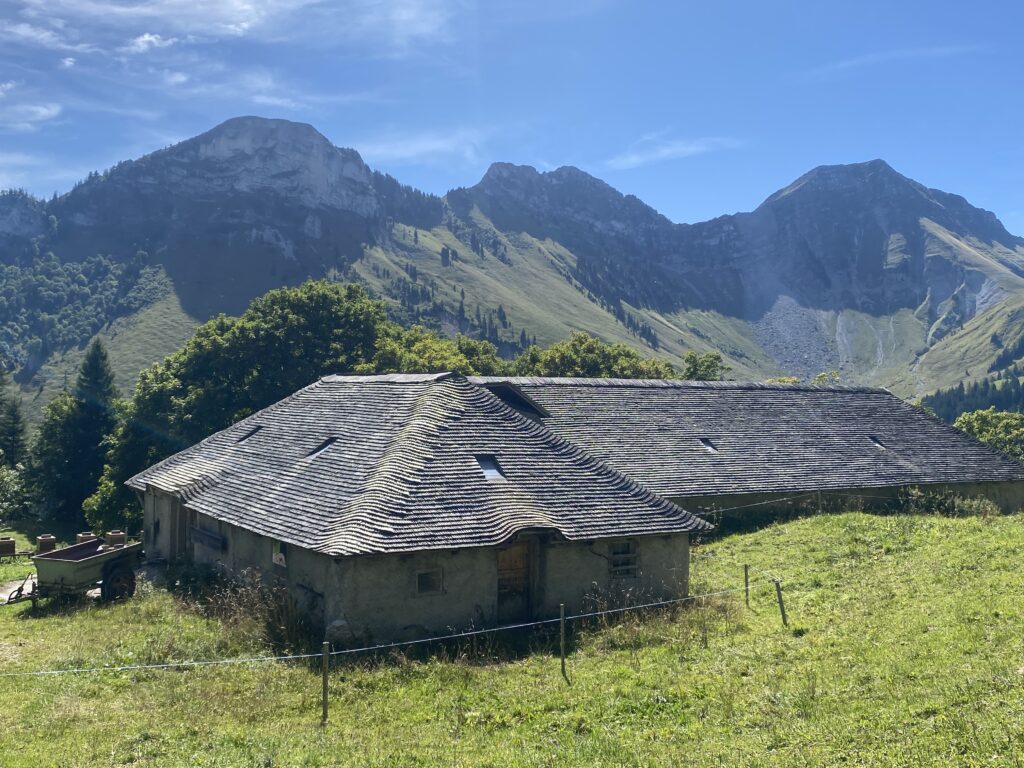 Gros Moléson est une bifurcation qui permet de monter au sommet, de retourner sur Plan Françey, Moléson Village ou de rejoindre la Vudalla. Autant dire qu’il y a de nombreuses possibilités de randonnées variées. Je descends à travers la forêt et croise une vétéiste dans l’autre sens qui pousse son vélo, quel courage. J’arrive à Challa, une autre buvette. Il est presque midi, je m’arrête pour manger un en-cas sans m’attarder, en effet, toutes les tables sont réservées.